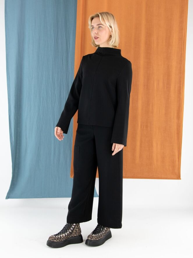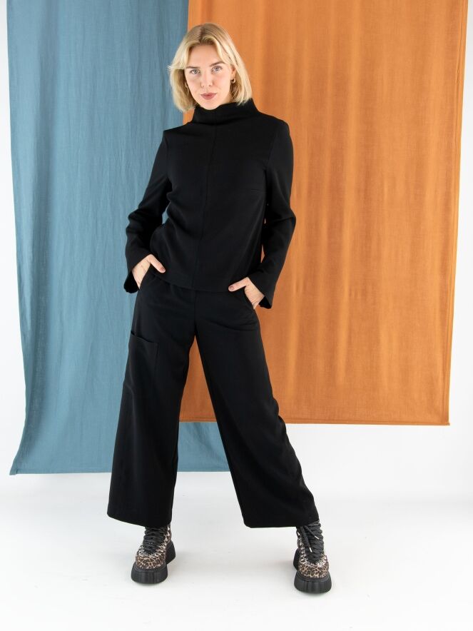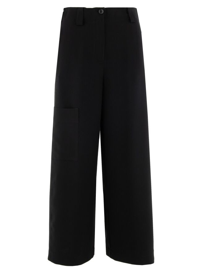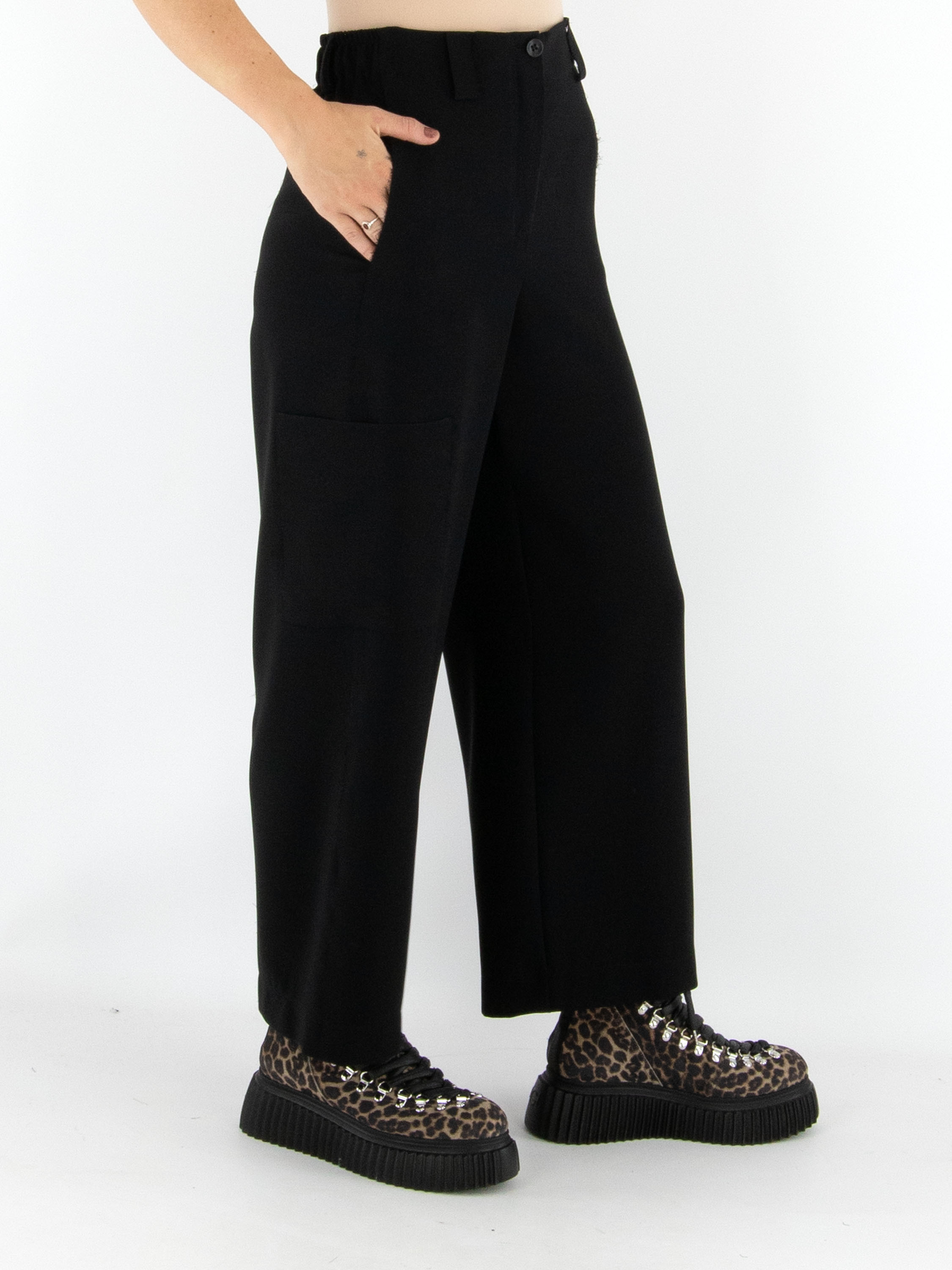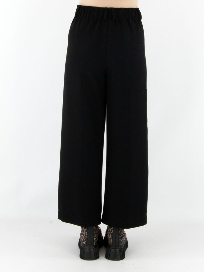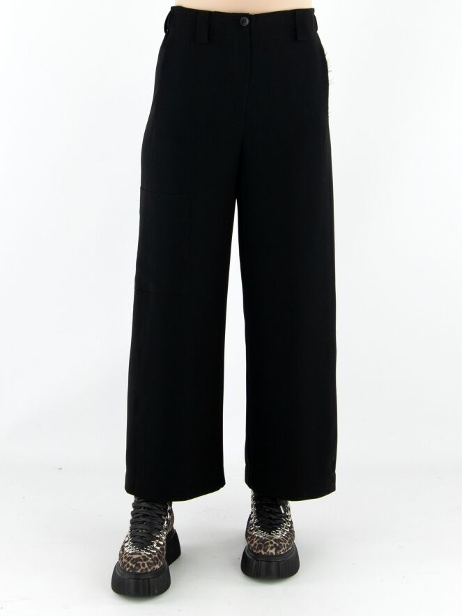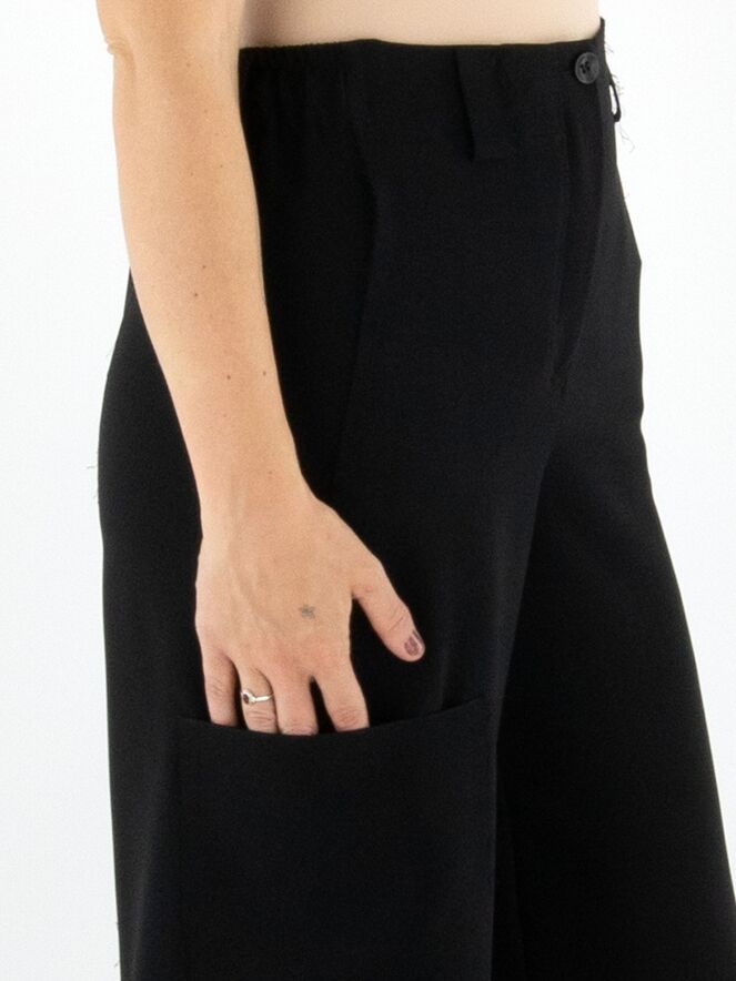 Un pantalon cargo design d’Annette Görtz dans une teinte noire luxueuse. À la taille, des bandes élastiques finement plissées sont intégrées sur les côtés. Le pantalon possède des poches fendues et une poche supplémentaire sur la cuisse droite. Les coutures latérales légèrement effilochées confèrent au pantalon une allure moderne et décontractée. Ce pantalon peut être lavé à la main.
