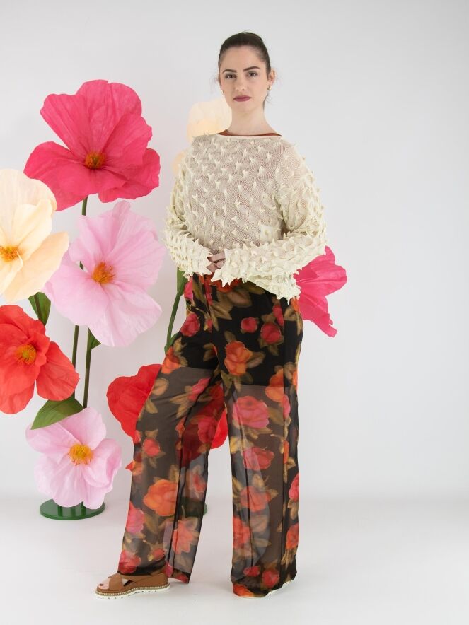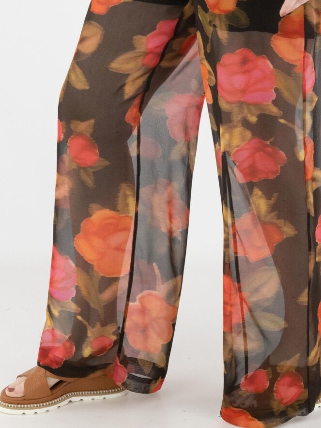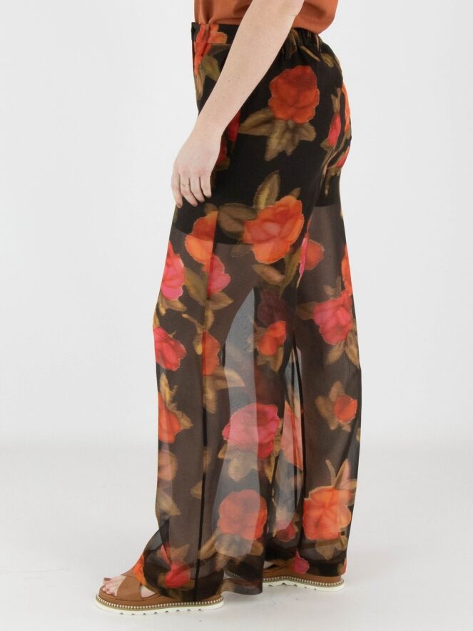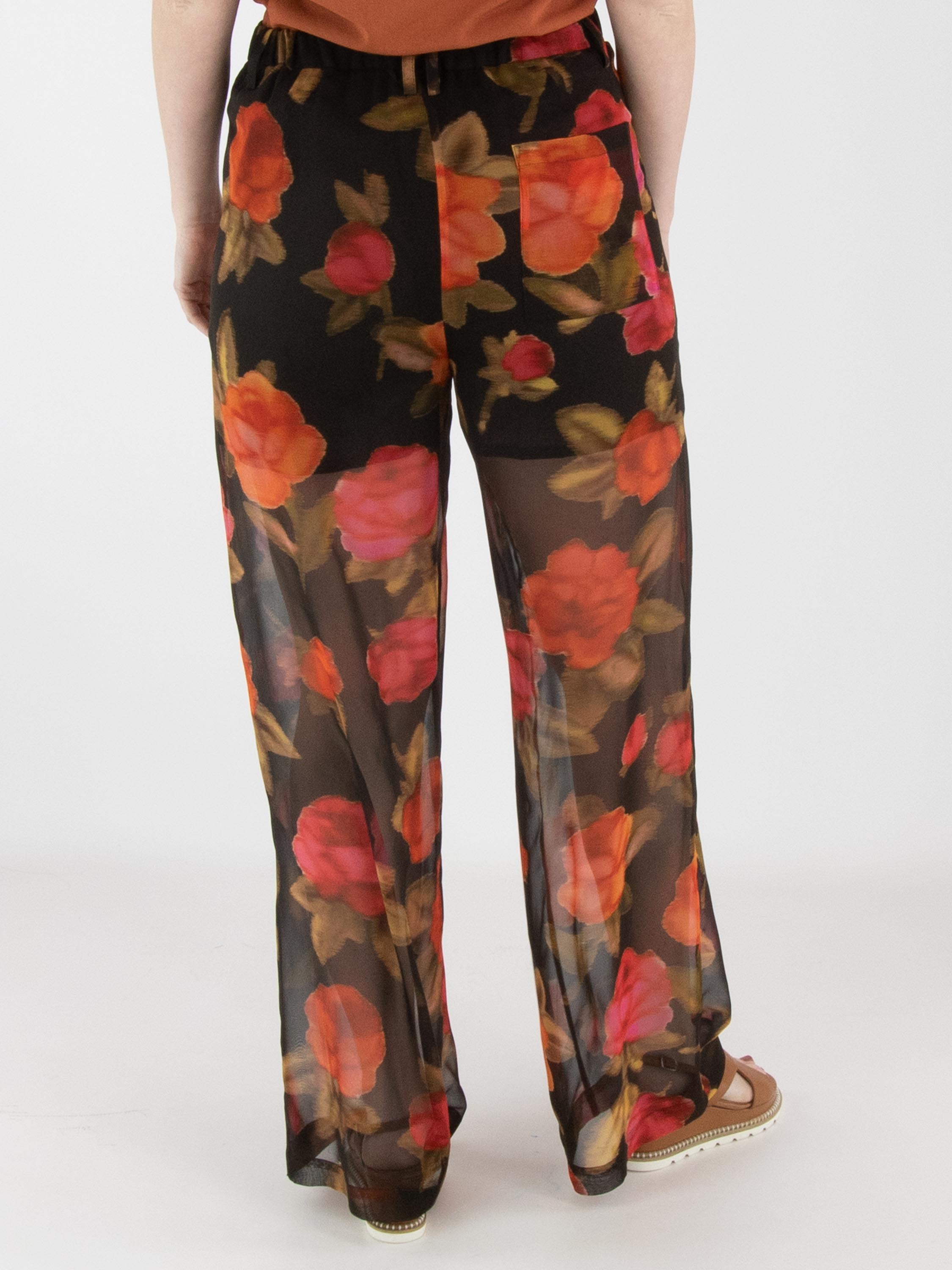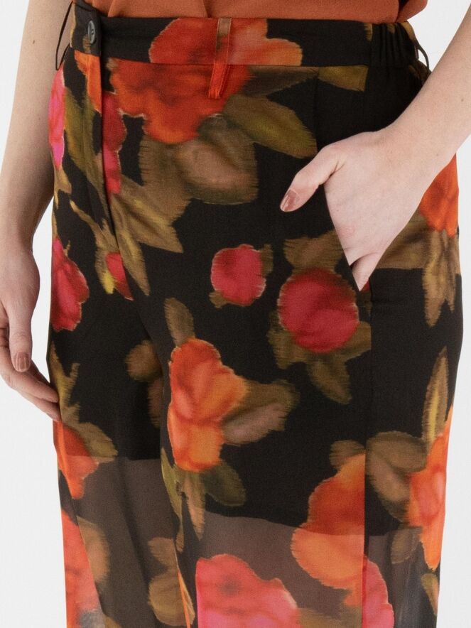 Un pantalon large et légèrement transparent d’Annette Görtz avec un imprimé floral dans plusieurs nuances de rouge et de fuchsia, associé à du vert olive sur un fond noir. Le pantalon est doublé jusqu’en haut de la cuisse. À l’arrière, la taille est dotée d’une bande élastique. Le pantalon possède des poches latérales et ne doit pas être lavé.