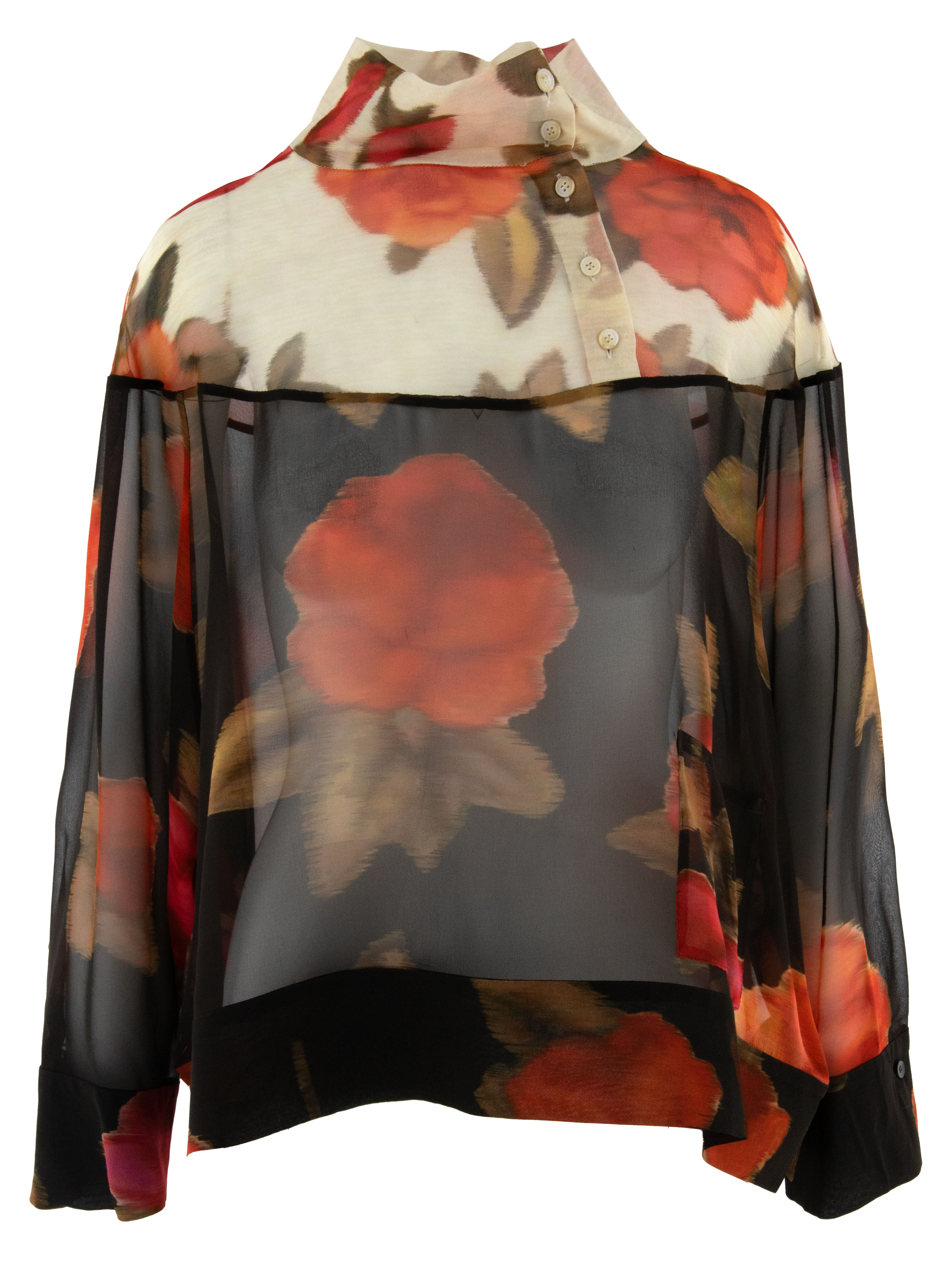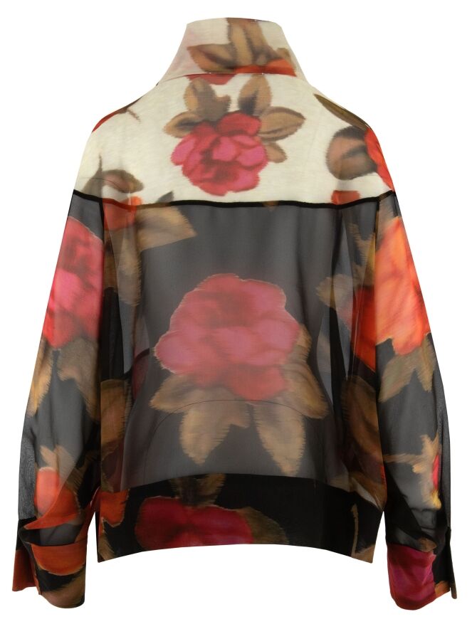 Une blouse luxueuse et transparente d’Annette Görtz avec un imprimé floral dans plusieurs nuances de rouge, de fuchsia et de vert olive. Au-dessus de la poitrine, le fond est beige, tandis qu’il devient noir sous la poitrine. La blouse est dotée de manches chauve-souris mi-longues et ne doit pas être lavée.