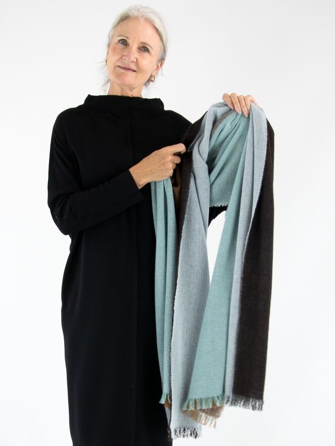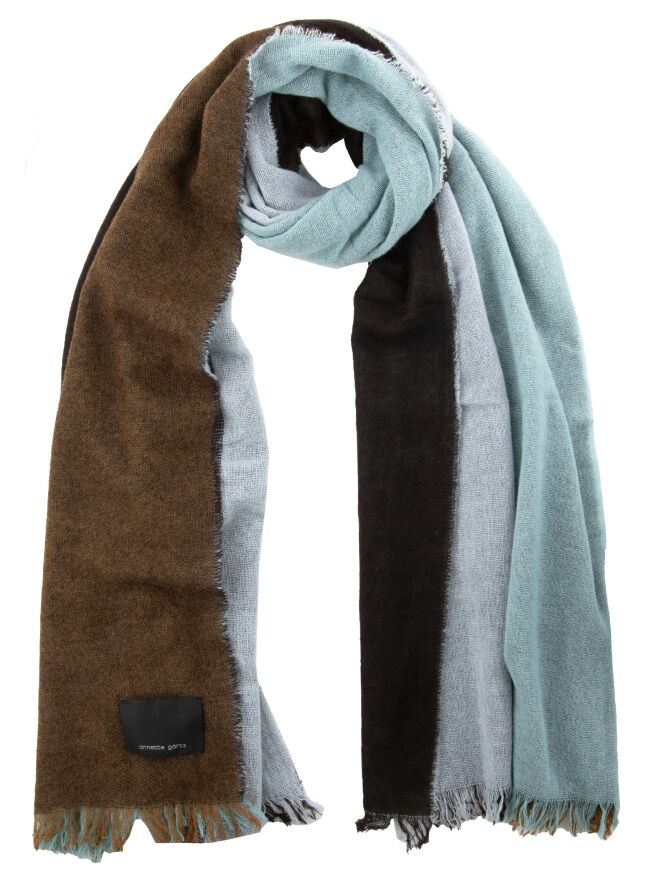 Un châle luxueux d’Annette Görtz décliné en aplats de couleur marron châtaigne, brun moka et turquoise. Au centre, une délicate structure à carreaux est subtilement tissée de fils métalliques argentés, offrant une brillance sophistiquée. Les extrémités sont finement effilochées pour une finition élégante. Ce châle ne doit pas être lavé.