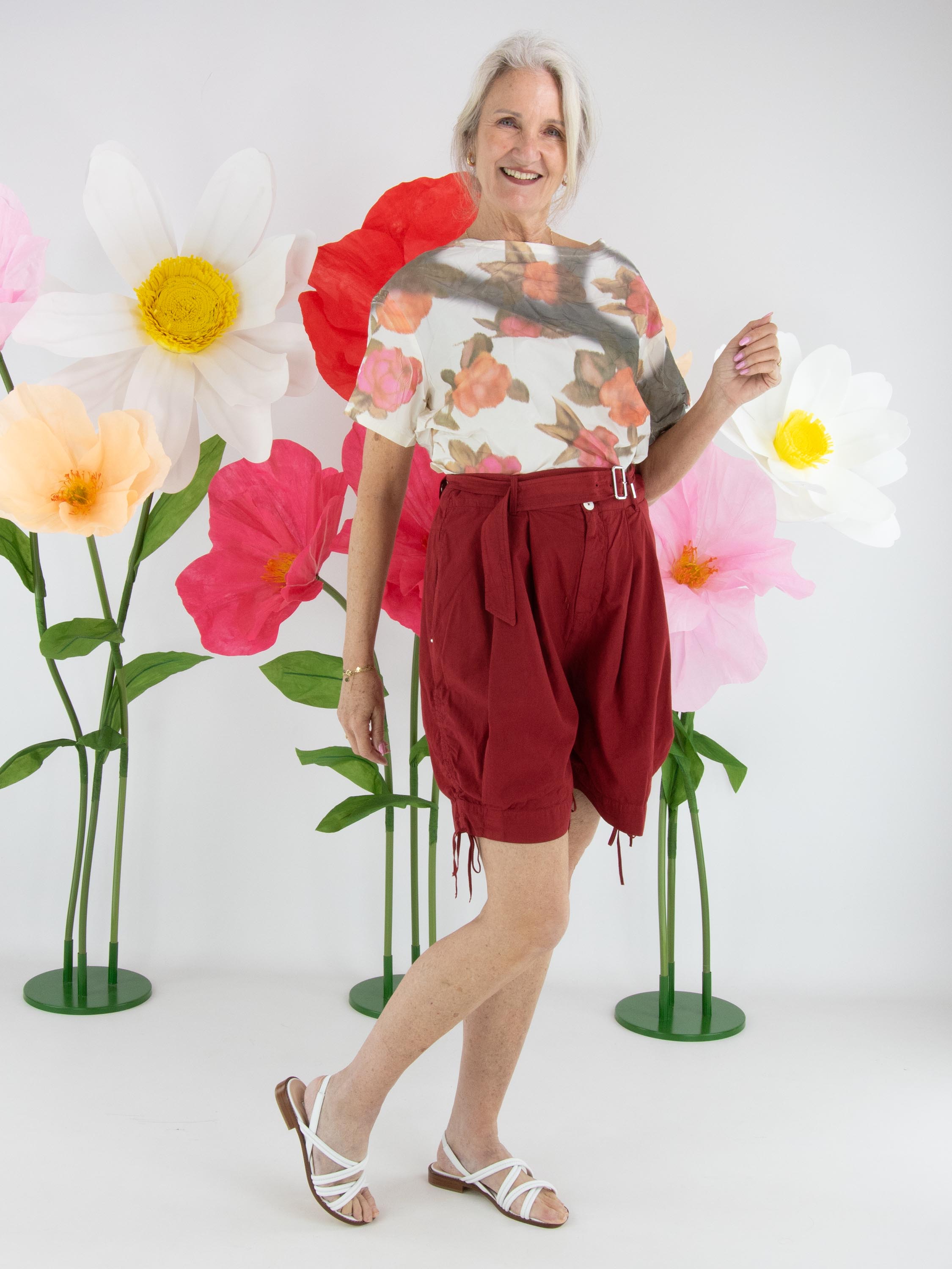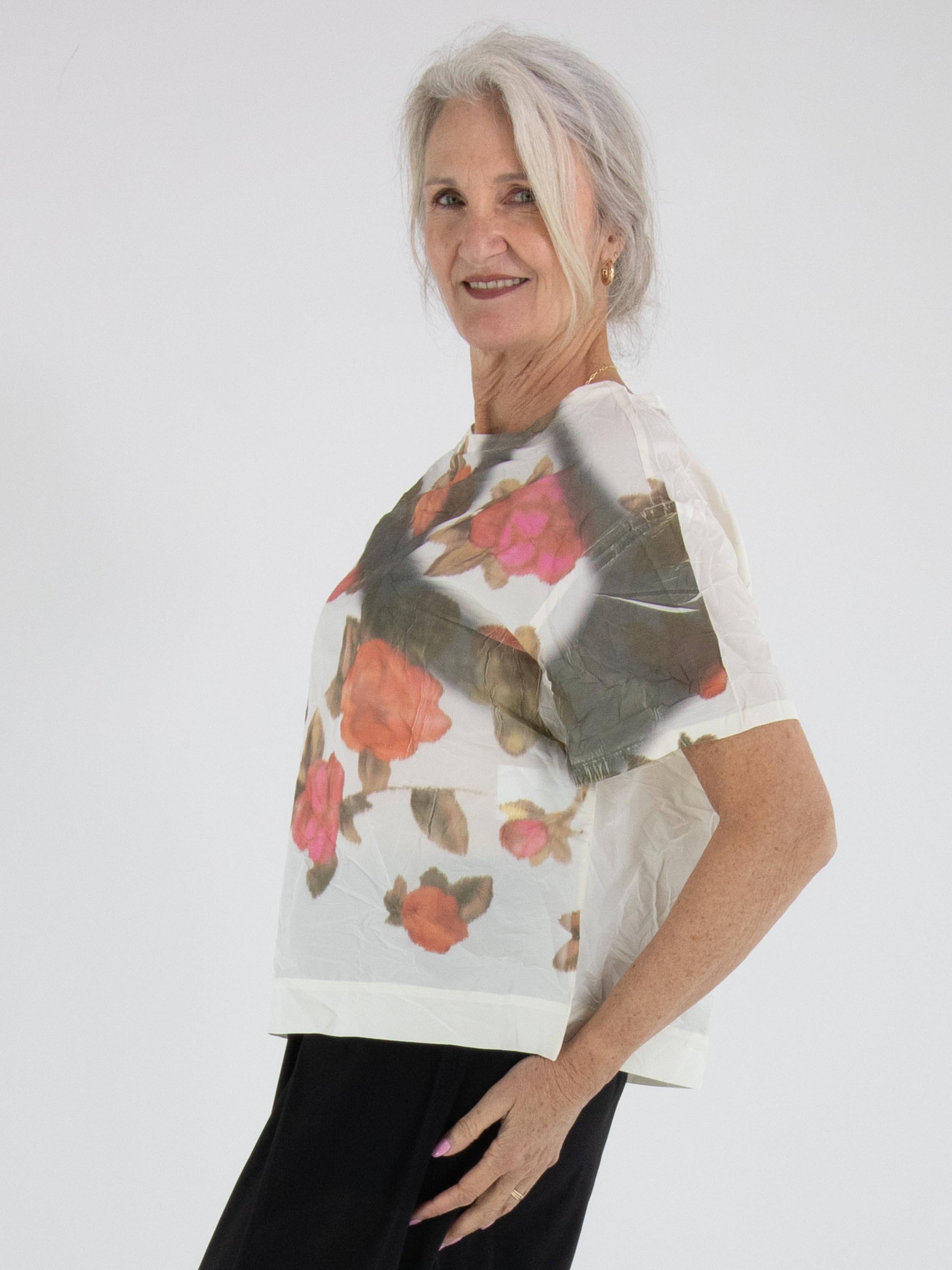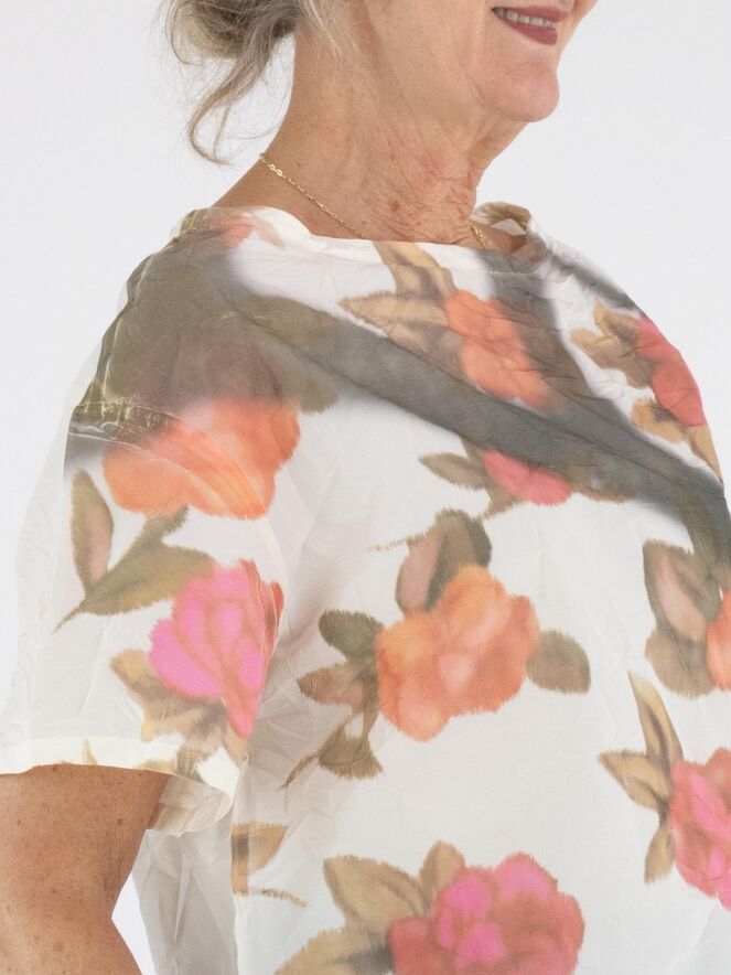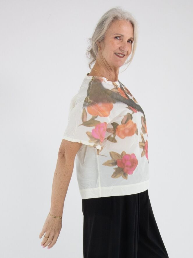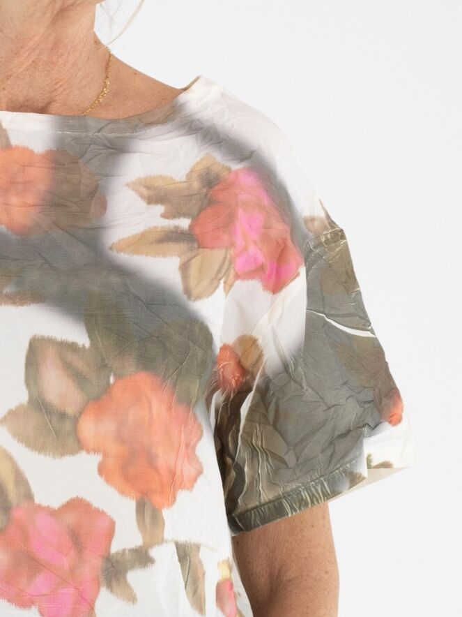 T-shirt de Annette Görtz avec un imprimé floral graphique multicolore sur fond blanc crème. Le tissu présente une texture légèrement froissée qui apporte une touche moderne et originale. Le modèle est doté d’un col rond, de manches courtes et peut être lavé à 30 degrés.