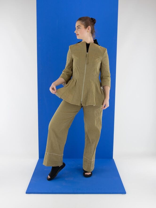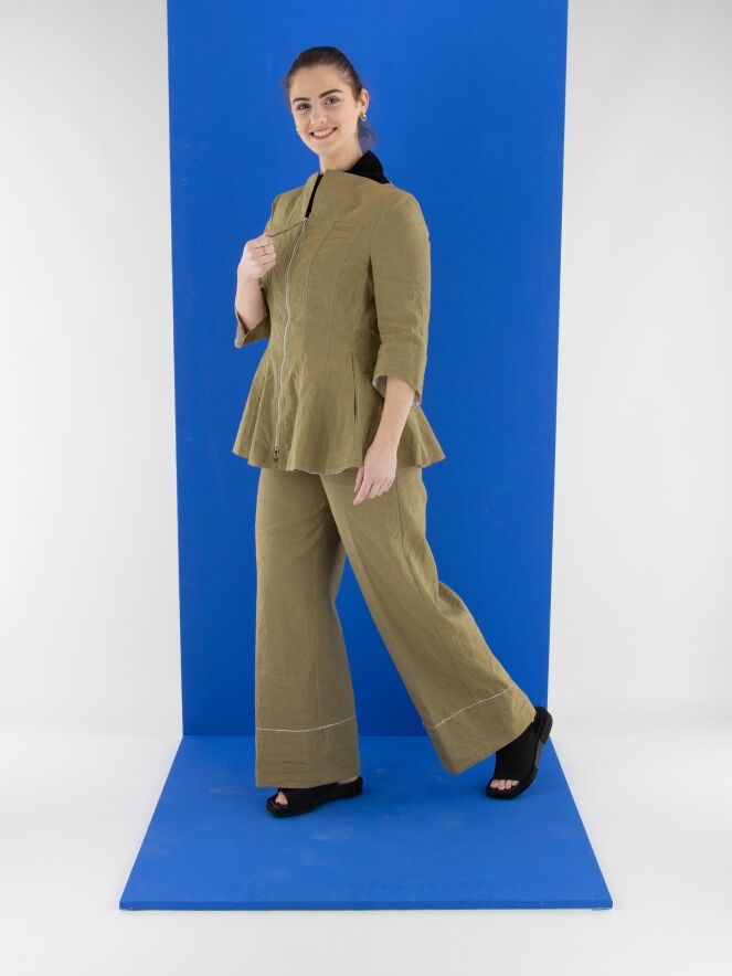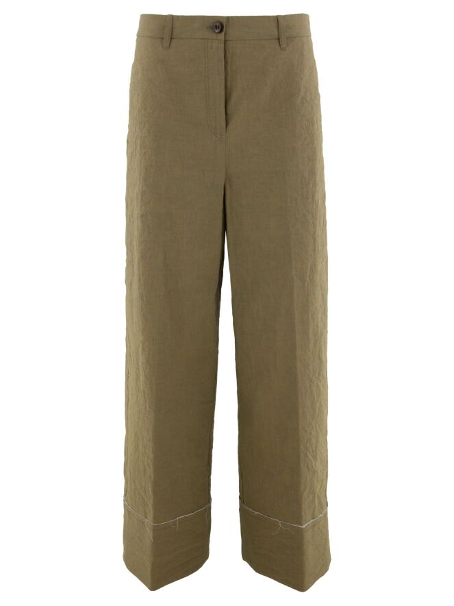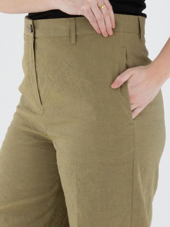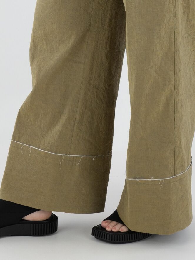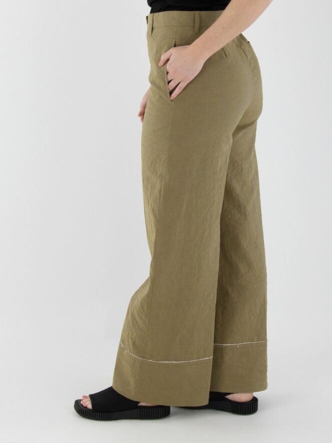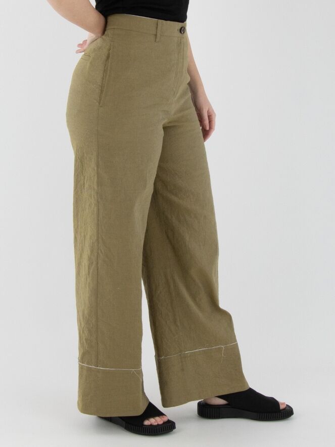 Un pantalon large d'Annette Görtz en vert olive. Le tissu est finement smocké. Une large bande au bas du pantalon est ornée d’un tissu blanc cassé finement effiloché le long de la couture. Ce pantalon peut être lavé à 30 degrés.