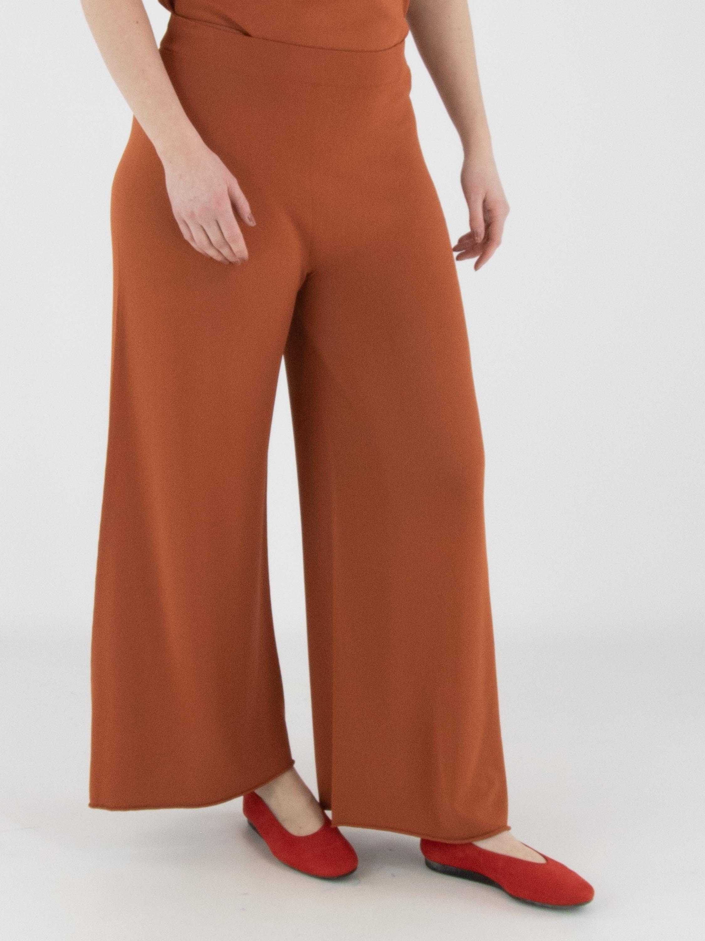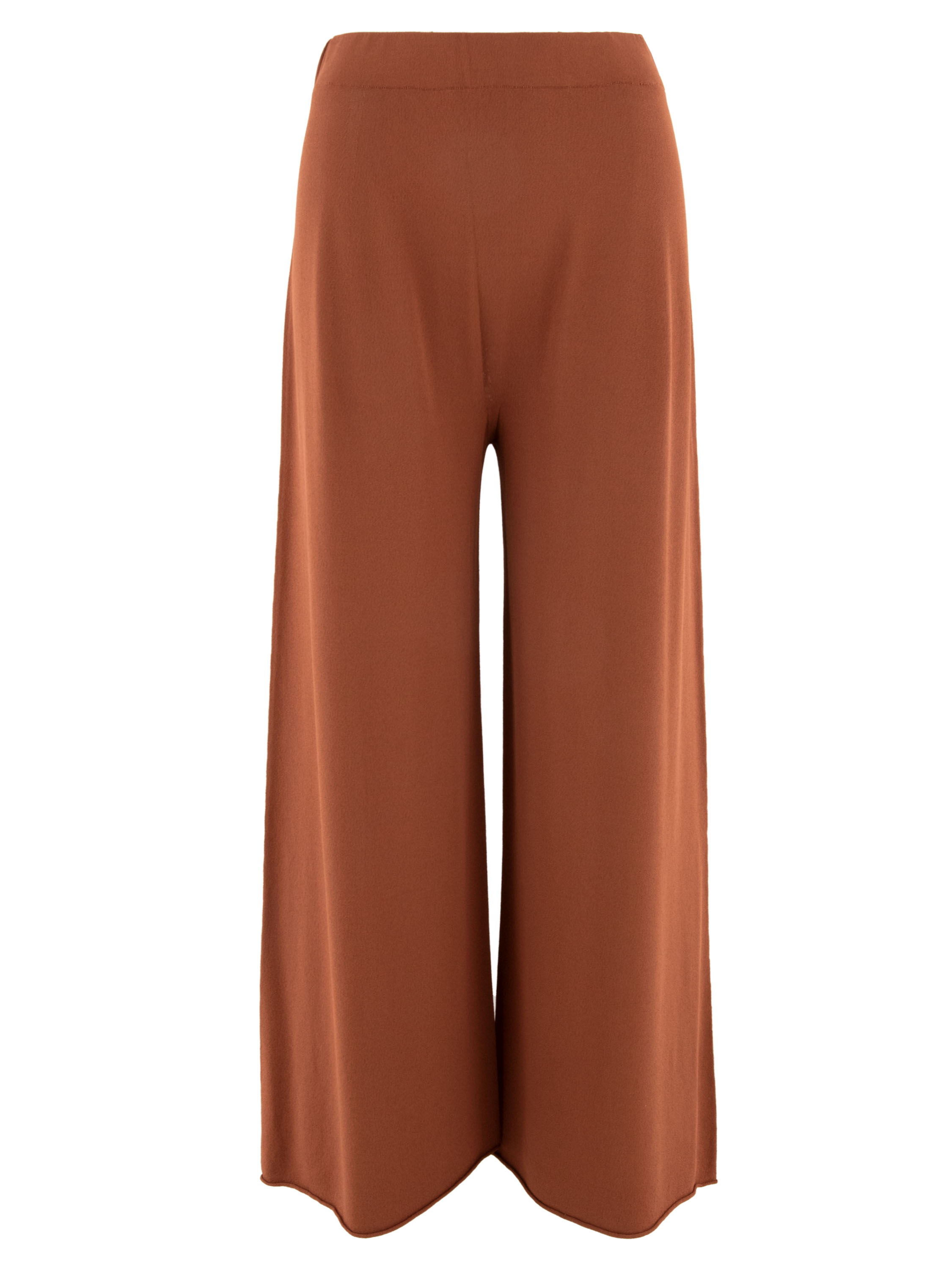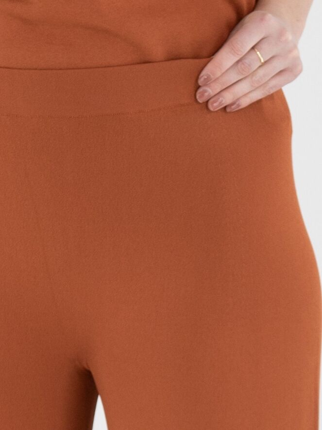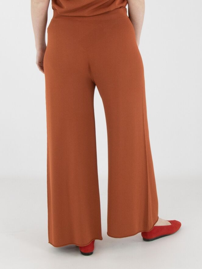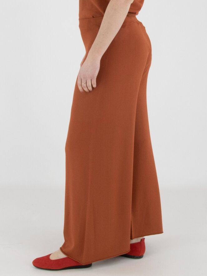 Un pantalon en maille fine à coupe large d’Annette Görtz dans une teinte brun rouille. La taille est dotée d’une ceinture élastique. Le bas des jambes est terminé par un bord roulotté. Ce pantalon peut être lavé à 30 degrés.