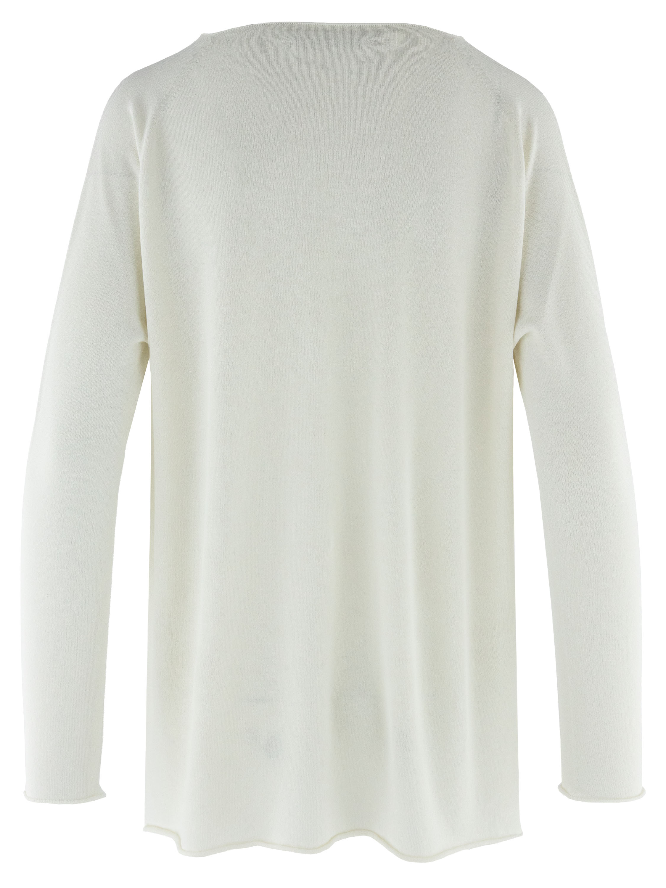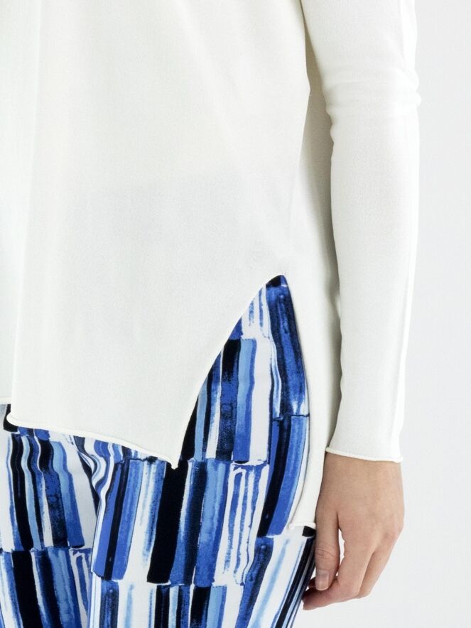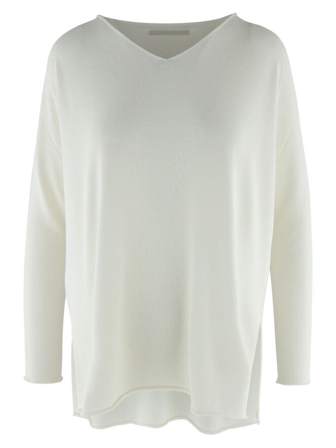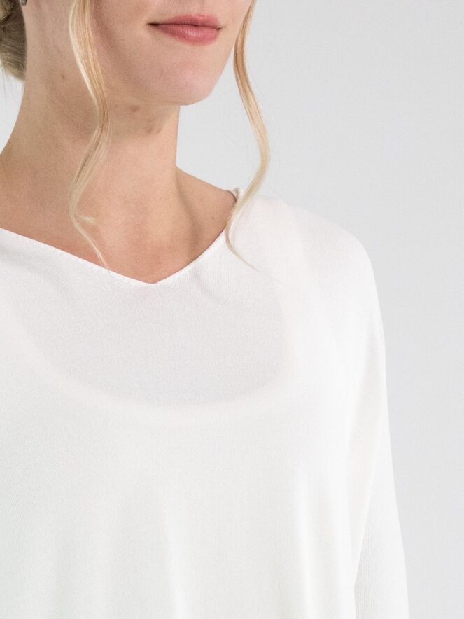 Un pull d’Annette Görtz en blanc crème. Le pull présente un décolleté en V et des manches longues. Des fentes sont placées de chaque côté en bas du modèle. Le bas et les extrémitités des manches sont finis par une bordure froncée. Ce pull peut être lavé à 30 degrés.