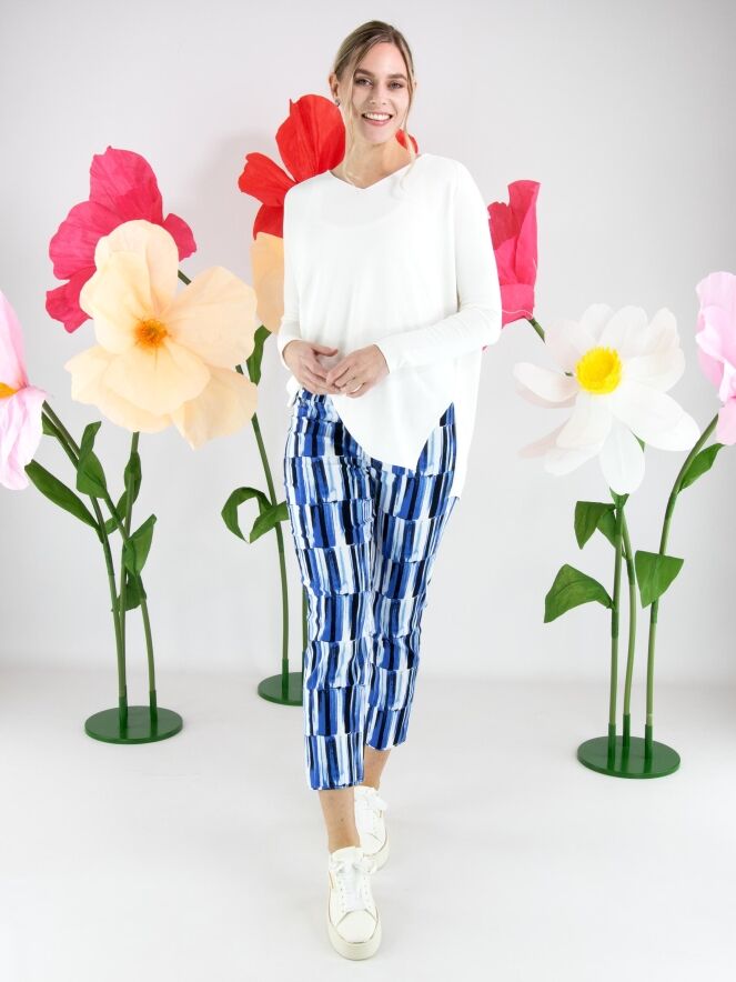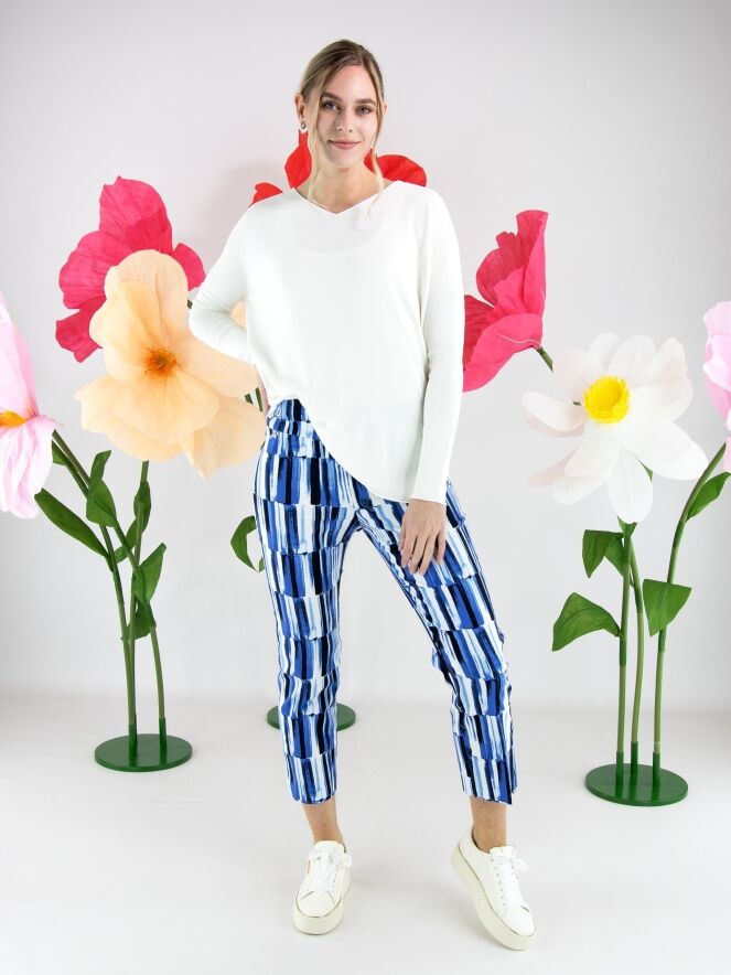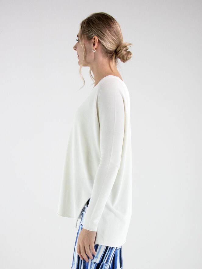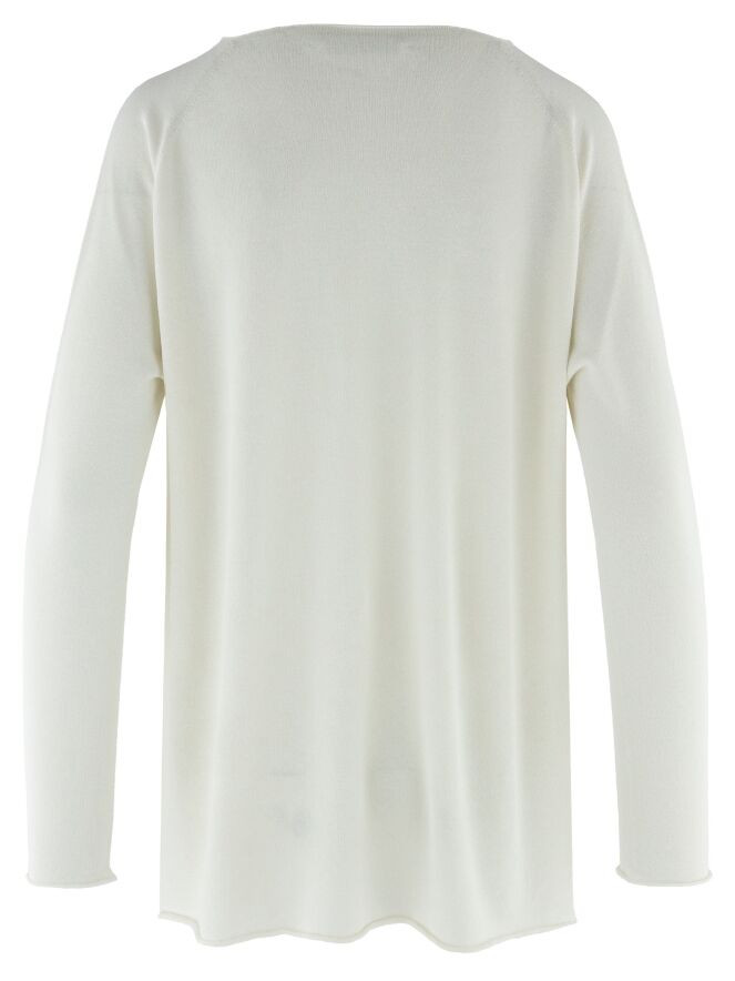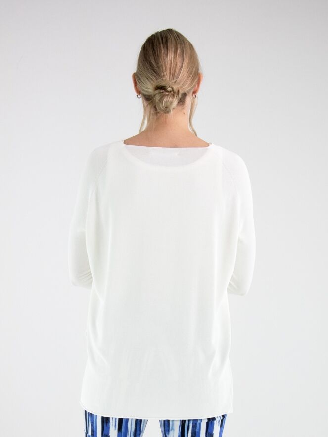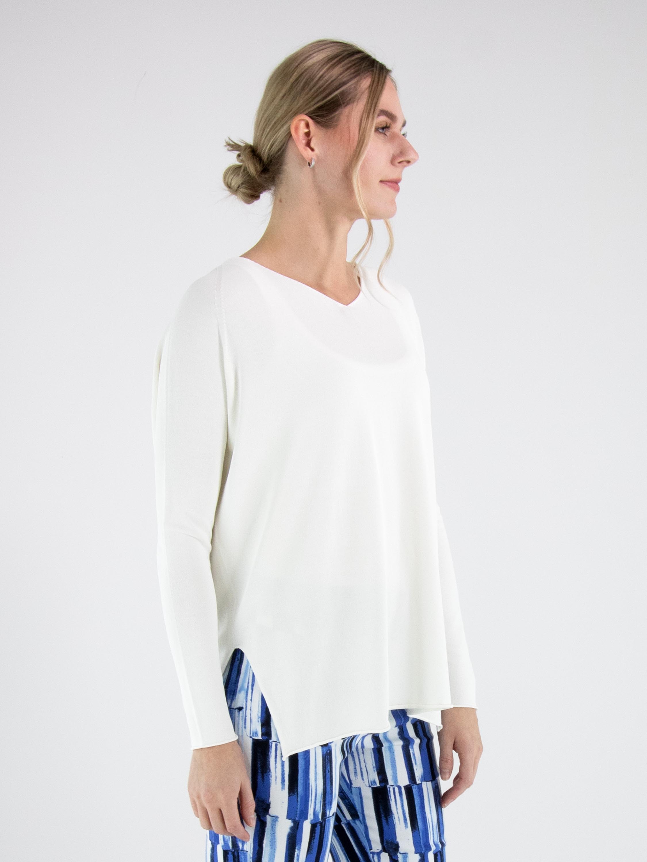 Un pull d’Annette Görtz en blanc crème. Le pull présente un décolleté en V et des manches longues. Des fentes sont placées de chaque côté en bas du modèle. Le bas et les extrémitités des manches sont finis par une bordure froncée. Ce pull peut être lavé à 30 degrés.