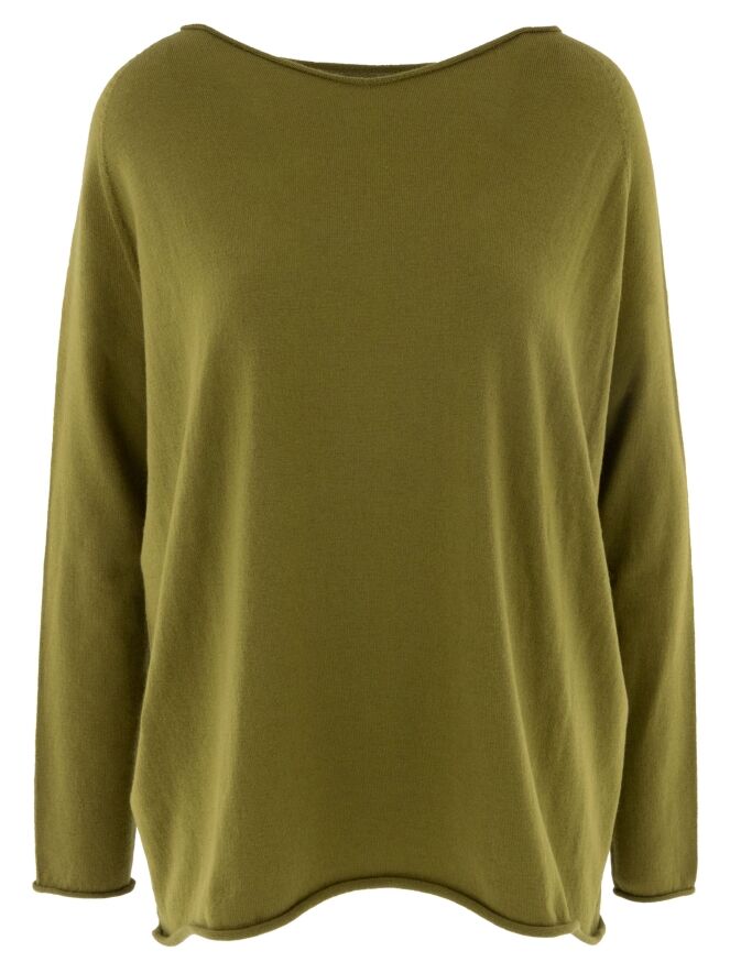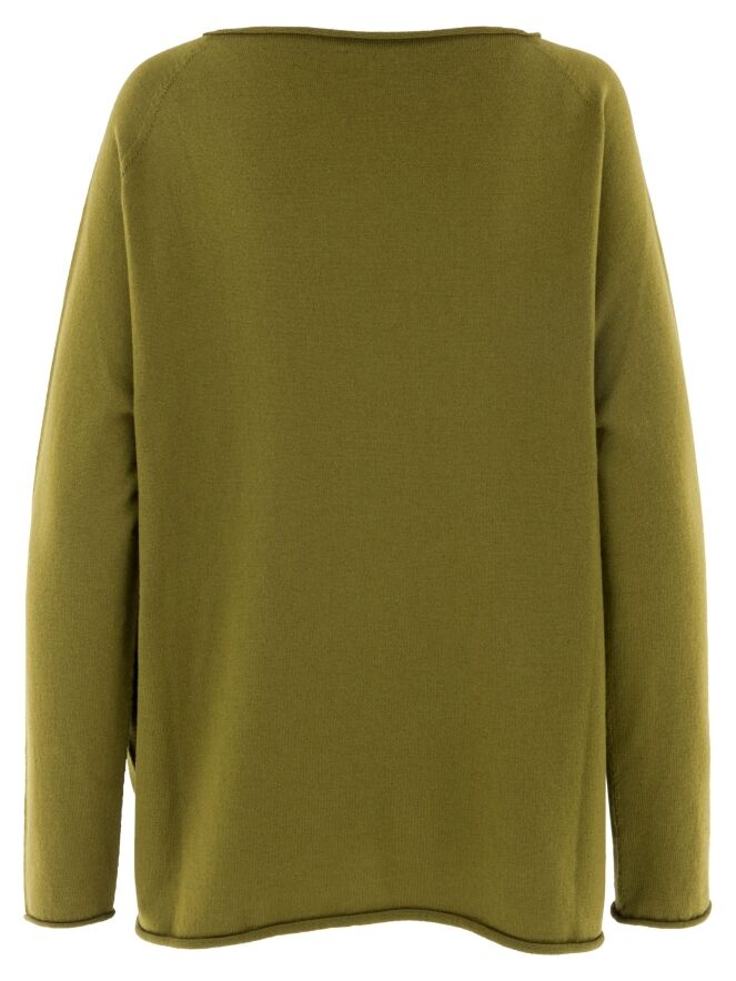 Pull ample de la marque Annette Görtz dans un vert olive éclatant. Les bords de l'encolure ronde, du bas et des manches longues sont roulottés. Ce pull doit être lavé à la main.