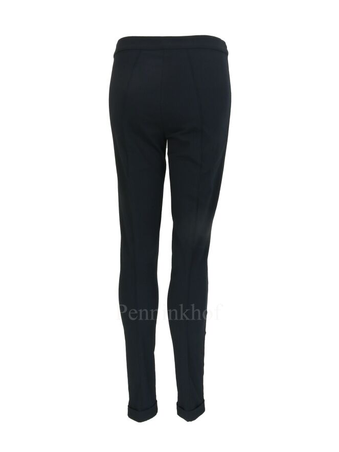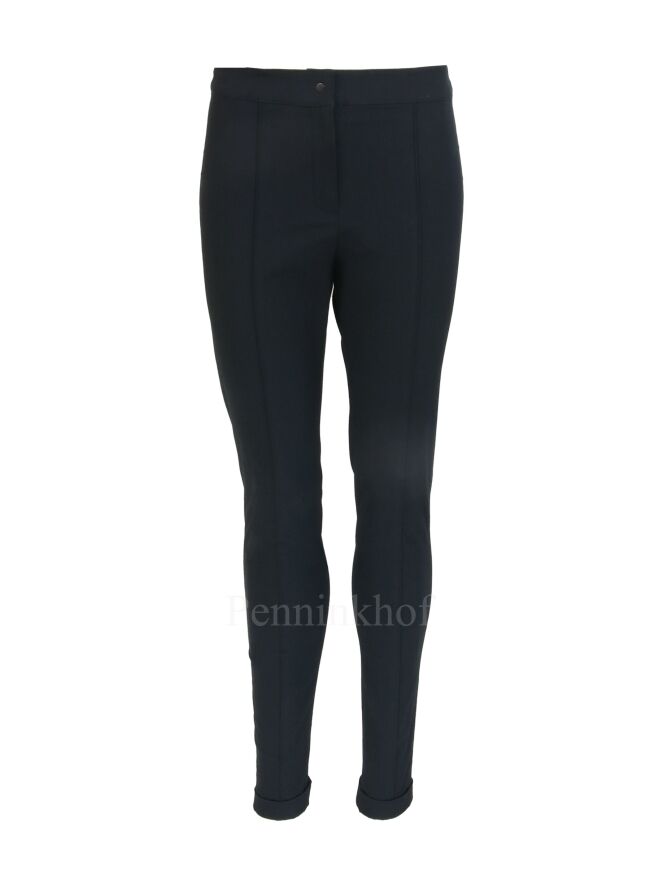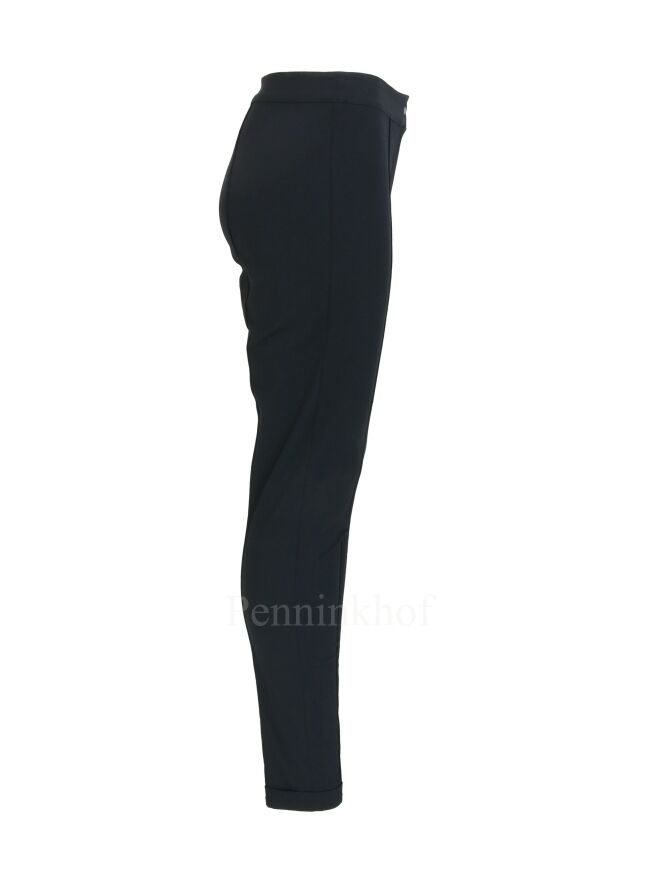 Pantalon de la marque Annette Görtz. Le tissu de structure en crêpe gaufré est de couleur noire. Il est orné d'une couture cousue au milieu des jambes avant et arrière et d'un petit revers au bas des jambes. Lavage à 30 degrés.