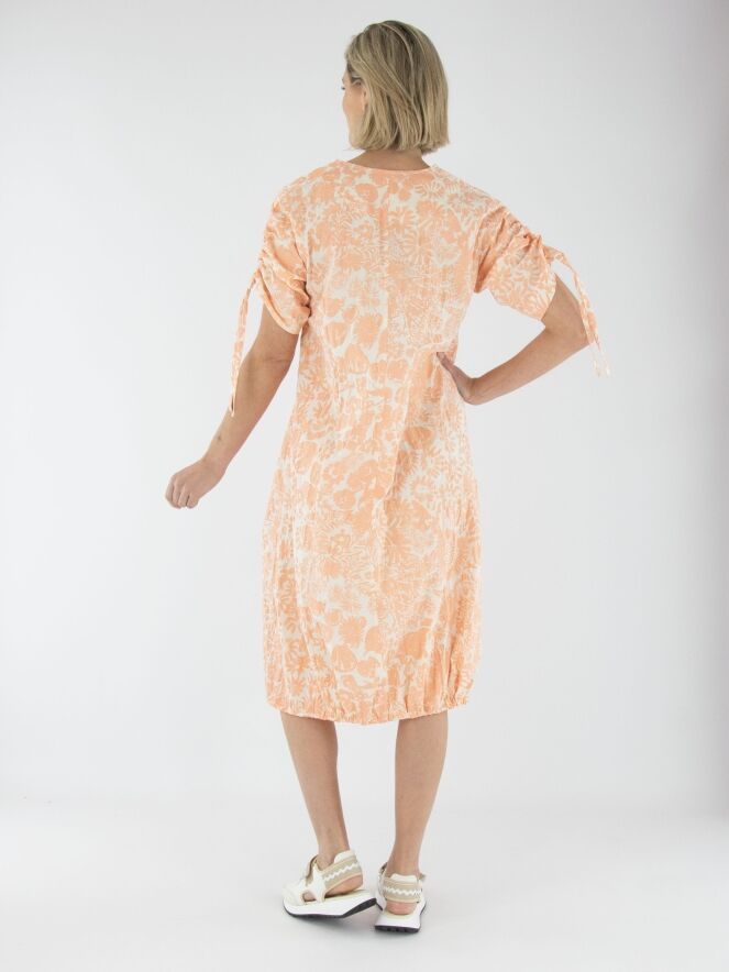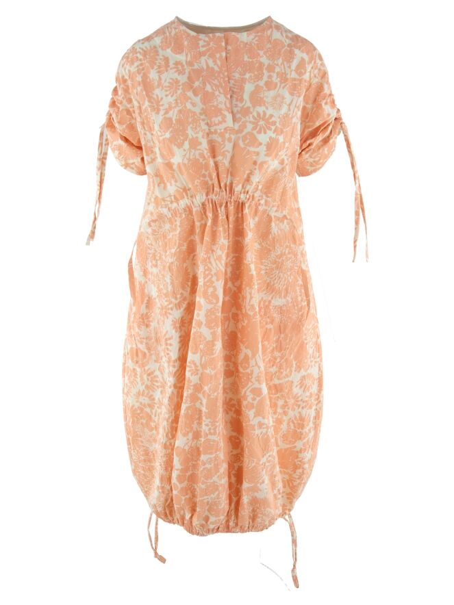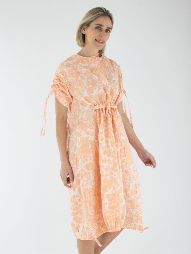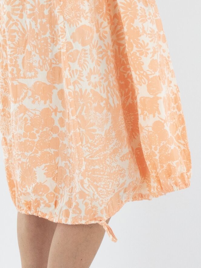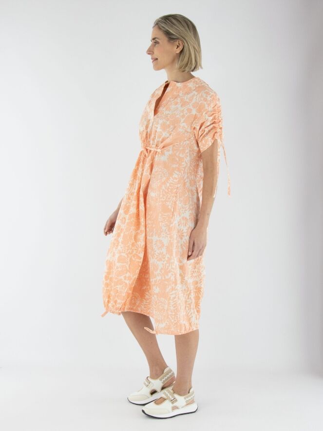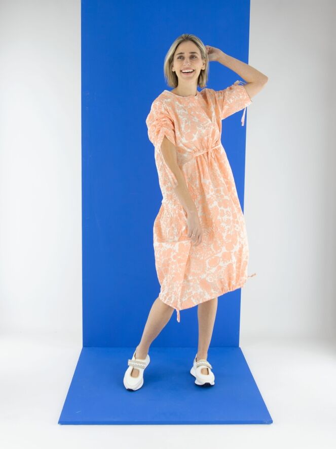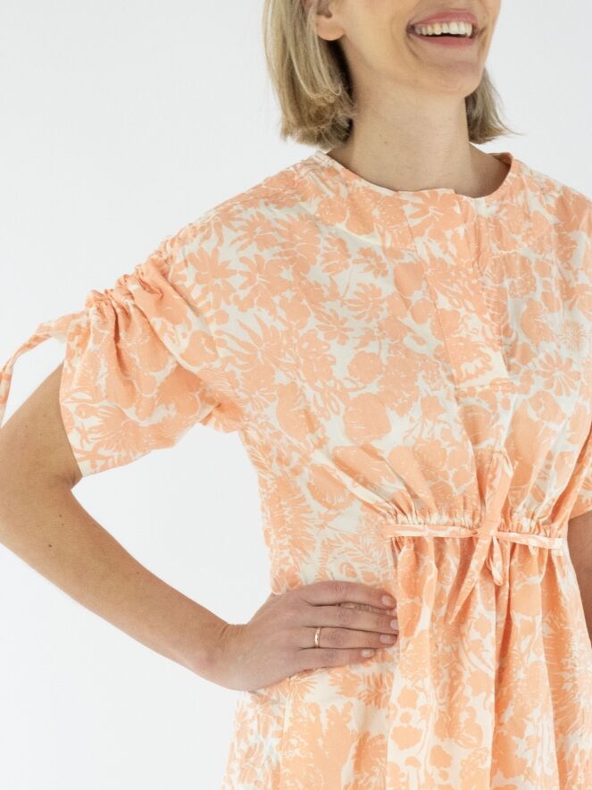 Une robe d'Annette Görtz avec un imprimé floral inspiré de Matisse en orange pastel sur un fond blanc crème. Dans la couture supérieure des manches courtes, un cordon inséré dans une couture tunnel permet de créer un effet plissé. Au centre de l'encolure ronde, une découpe en V descend juste au-dessus de la poitrine. Sous la poitrine, une couture avec un cordon en tunnel est présente. Depuis la taille, la robe prend une légère forme ballon. L’ourlet comporte également un cordon en tunnel qui peut être ajusté. Cette robe peut être lavée à 30 degrés.