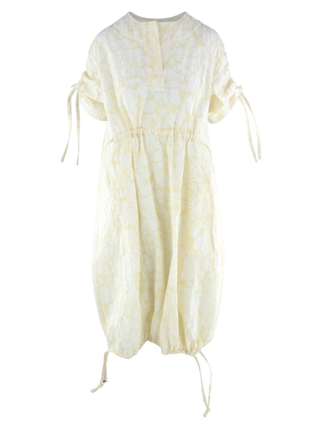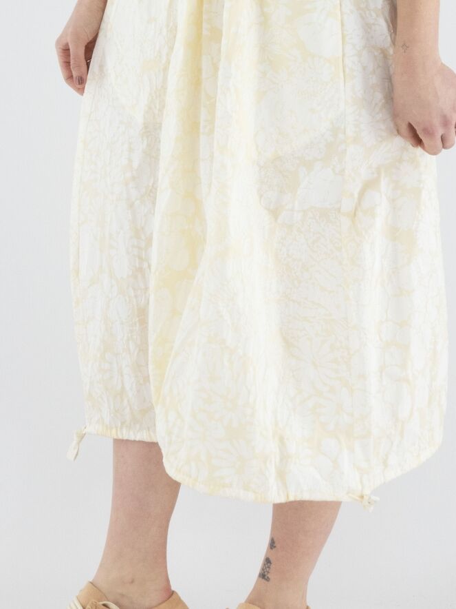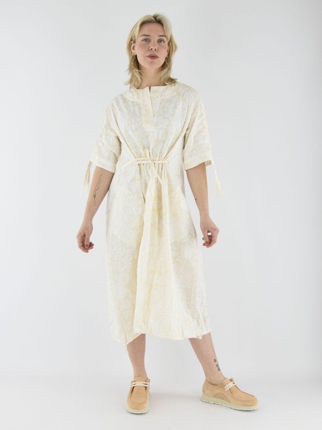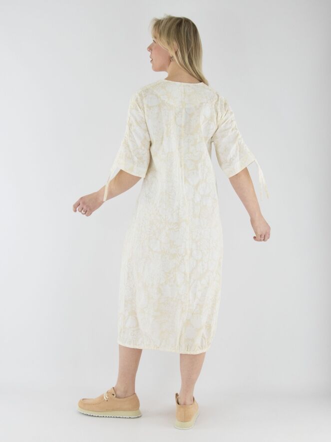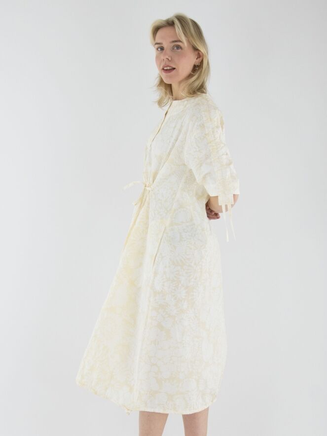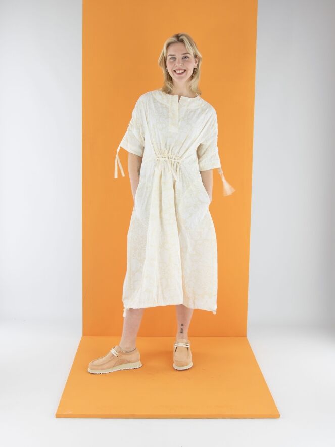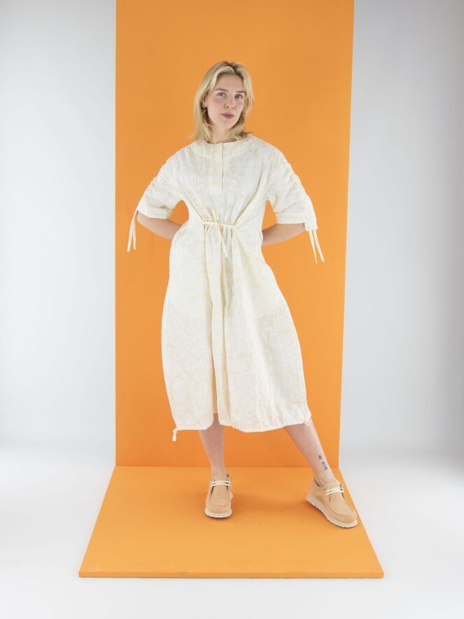 Une robe d'Annette Görtz avec un imprimé floral inspiré de Matisse en blanc crème sur un fond blanc. La couture supérieure des manches courtes intègre un cordon dans une finition tunnel, créant un effet plissé. Au centre de l'encolure ronde, une découpe en V descend juste au-dessus de la poitrine. Sous la poitrine, une couture avec un cordon inséré dans une couture tunnel apporte une touche de structure. Depuis la taille, la robe adopte une silhouette légèrement ballon. L’ourlet est également doté d’un cordon dans une finition tunnel, permettant d’ajuster la coupe. Cette robe peut être lavée à 30 degrés.