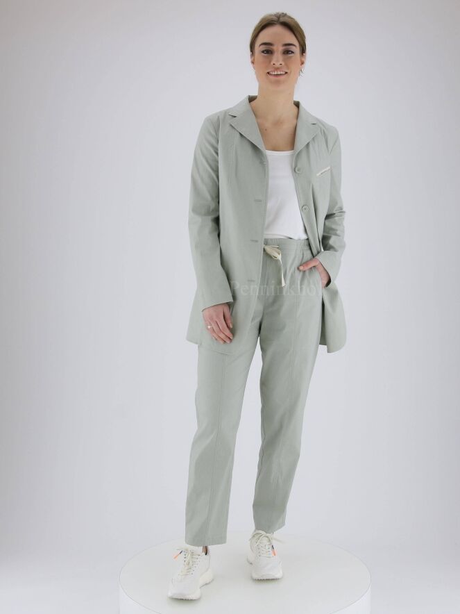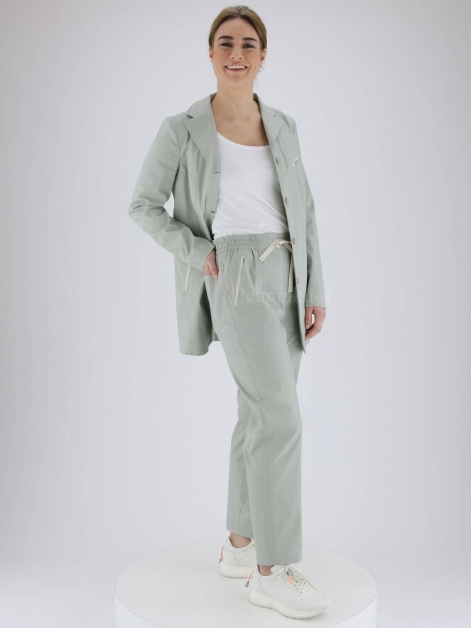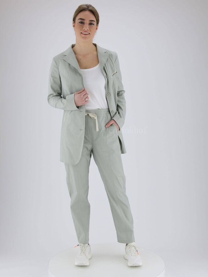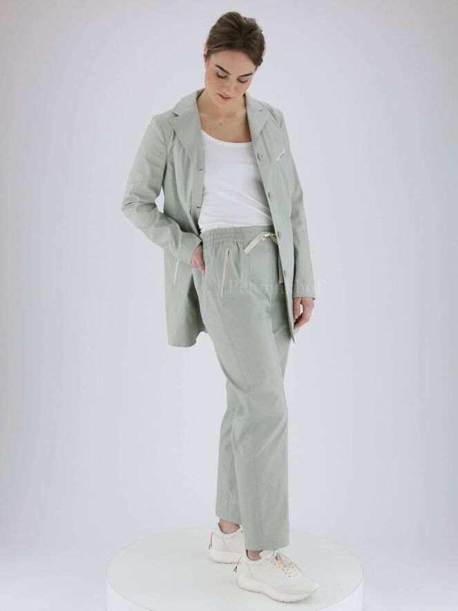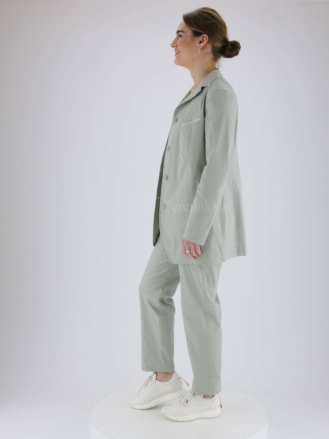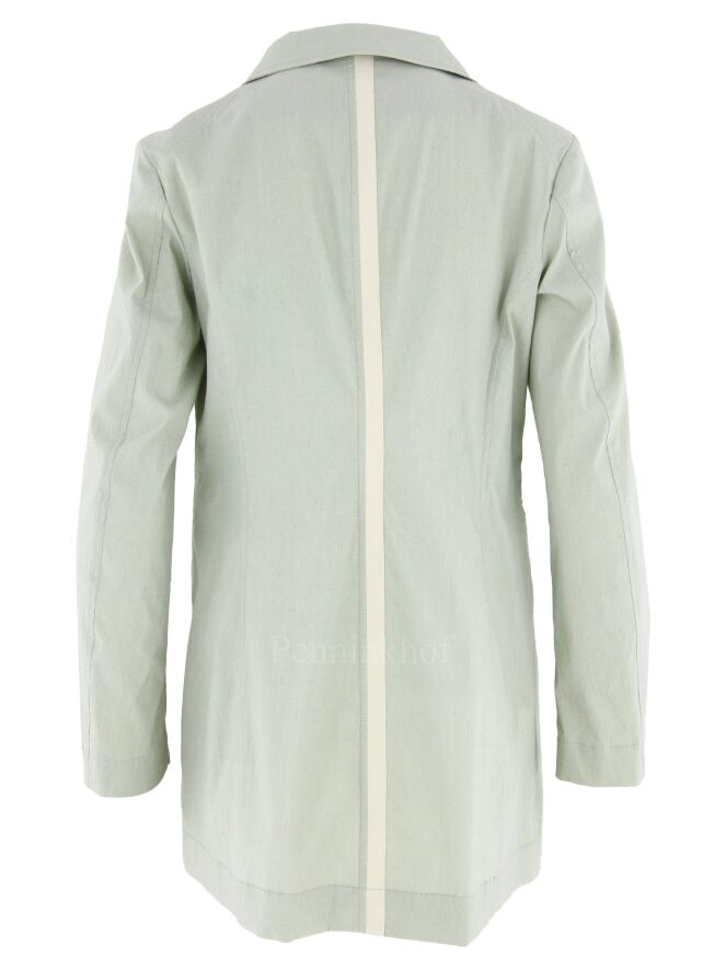 Veste mi-longue de la marque Annette Görtz, de couleur vert menthe. La veste ferme à l'aide de quatre boutons et possède des poches latérales. Un passepoil de couleur écrue orne une poche poitrine, les deux poches latérales et toute la hauteur du dos en son centre. Modèle non doublé. Lavage à 30 degrés.
