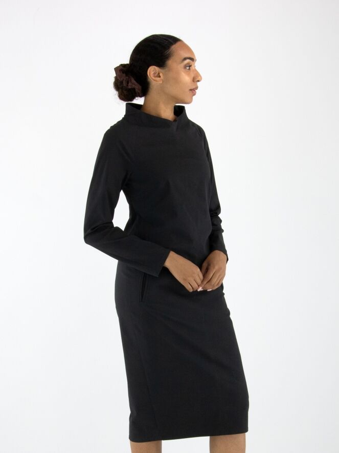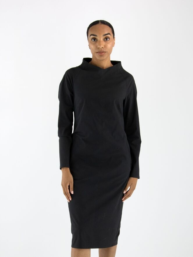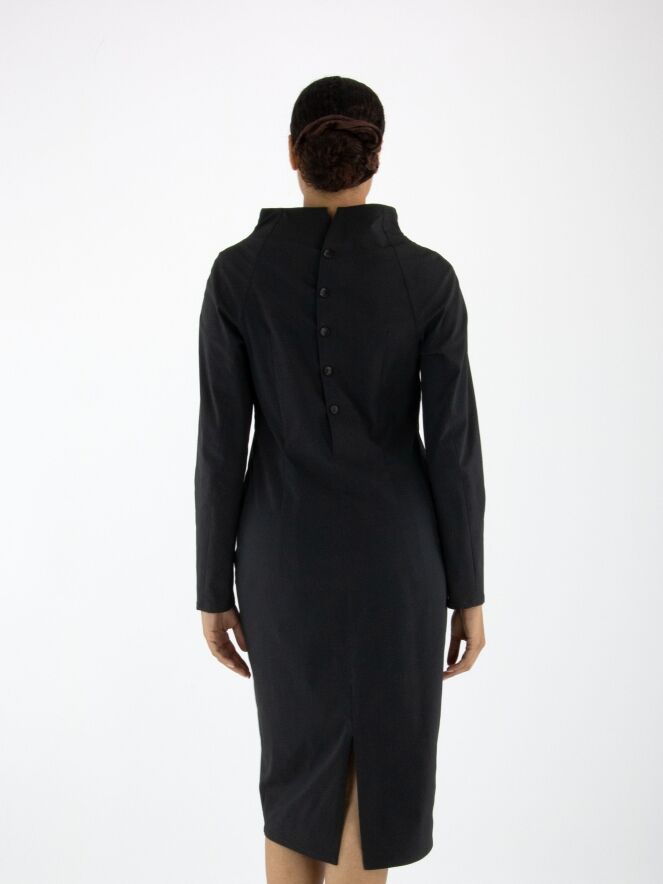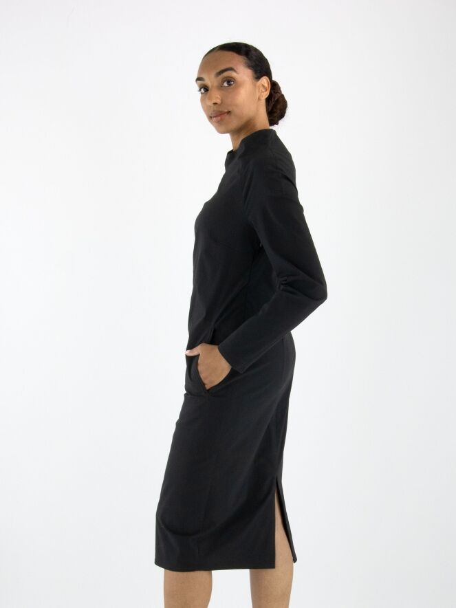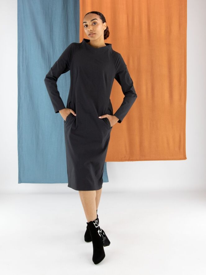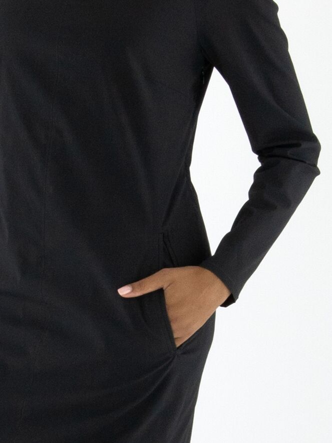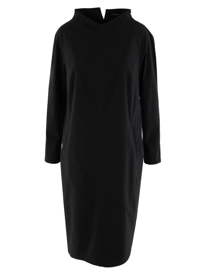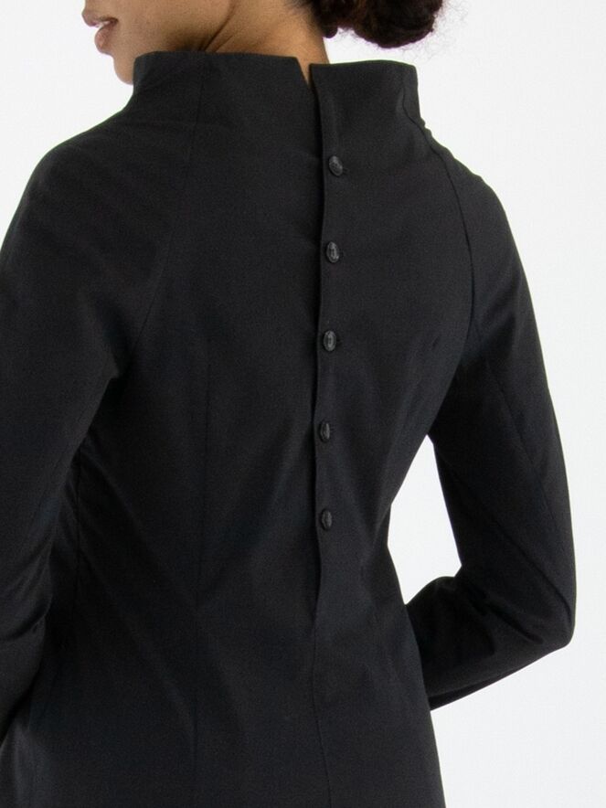 Robe Annette Görtz en noir. Elle présente un col en V haut et des poches à la taille. À l’arrière, une fermeture boutonnée descend du col jusqu’à la taille. La robe est doublée et doit être lavée à la main.