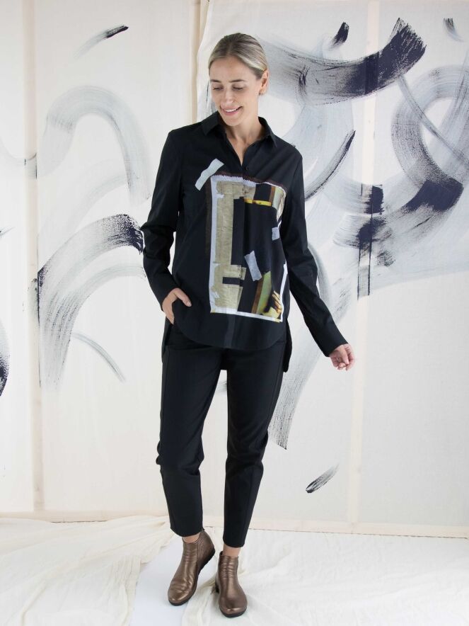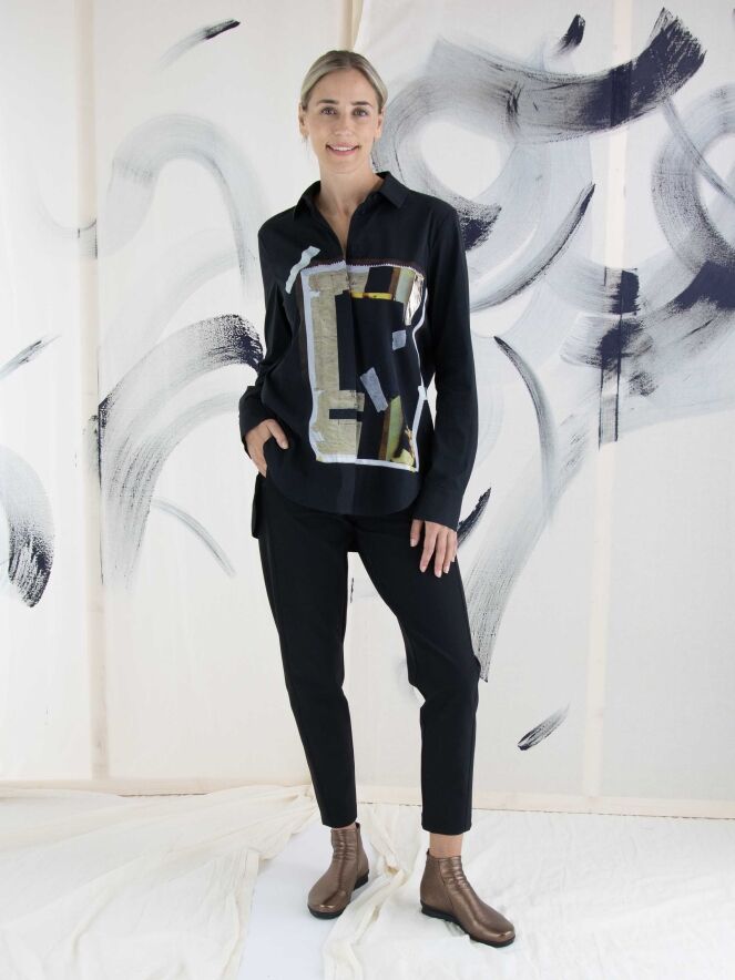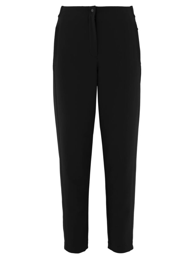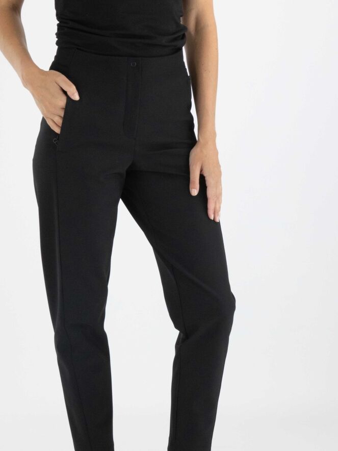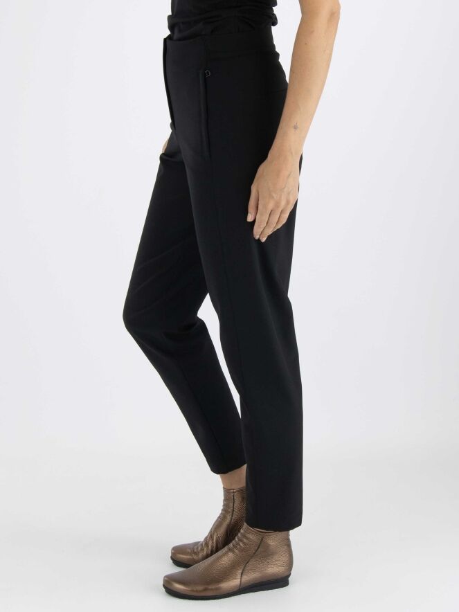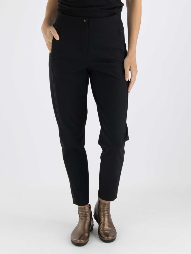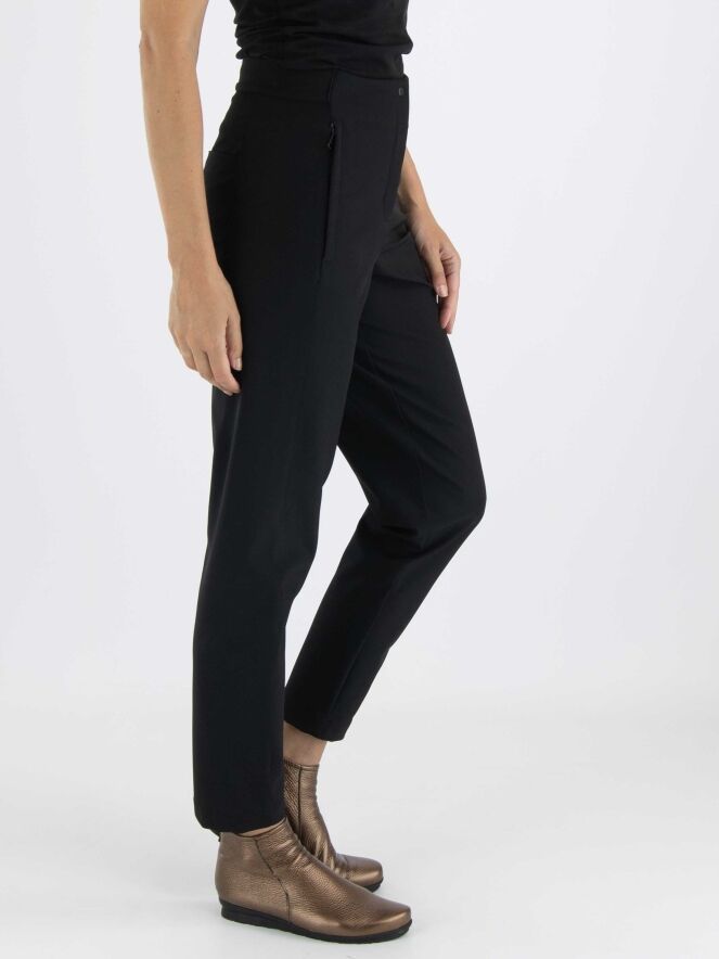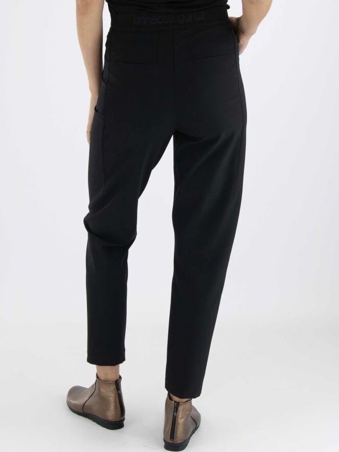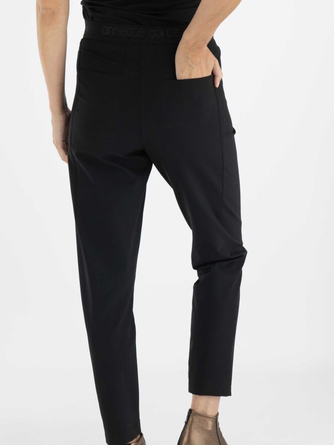 Un pantalon d'Annette Görtz en noir. Il y a une bande élastique à l'arrière de la taille. Les poches latérales sont zippées. Ce pantalon peut être lavé à 30 degrés.