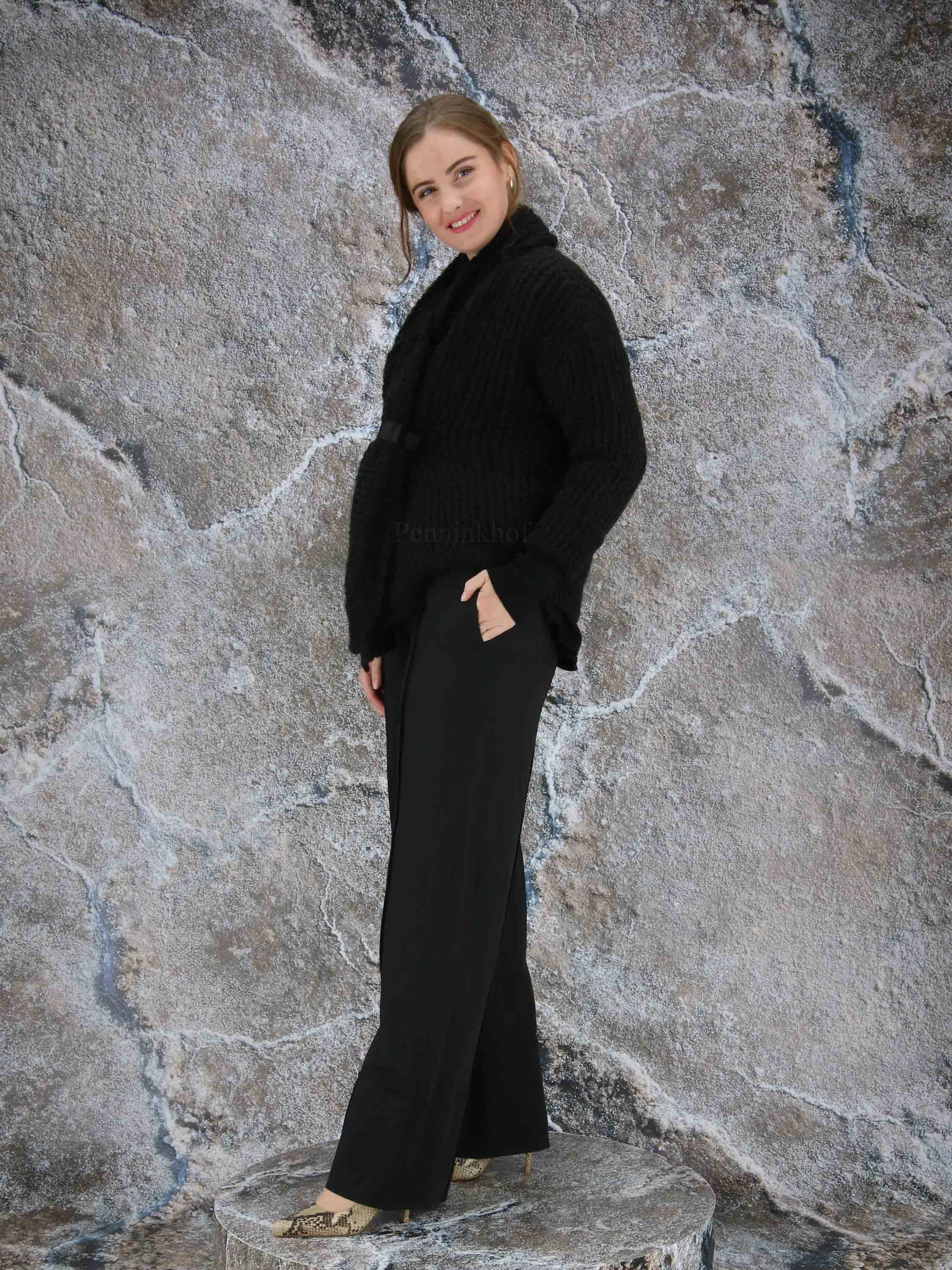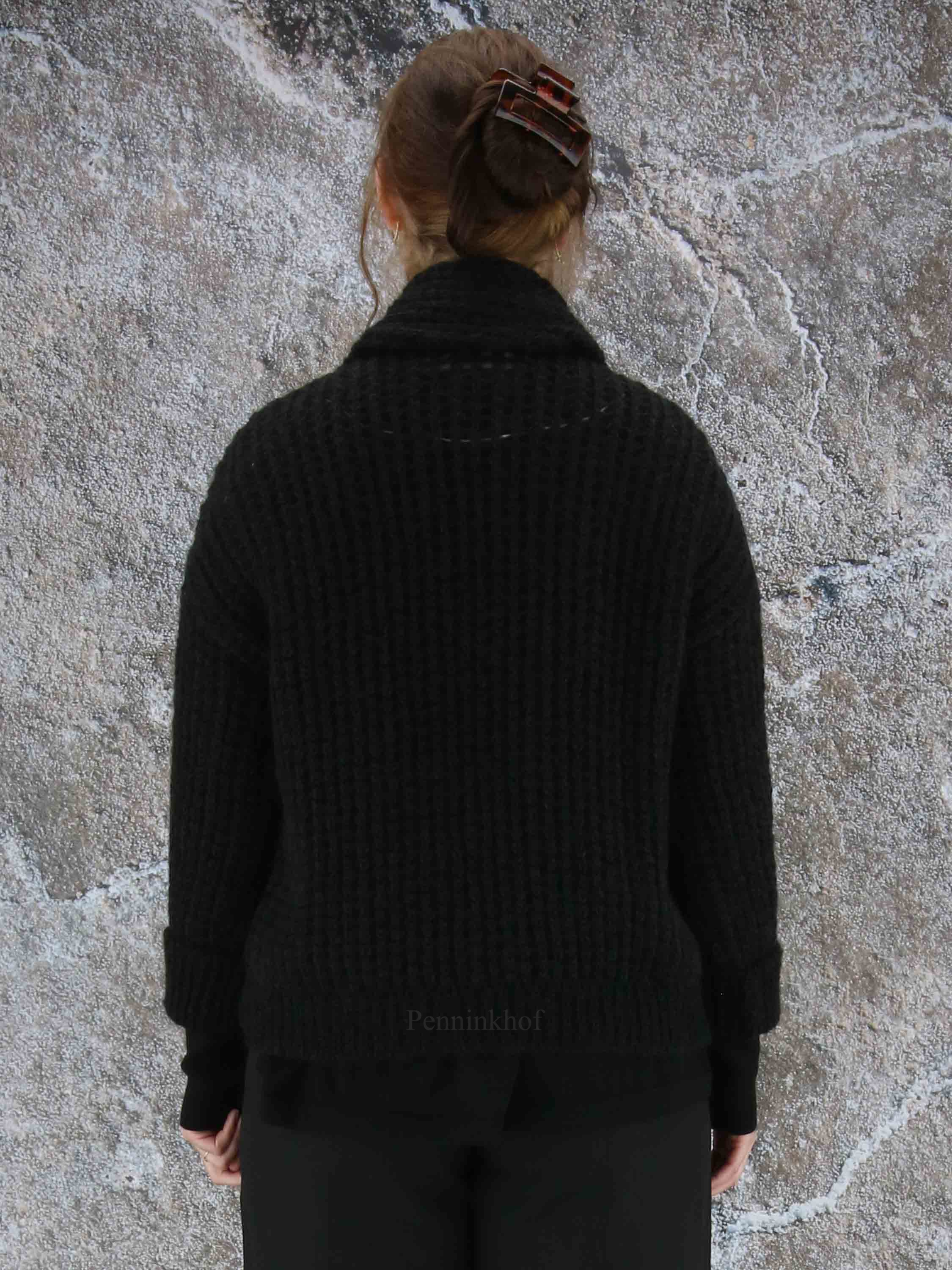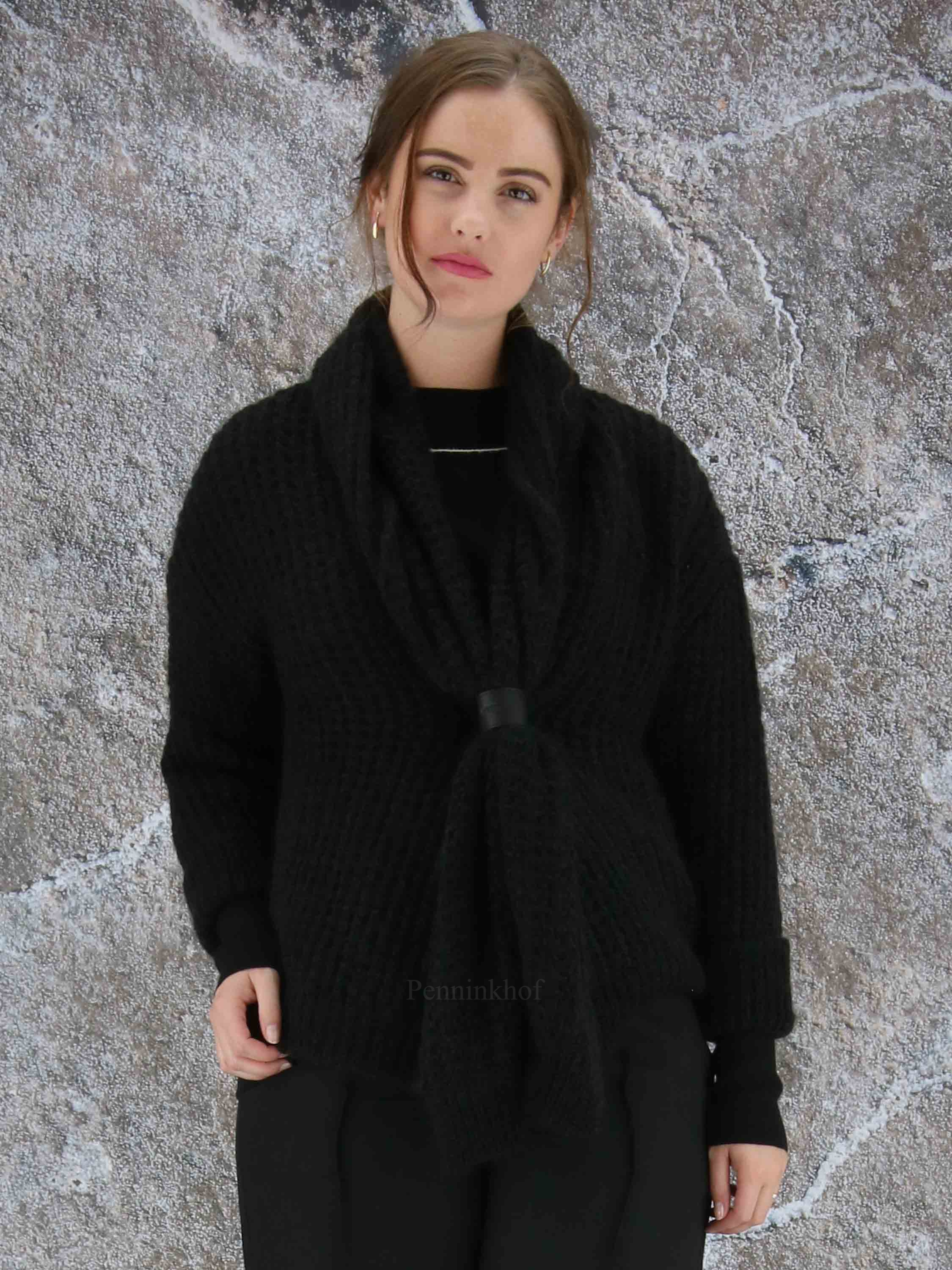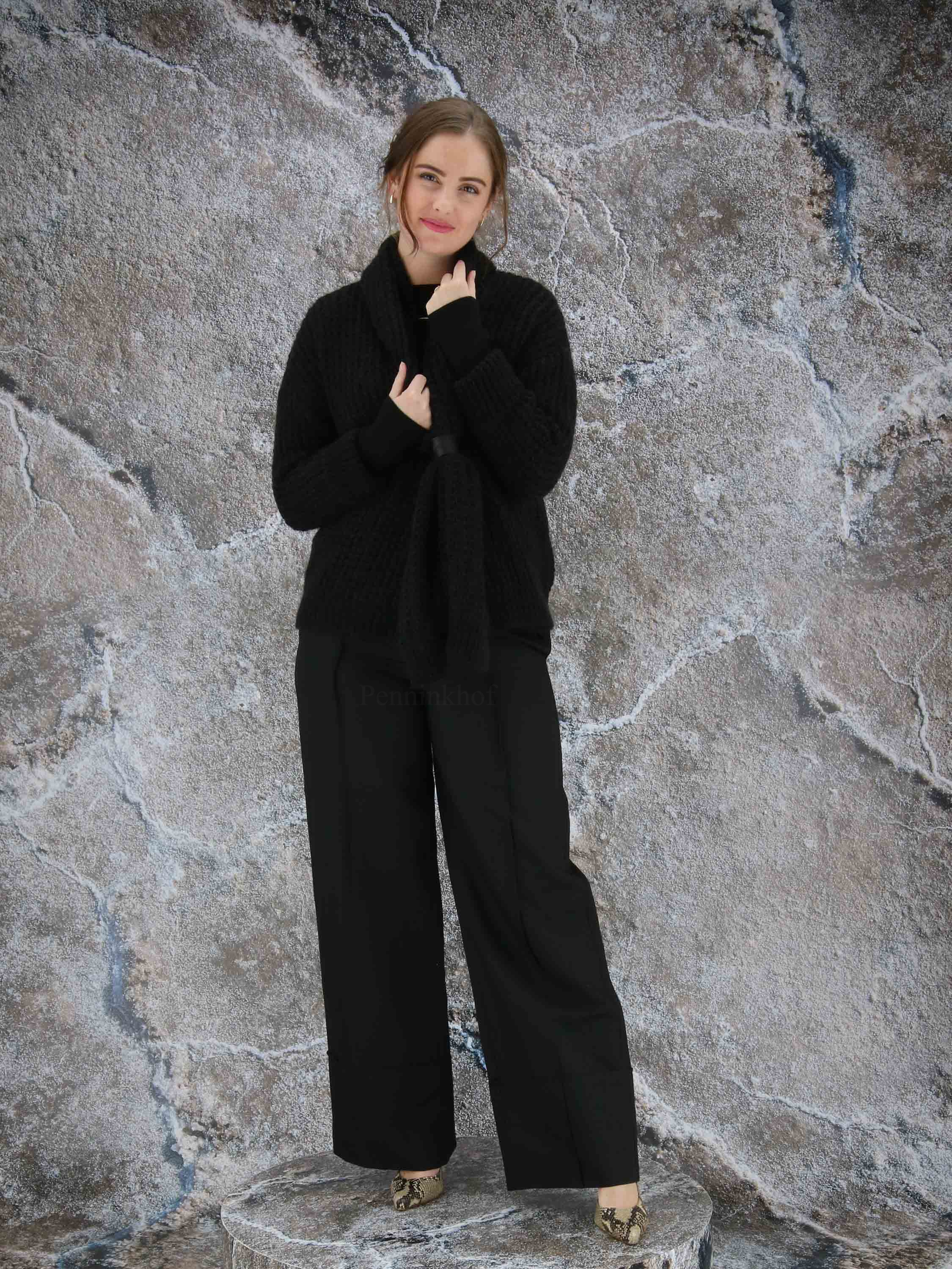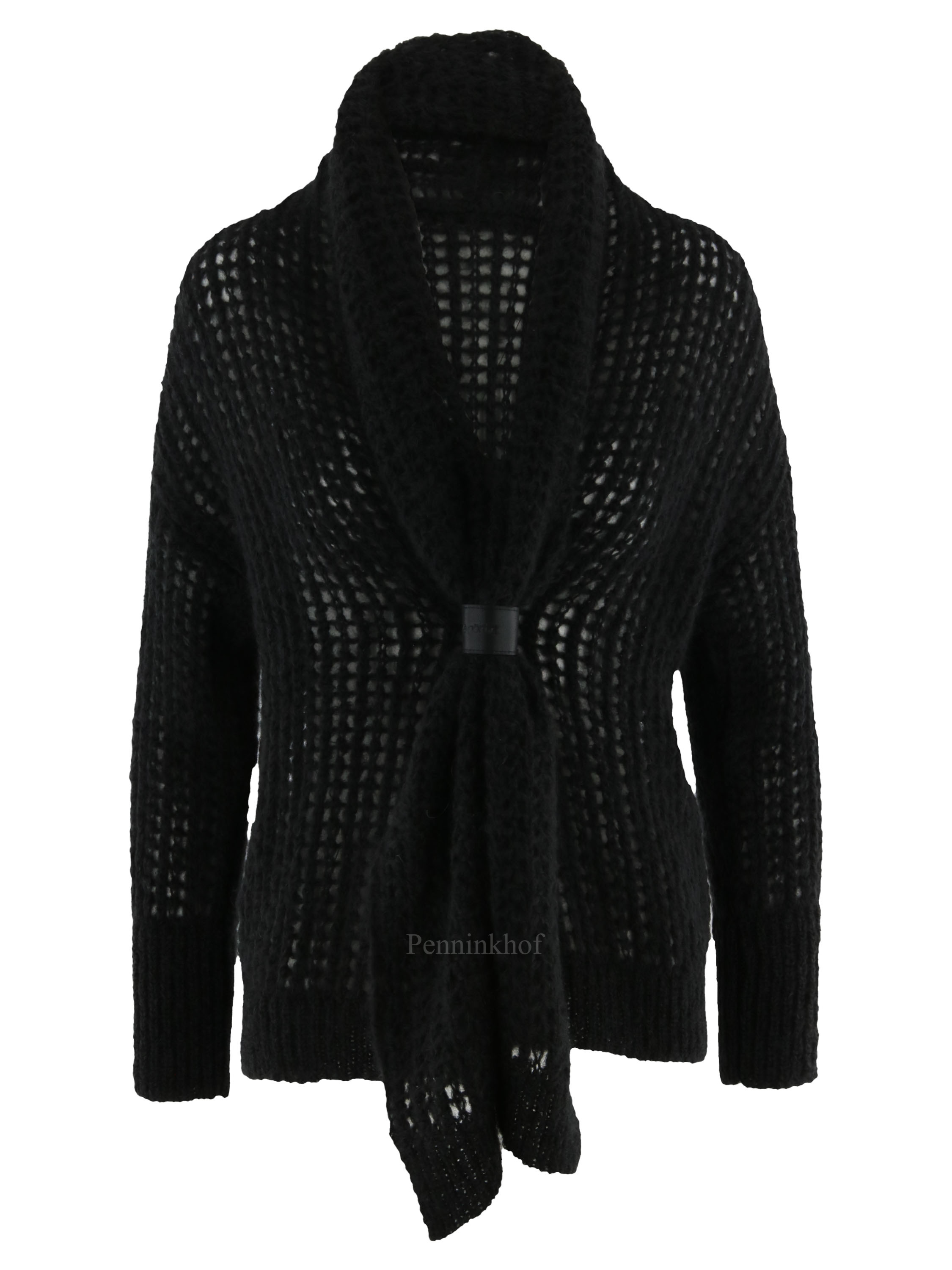 Luxueux cardigan à maille ouverte de la marque Annette Görtz, de couleur noire. La fermeture se fait par un bouton pression à garniture en cuir qui resserre le col châle au niveau de la taille. Lavage à la main.