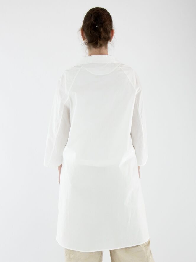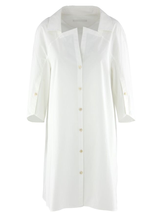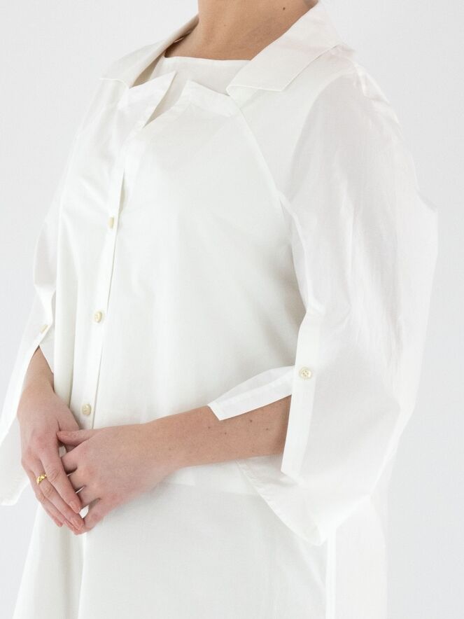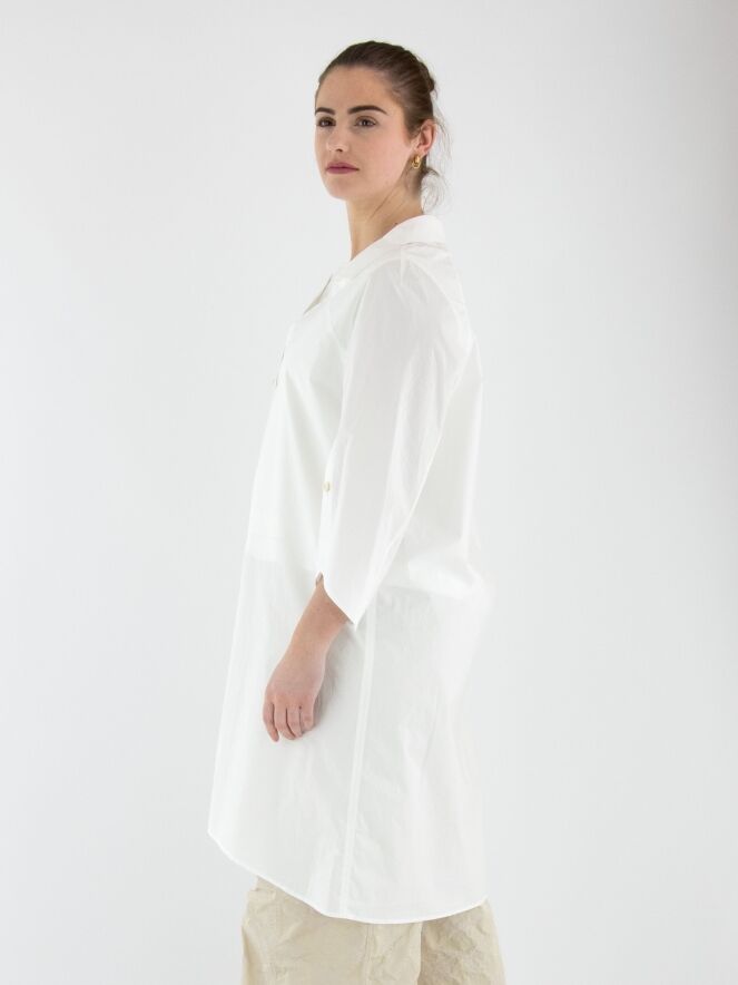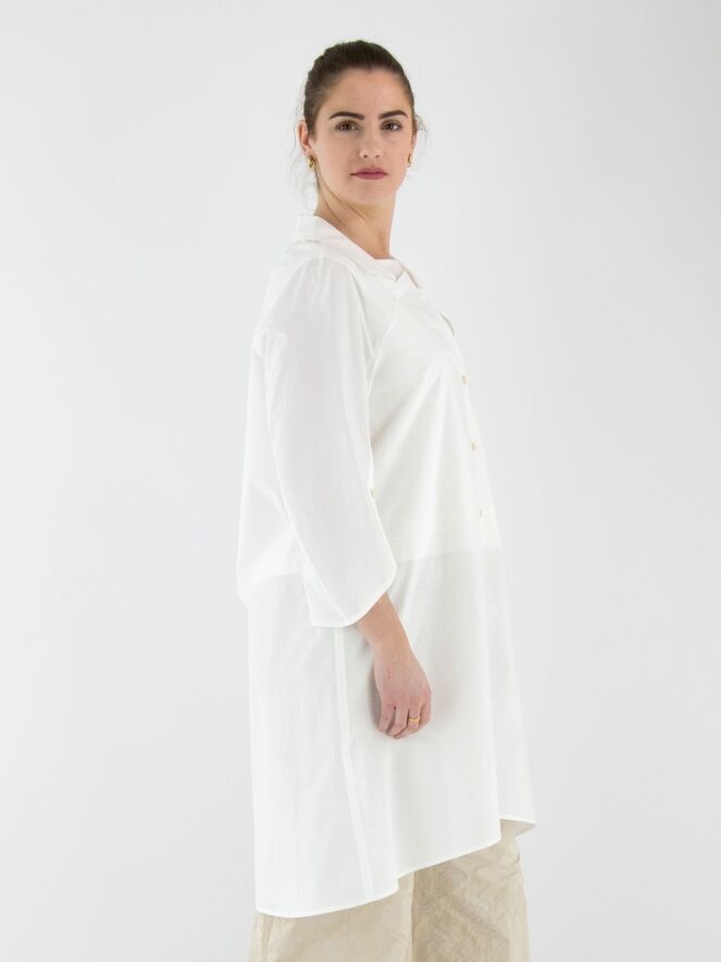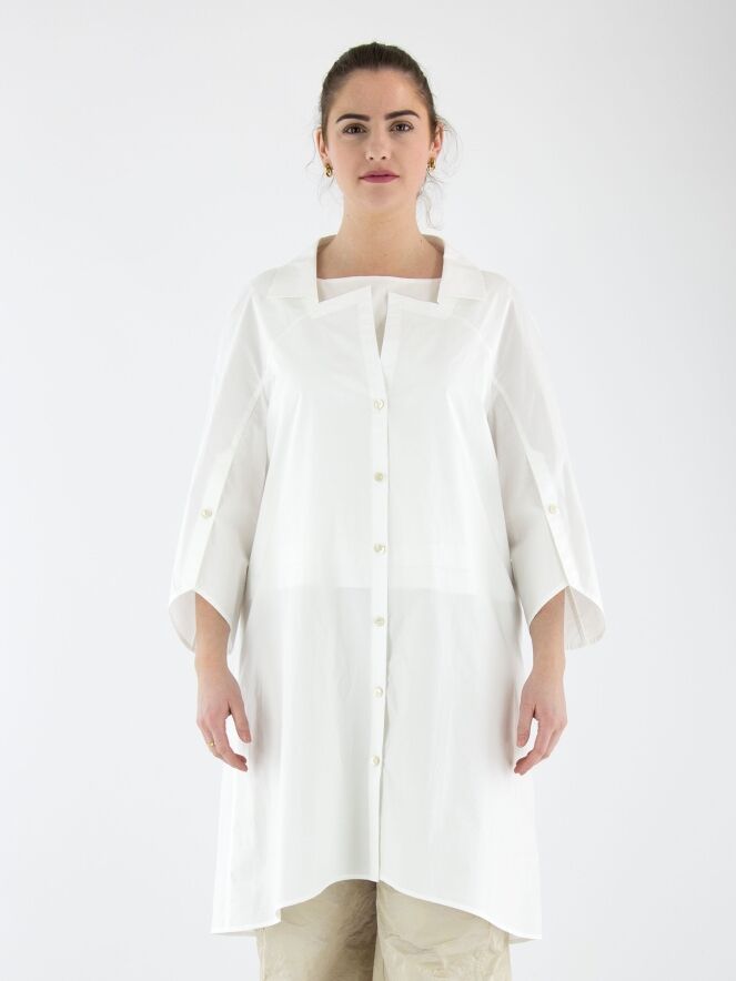 Une blouse longue d’Annette Görtz en blanc. La blouse présente un col avec une encolure carrée. Les extrémités des manches mi-longues ont une fente profonde avec une fermeture boutonnée. Cette blouse peut être lavée à 30 degrés.