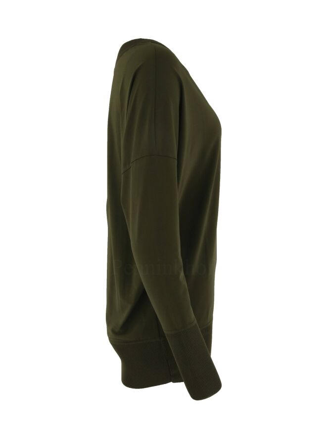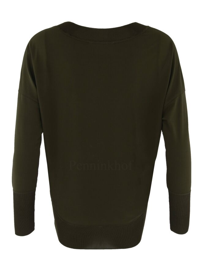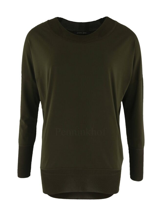 Tee-shirt de la marque Annette Görtz, de couleur vert olive. Une large bordure en tricot finement côtelé est présente le long de l'encolure ronde, aux extrémités des manches et au bas des chemises. Lavage à la main.
