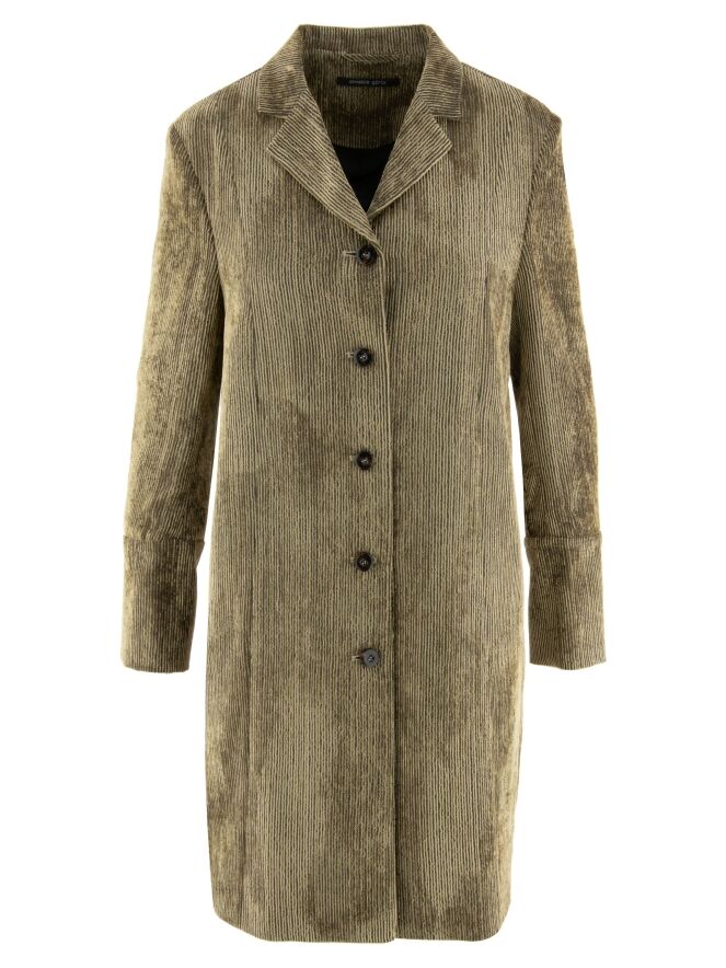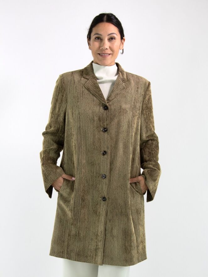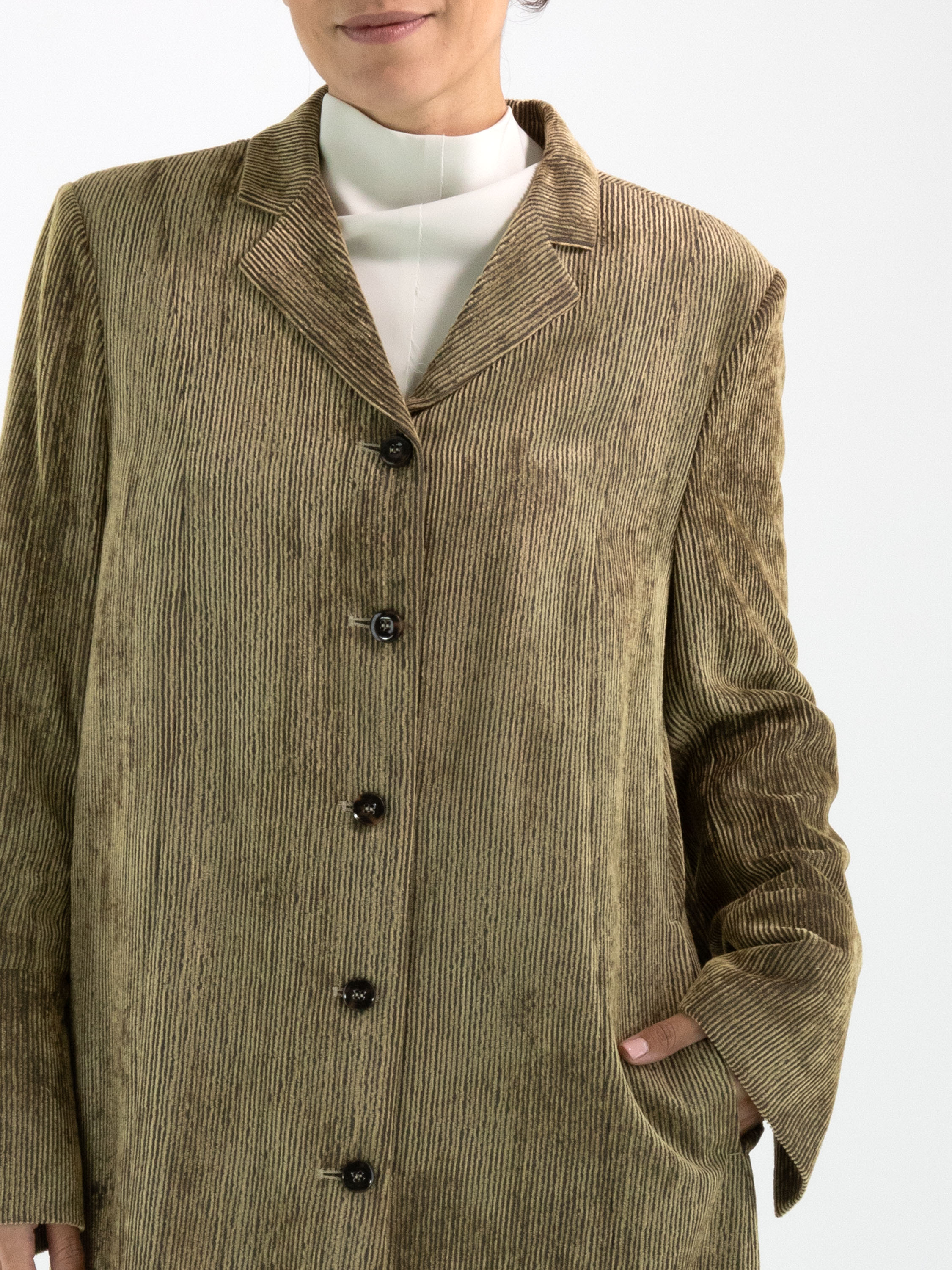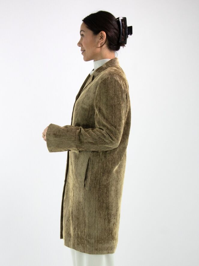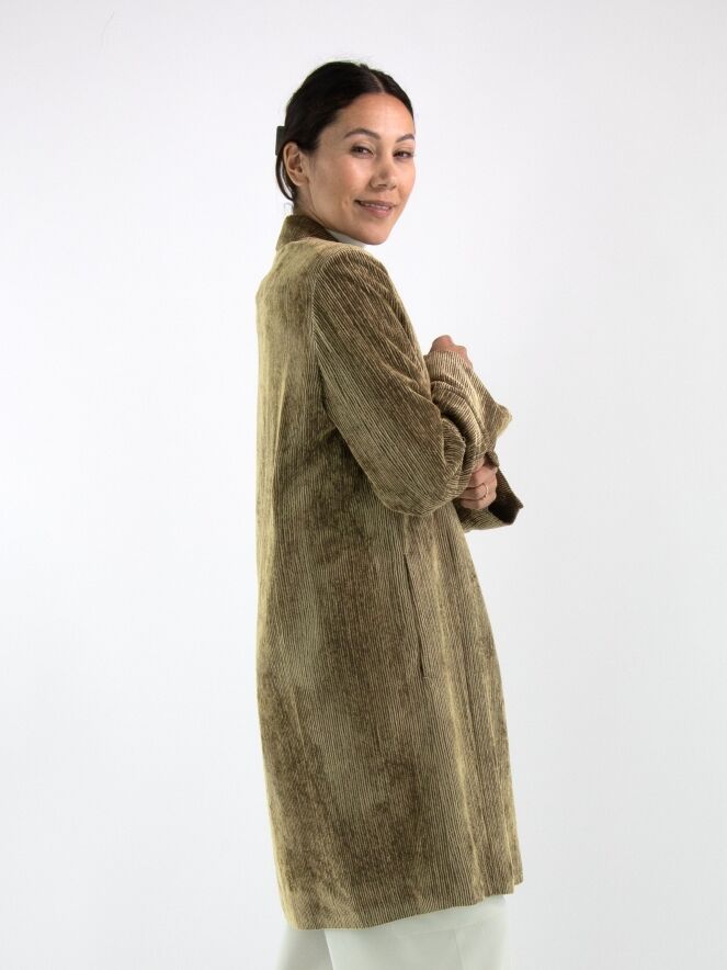 Blazer long en velours côtelé signé Annette Görtz, décliné en plusieurs nuances de vert olive qui varient selon le sens du velours. Le blazer se ferme par cinq boutons et est entièrement doublé. Ce blazer ne doit pas être lavé.