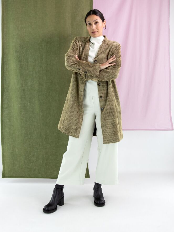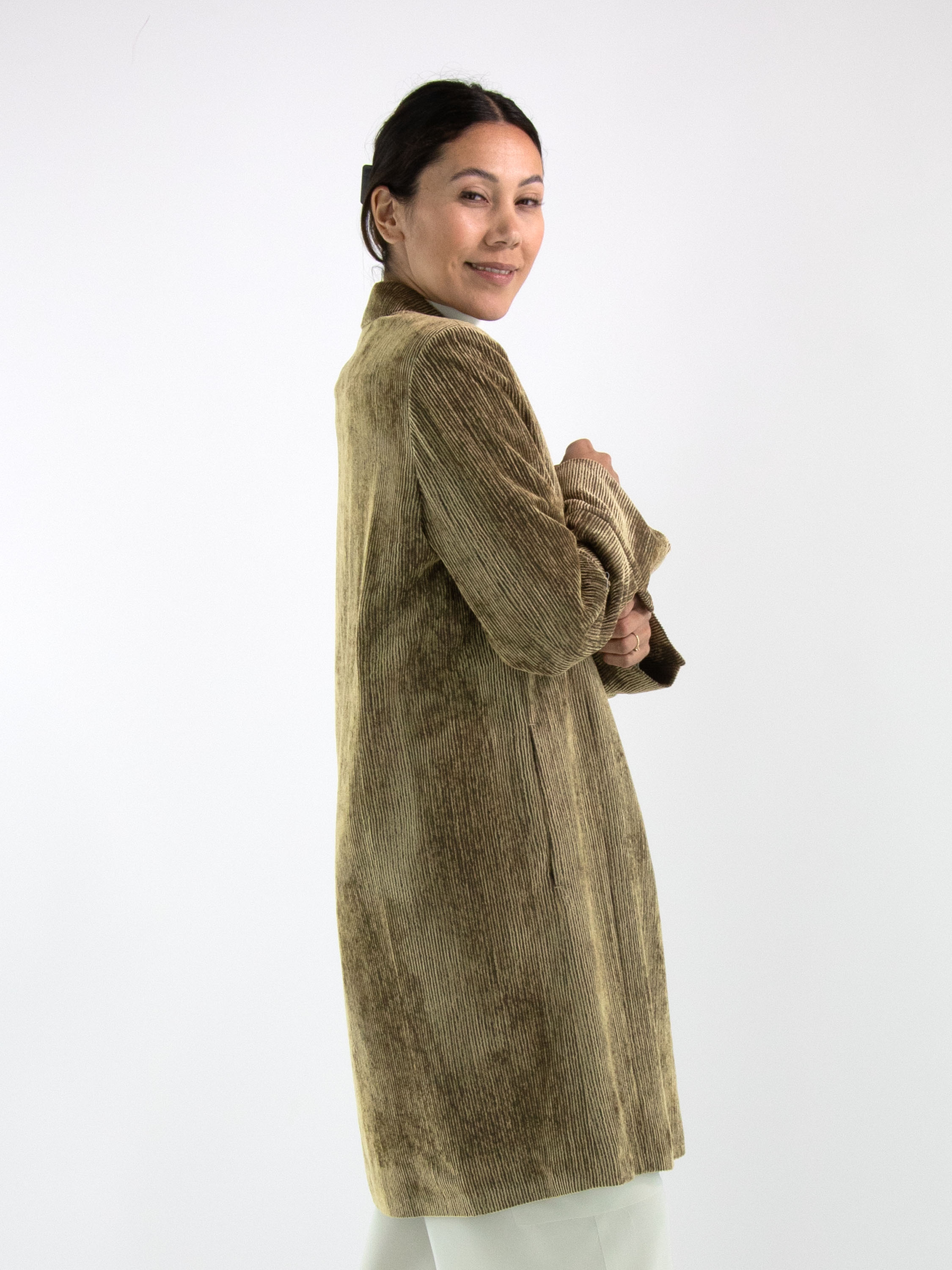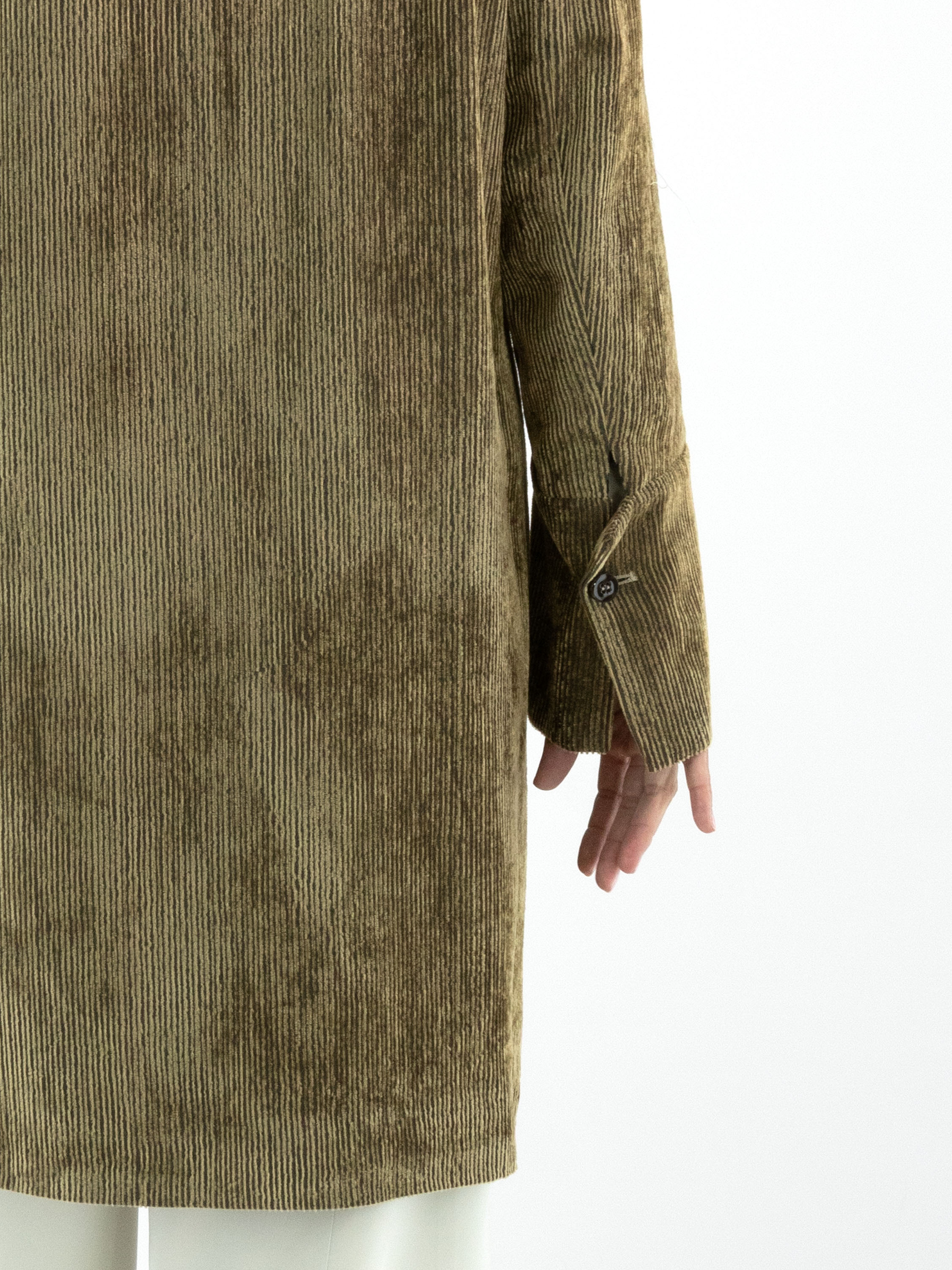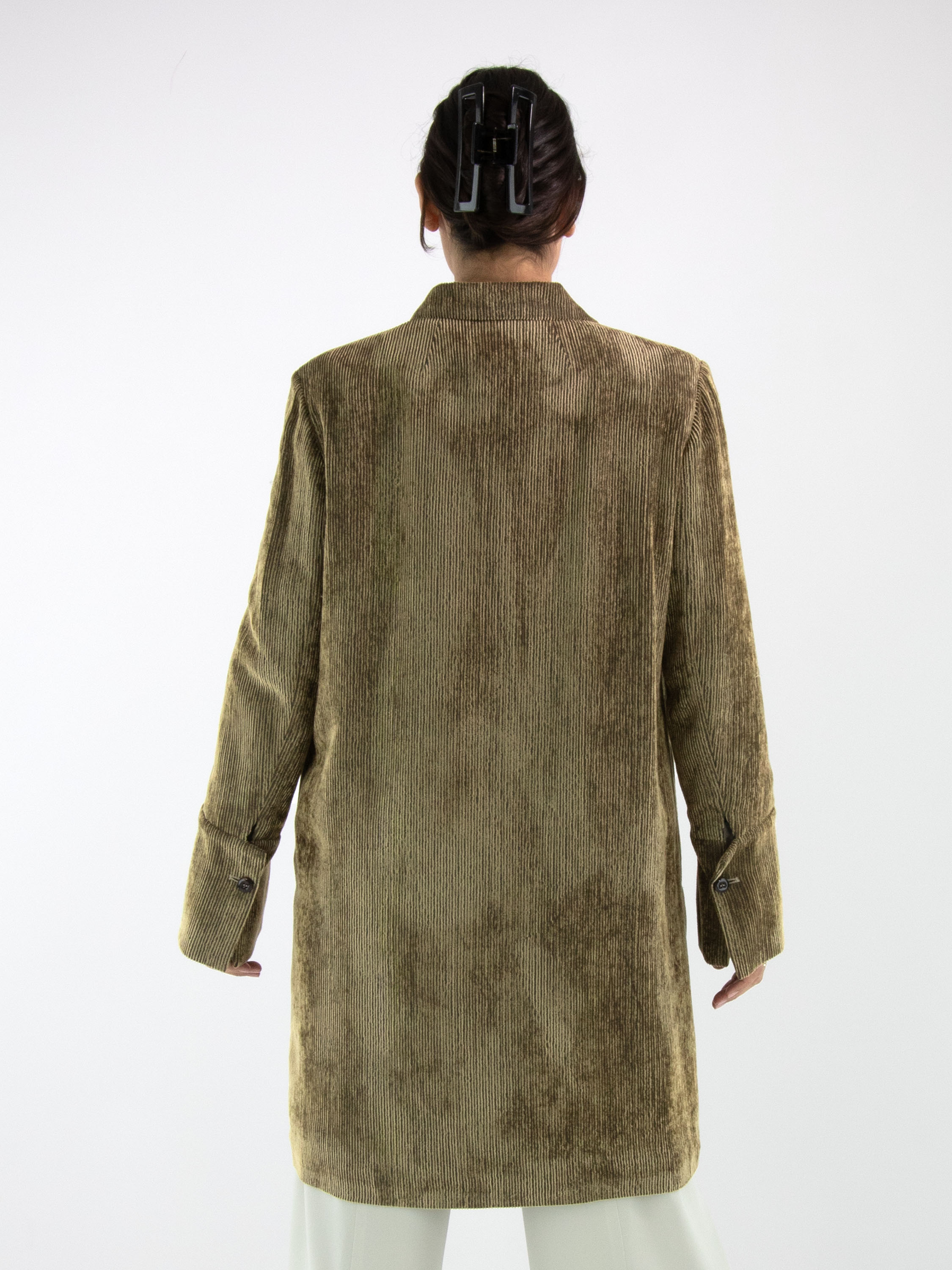 Blazer long en velours côtelé signé Annette Görtz, décliné en plusieurs nuances de vert olive qui varient selon le sens du velours. Le blazer se ferme par cinq boutons et est entièrement doublé. Ce blazer ne doit pas être lavé.