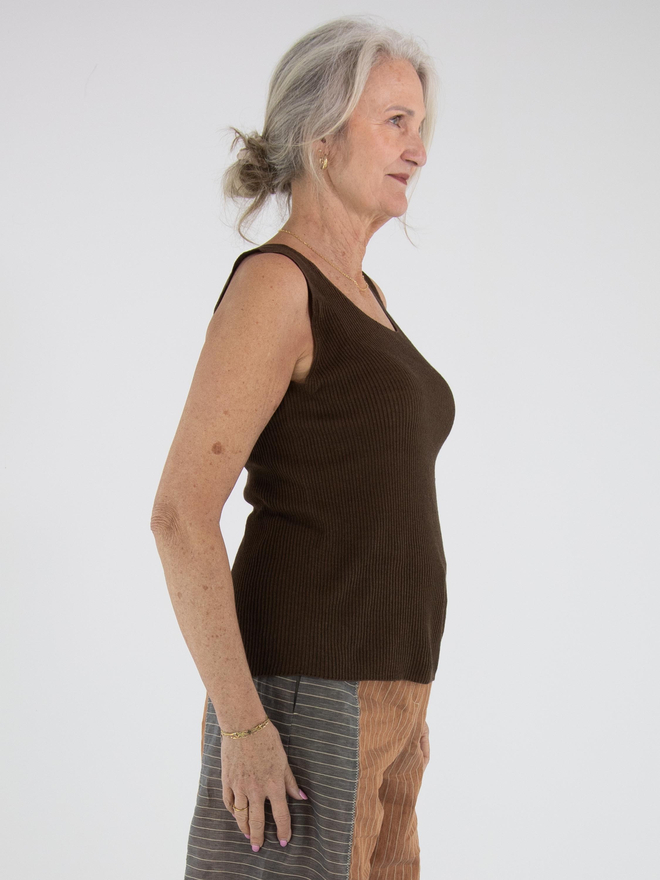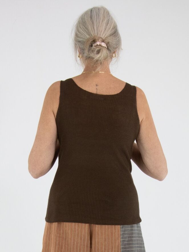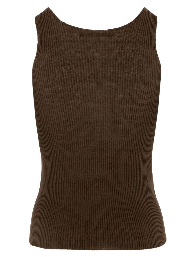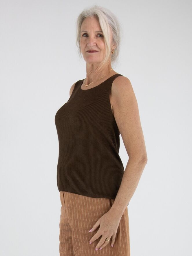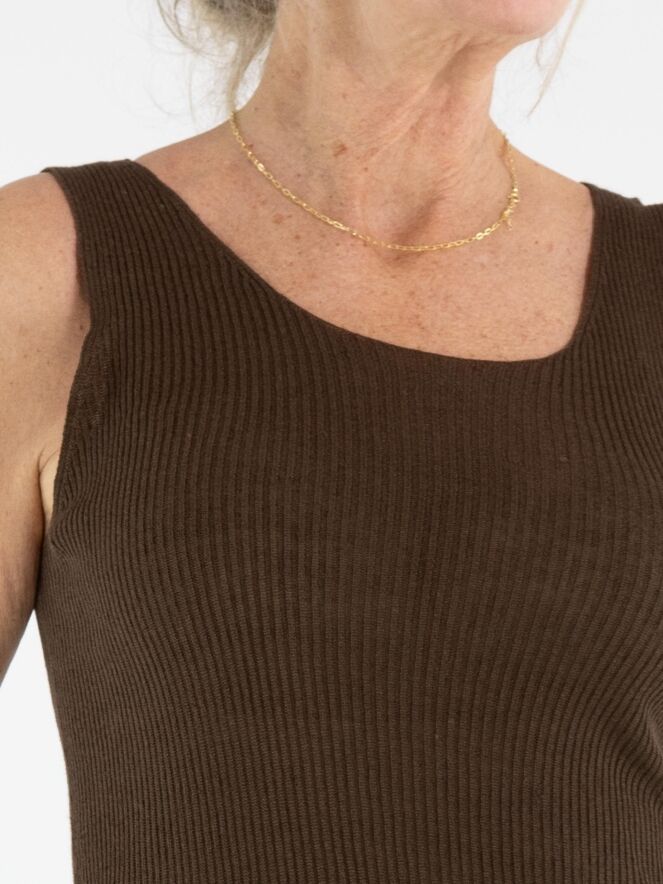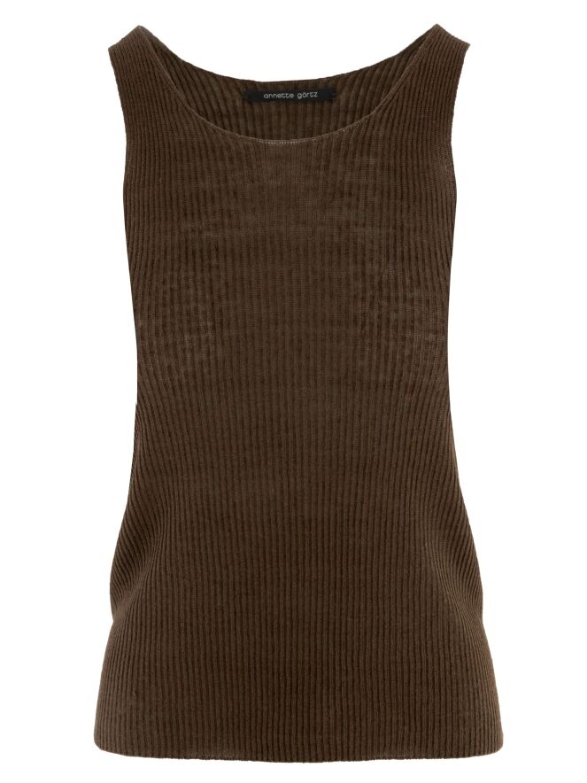 Top de Annette Görtz dans une chaleureuse teinte brun moka. Le tissu présente une structure délicatement côtelée, apportant une touche moderne et raffinée. Doté d’un col rond et de bretelles d’environ 3 cm de large. Ce top doit être lavé à la main.