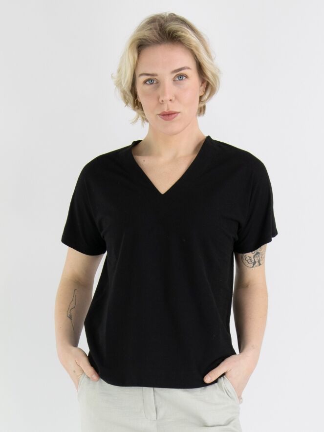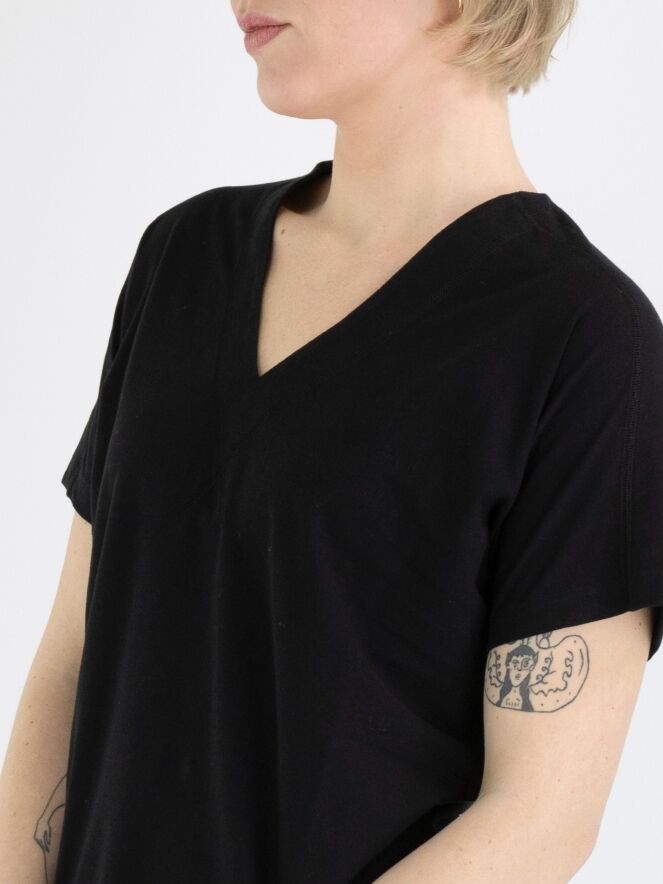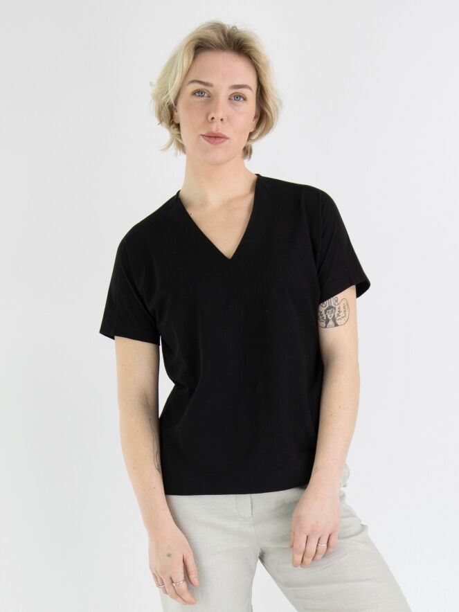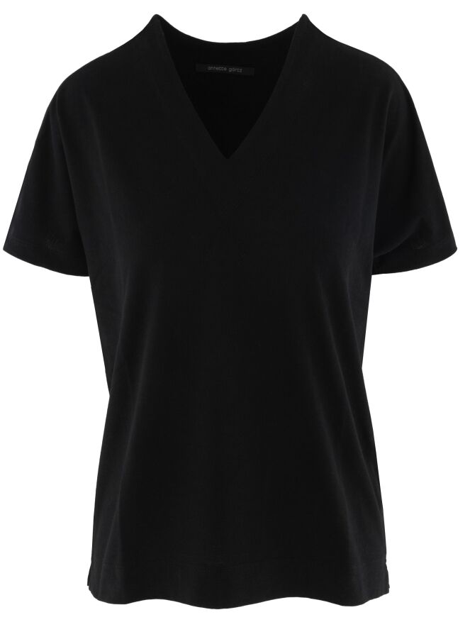 Une chemise d'Annette Görtz en noir. La chemise a des manches courtes et un col en V. Cette chemise peut être lavée à 30 degrés.