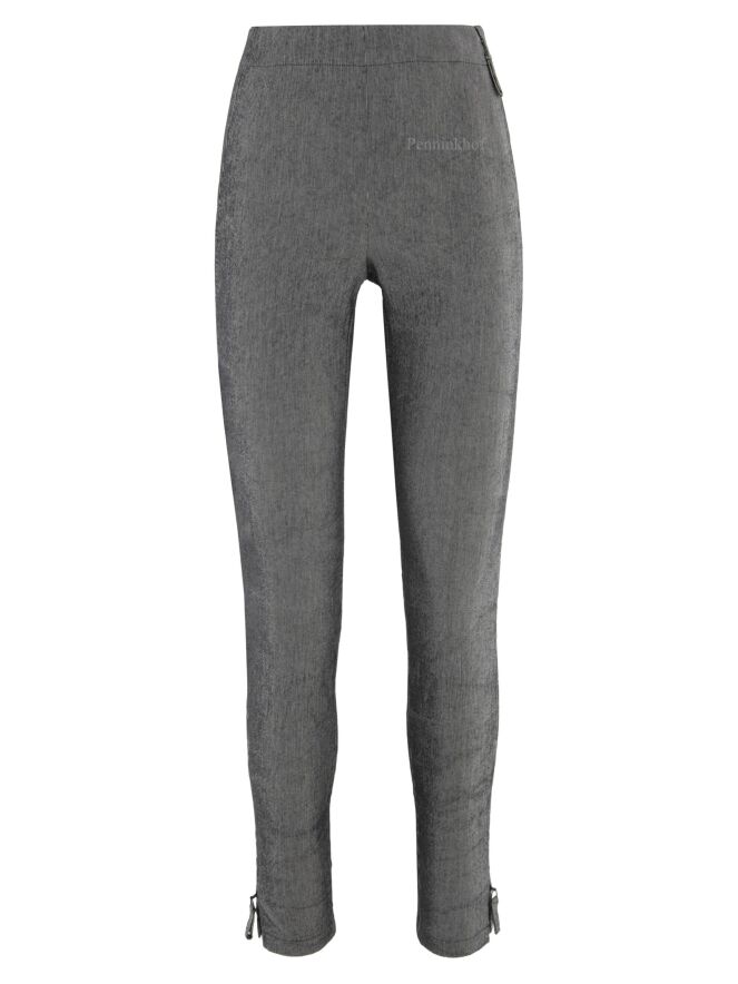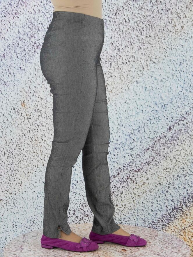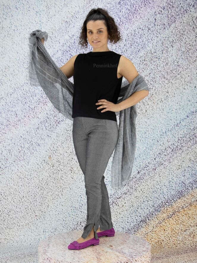 Pantalon de la marque Annette Görtz, à très fines rayures verticales noires et blanc crème, donnant une couleur gris foncé. De la taille élastique descend un zip de fermeture sur le côté gauche. Au bas des jambes, un petit zip à tirettes orne chaque côté. Lavage à 30 degrés.