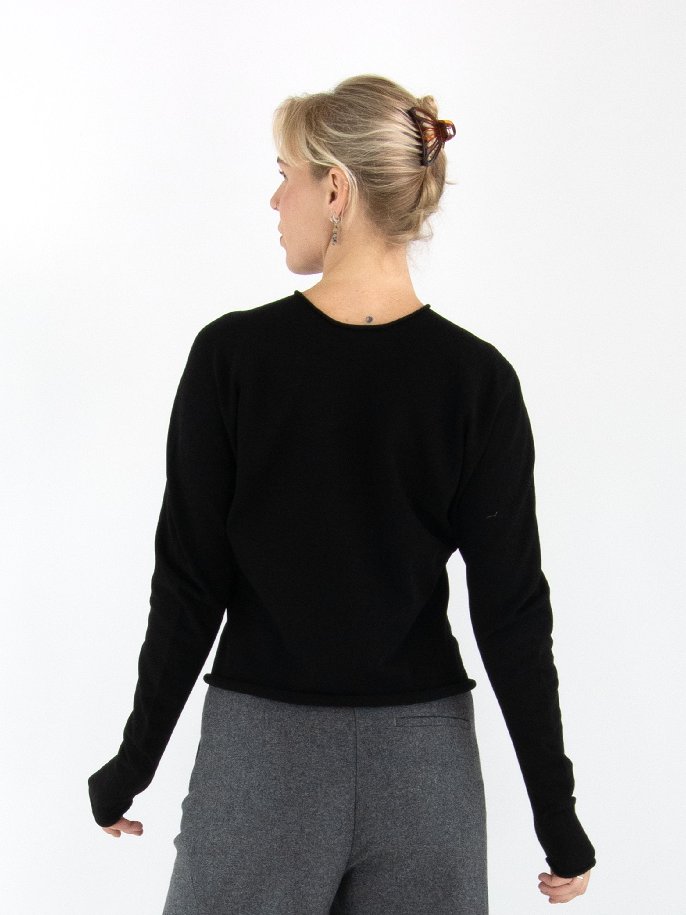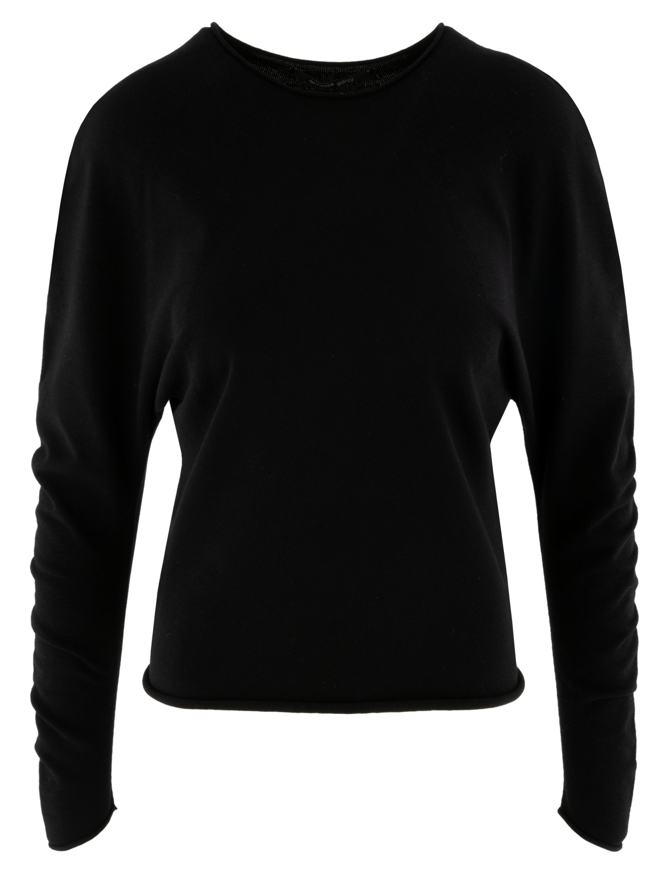 Pull Annette Görtz en tissu noir structuré. Les bords de l’encolure ronde, des manches longues et du bas sont froncés. Depuis l’encolure, plusieurs coutures décoratives créent un subtil effet smocké. Ce pull doit être lavé à la main.