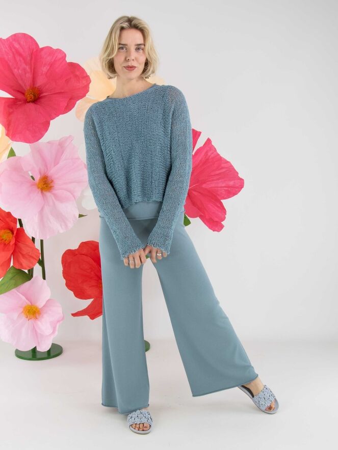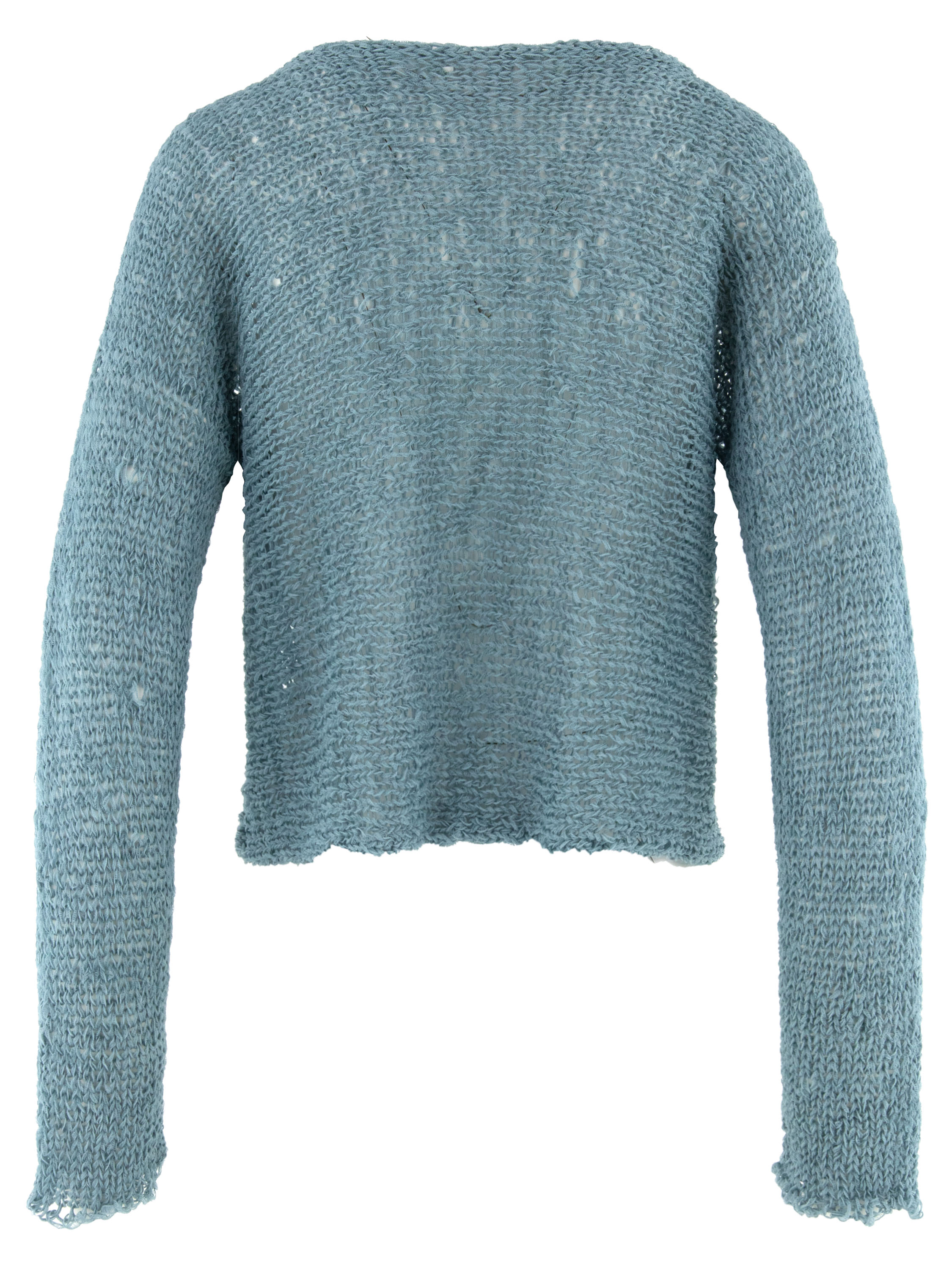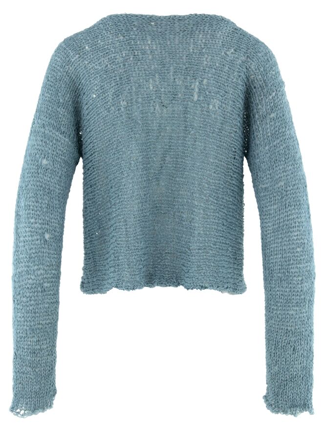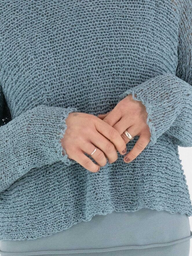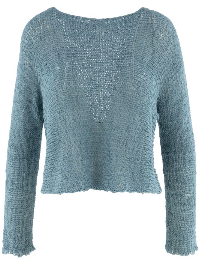 Un pull d’Annette Görtz, tricoté ajouré en fil ruban de couleur bleue. Le pull présente une encolure ronde et des manches longues et peut être lavé à la main.
