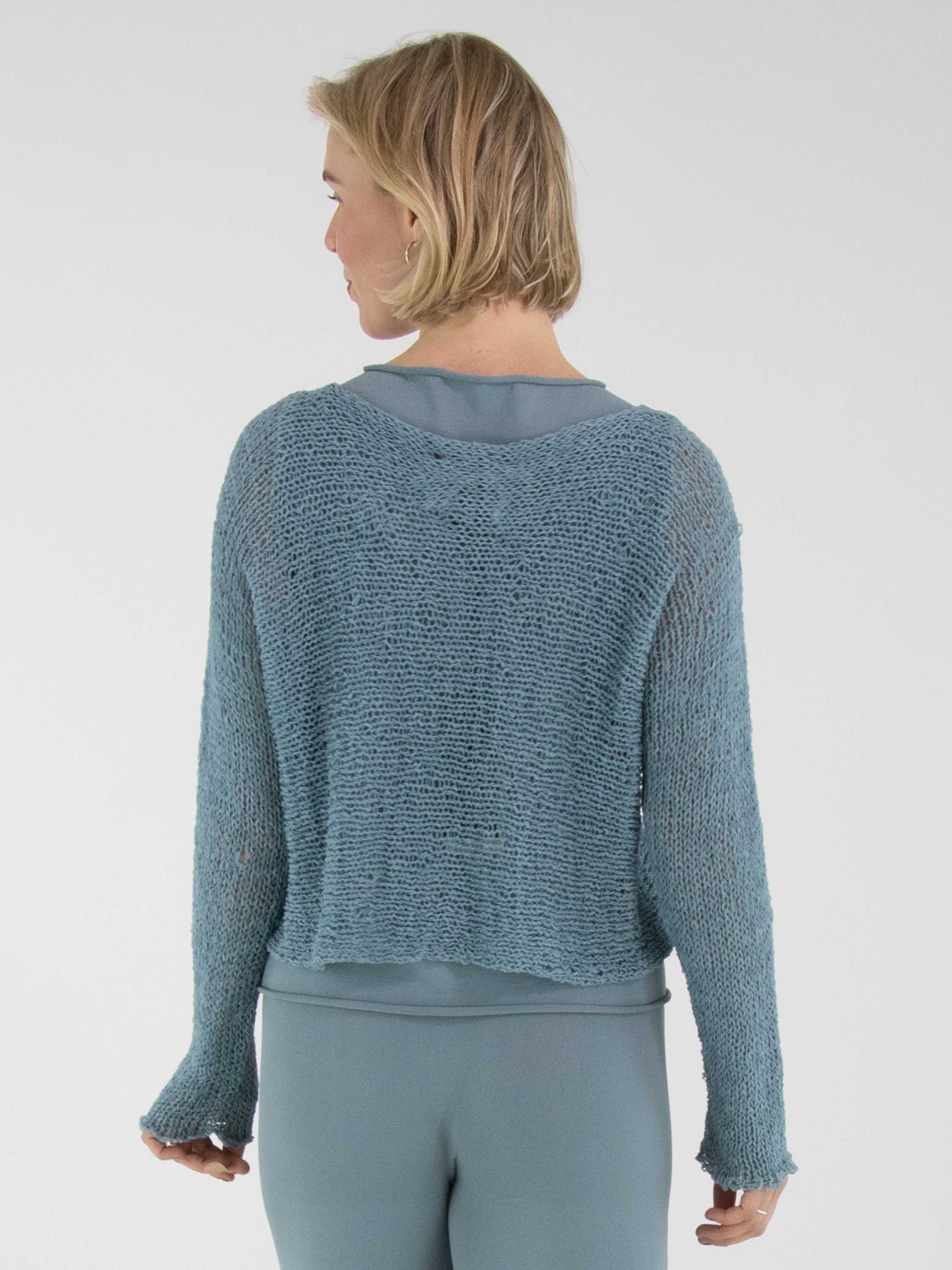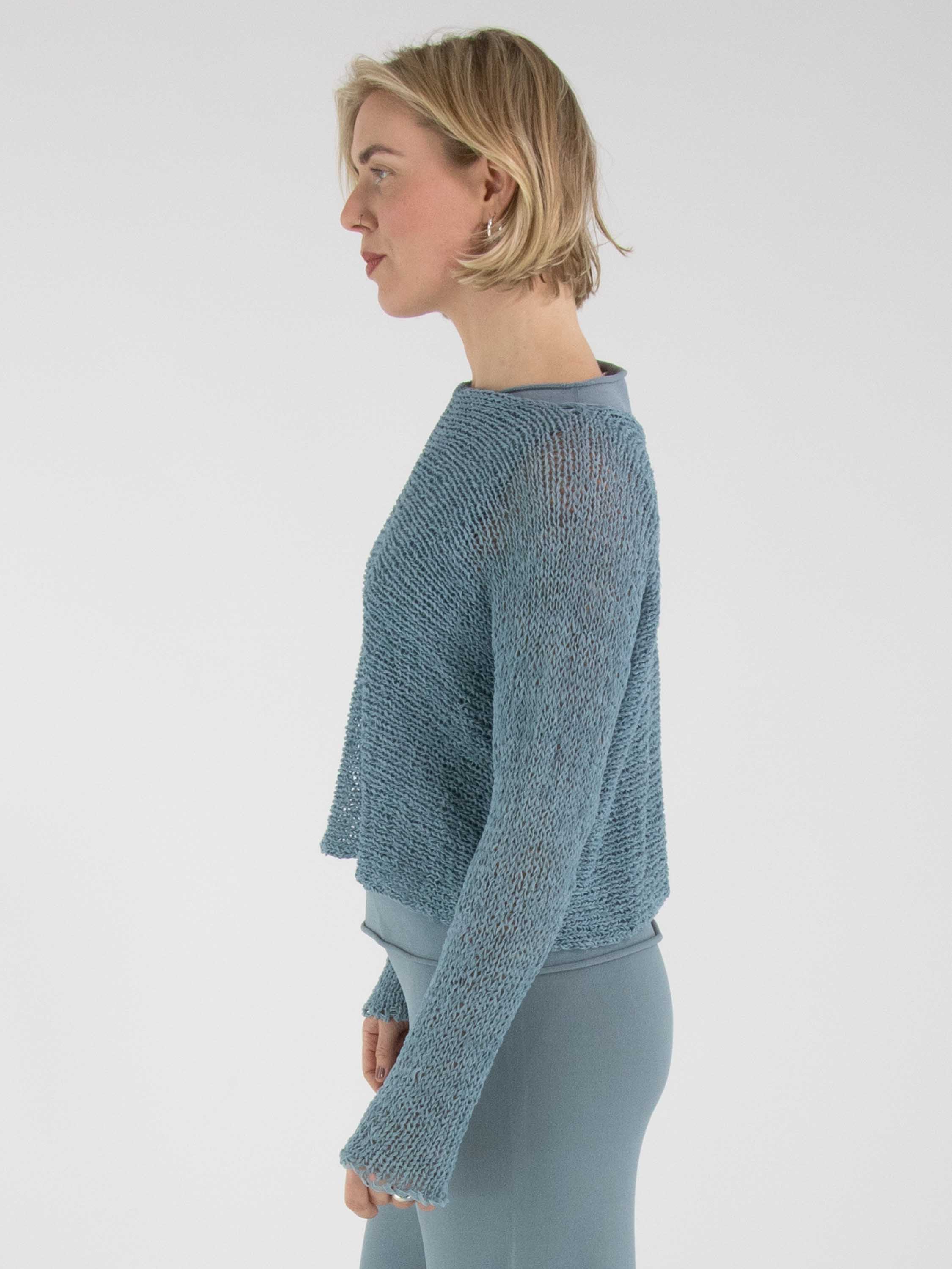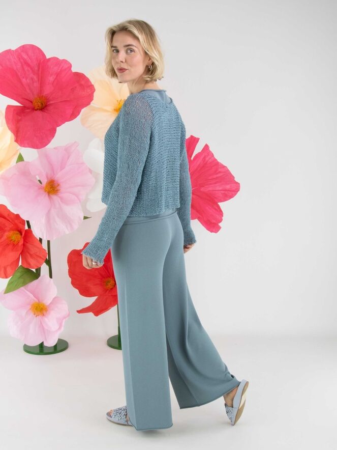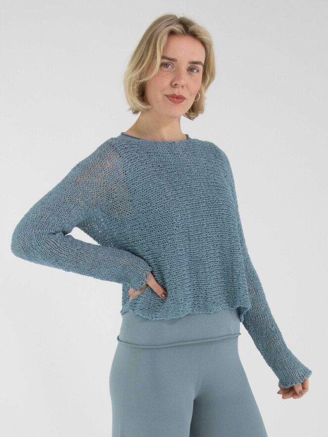 Un pull d’Annette Görtz, tricoté ajouré en fil ruban de couleur bleue. Le pull présente une encolure ronde et des manches longues et peut être lavé à la main.