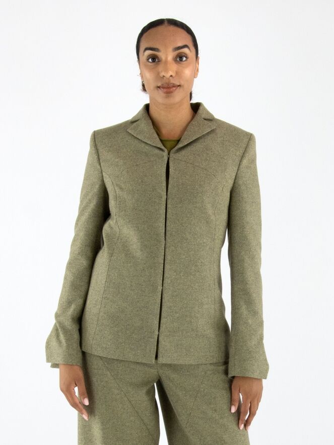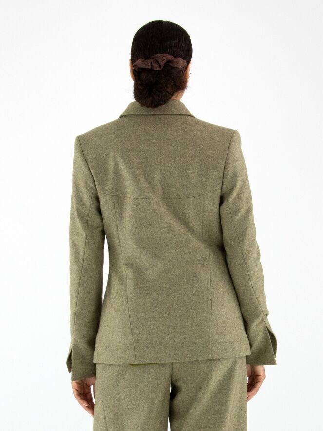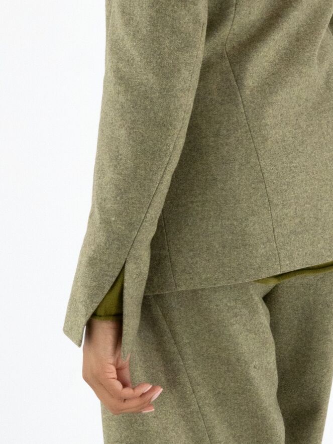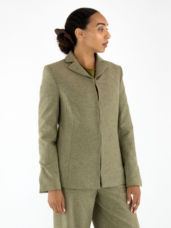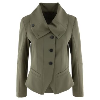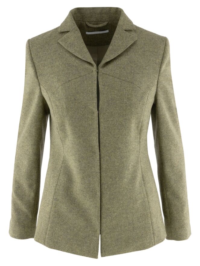Veste Annette Görtz dans une teinte olive chinée. La fermeture se compose de cinq crochets discrets. Les manches longues sont dotées d’une fente à l’ourlet. La veste est entièrement doublée et ne doit pas être lavée.