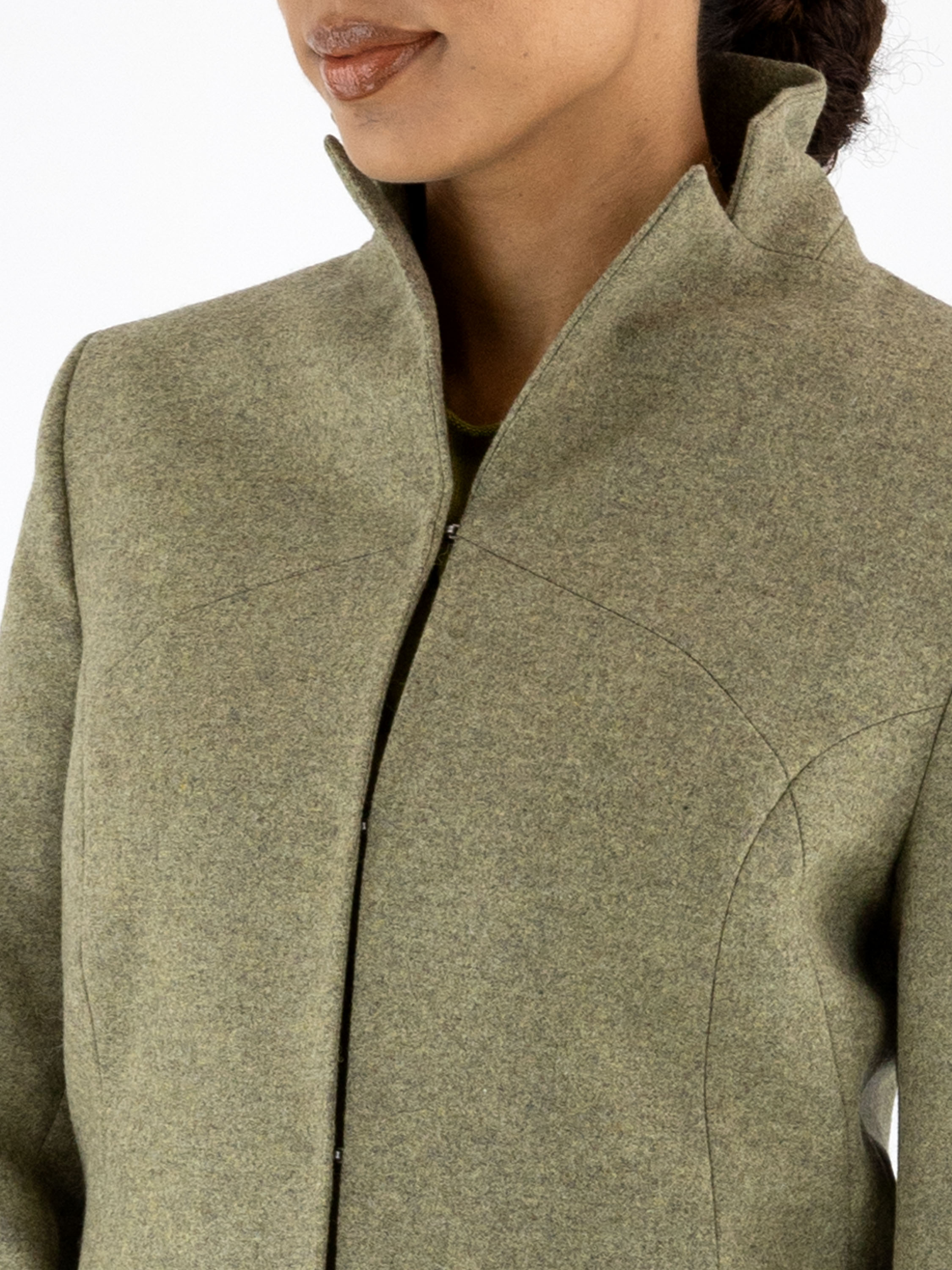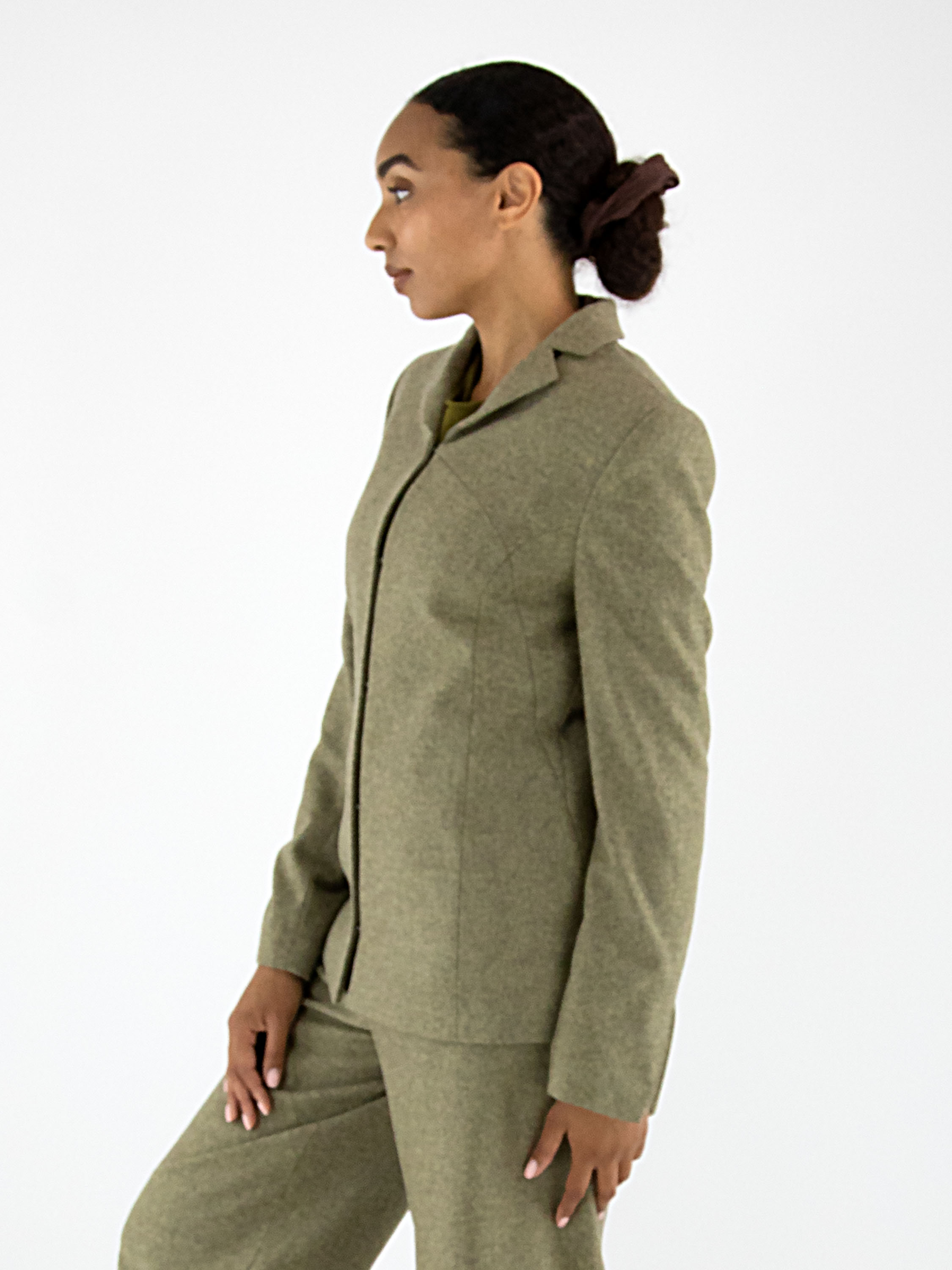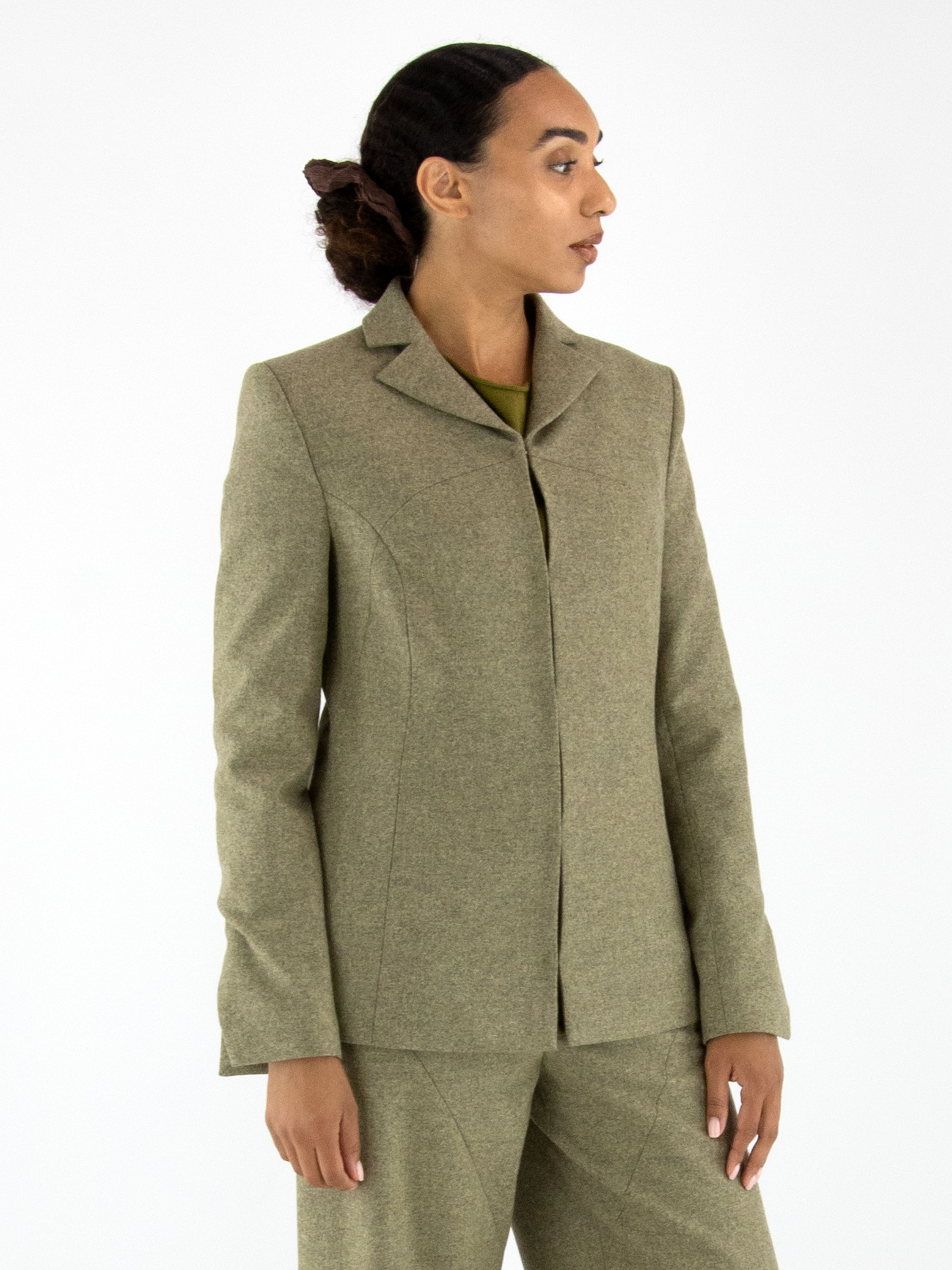 Veste Annette Görtz dans une teinte olive chinée. La fermeture se compose de cinq crochets discrets. Les manches longues sont dotées d’une fente à l’ourlet. La veste est entièrement doublée et ne doit pas être lavée.