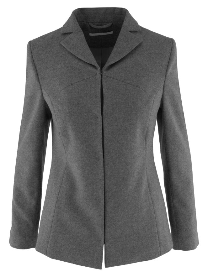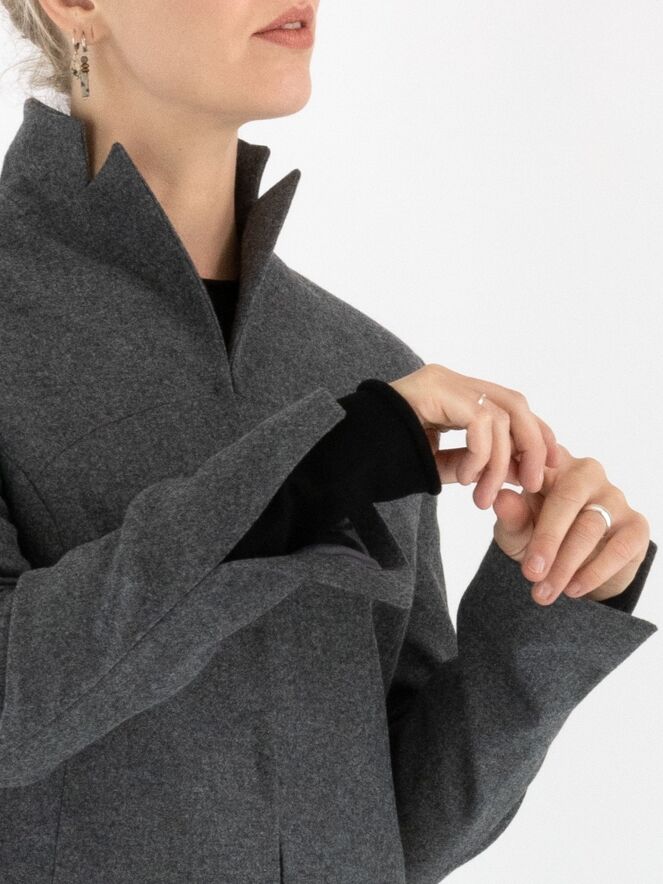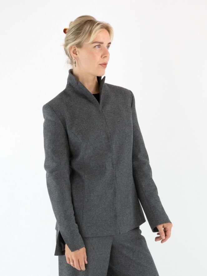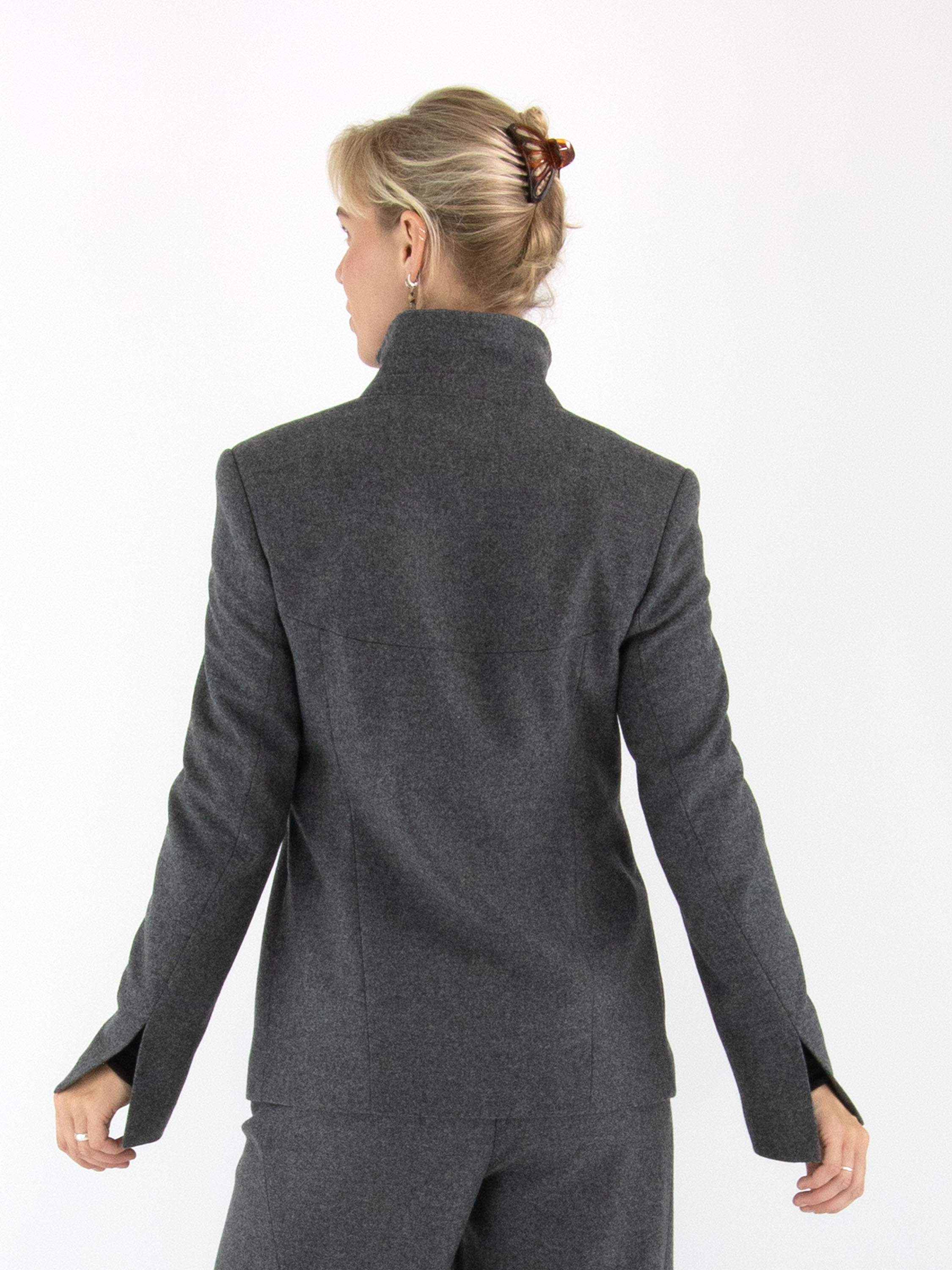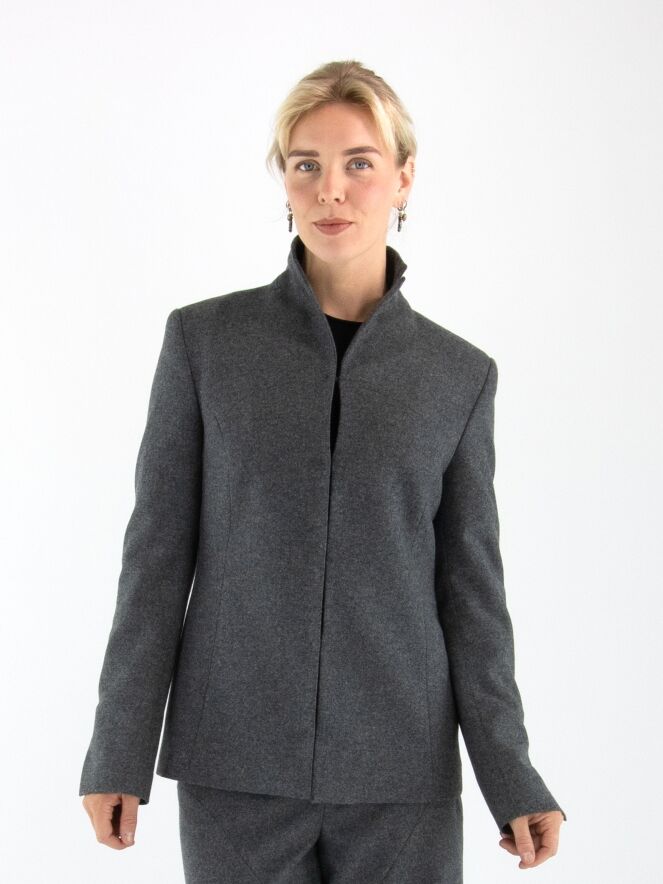 Veste Annette Görtz en gris. La veste se ferme par cinq délicates agrafes. Une fente orne le bas des manches longues. Entièrement doublée, cette veste ne doit pas être lavée.