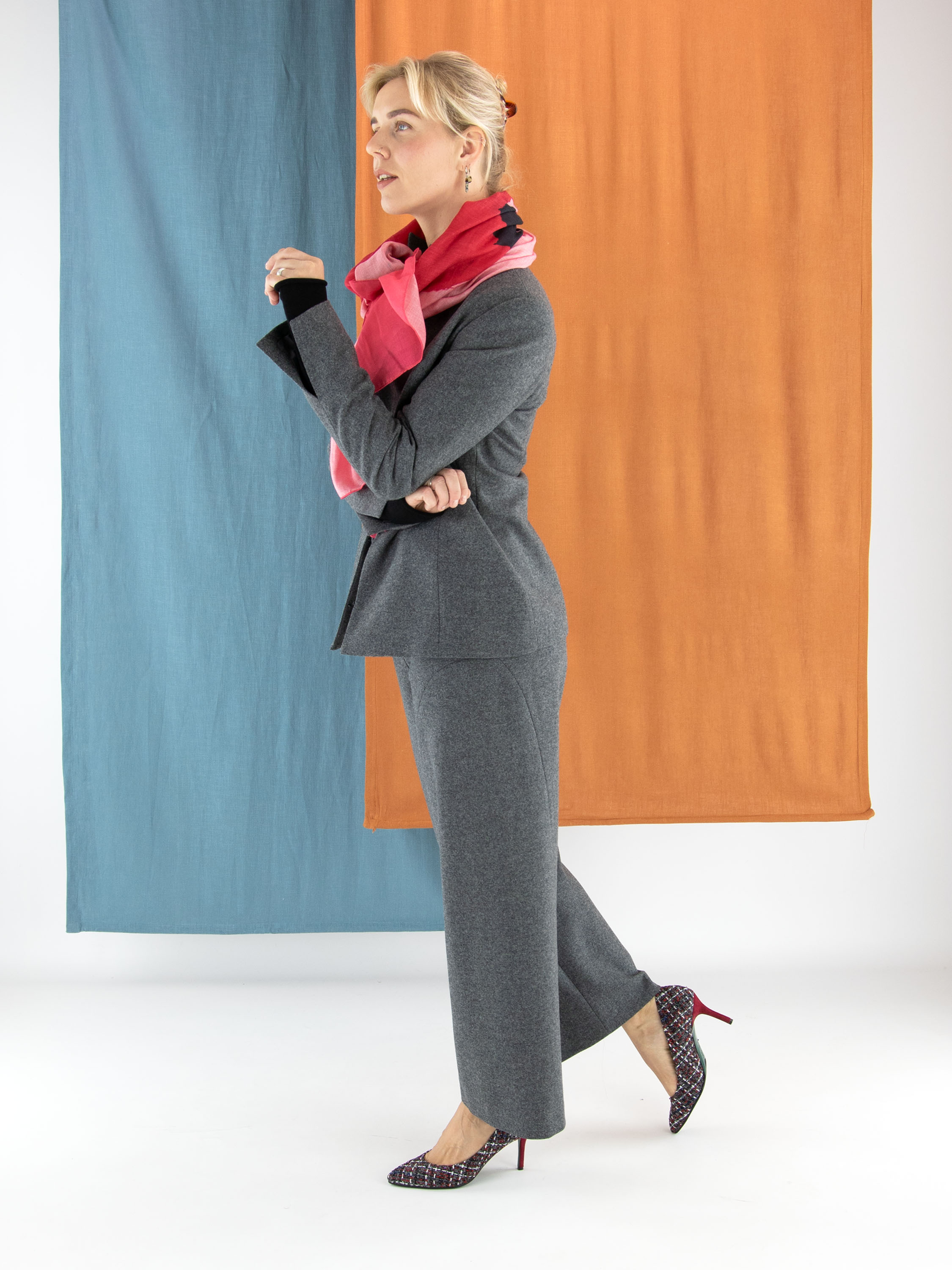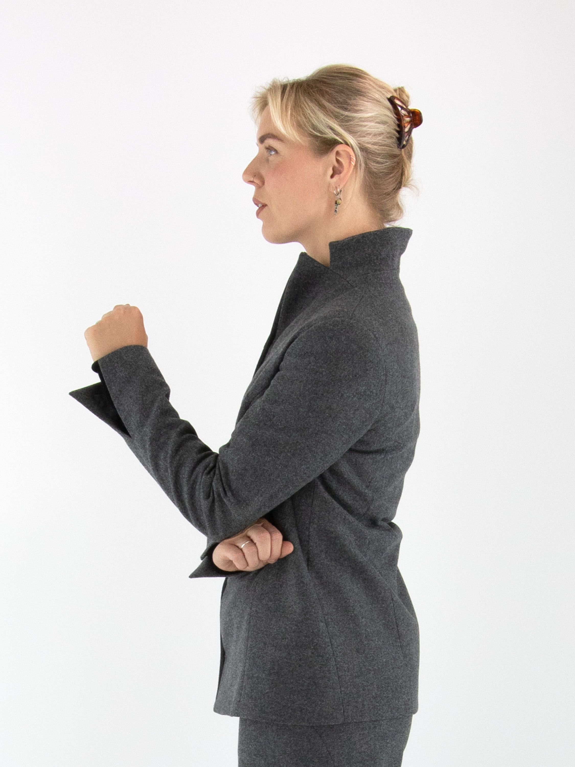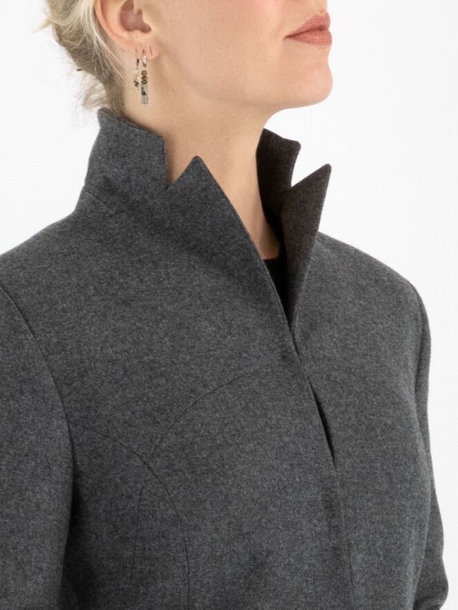 Veste Annette Görtz en gris. La veste se ferme par cinq délicates agrafes. Une fente orne le bas des manches longues. Entièrement doublée, cette veste ne doit pas être lavée.