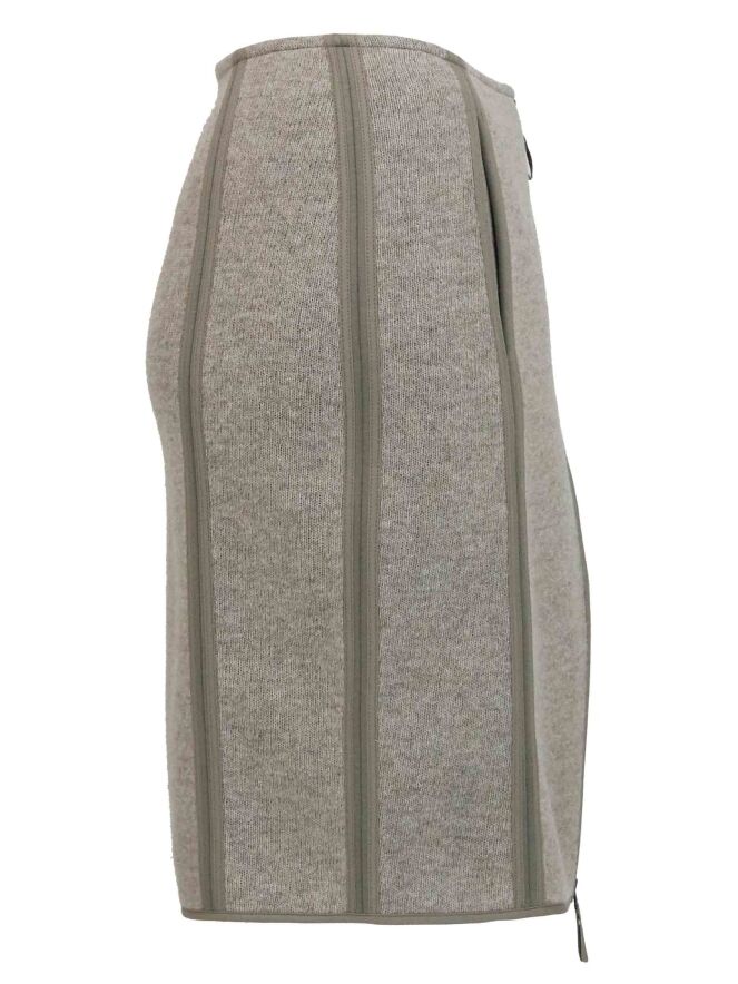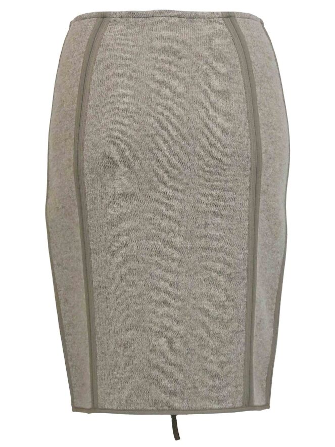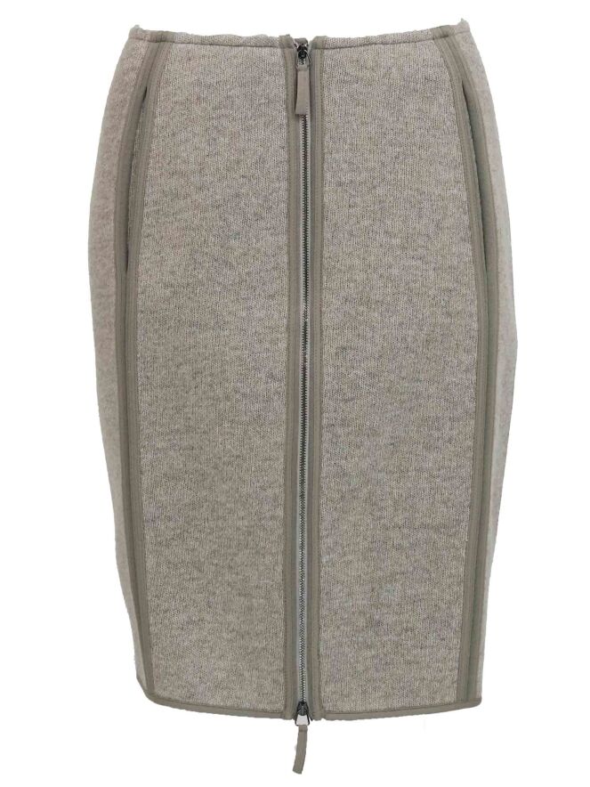 Jupe droite tombant juste au-dessus du genou, de la marque Annette Görtz, de couleur beige. Elle est ornée de passepoils verticaux sur les côtés, l'arrière et de chaque côté de la fermeture Eclair avant centrale. La jupe n'est pas doublée. Lavage à la main.