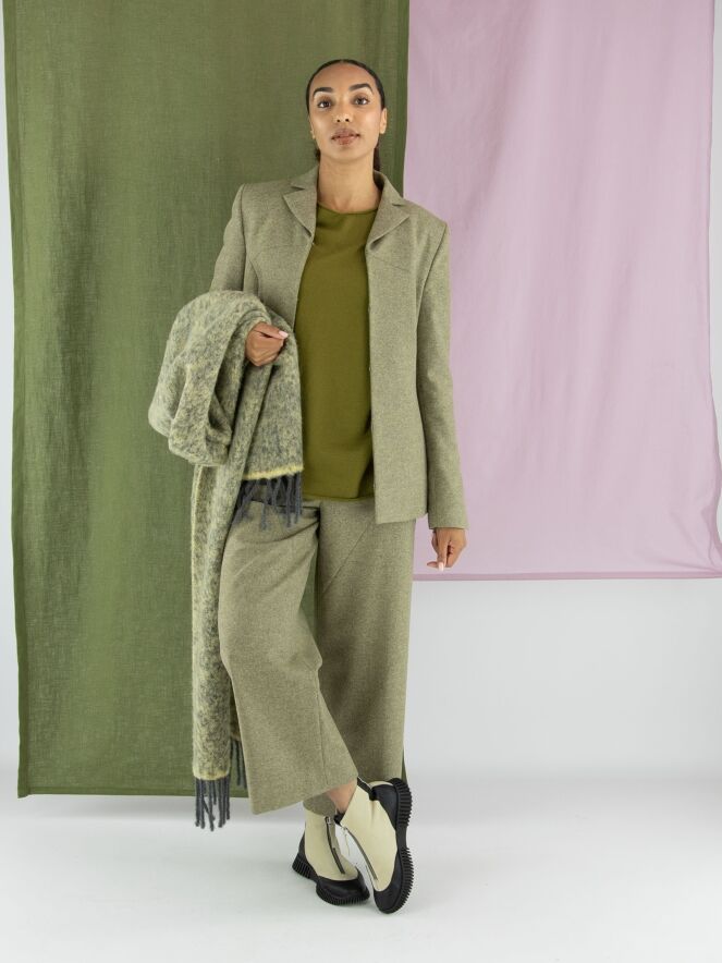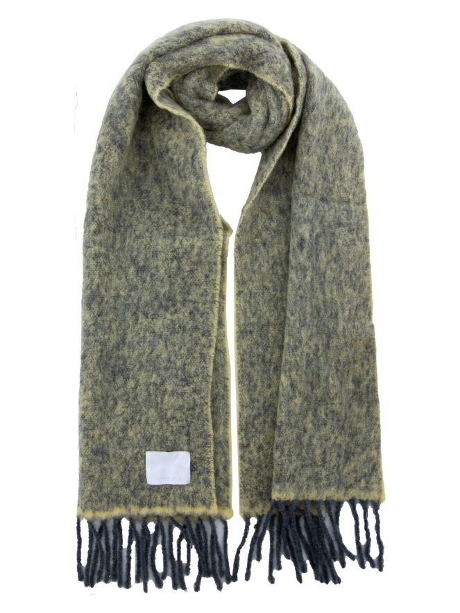 Châle luxueux Annette Görtz dans une teinte vert citron chiné, mélangée avec du gris. Les extrémités du châle sont ornées de longues franges grises. Ce châle doit être lavé à la main.