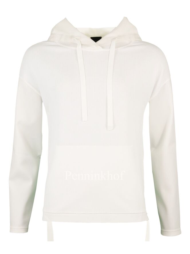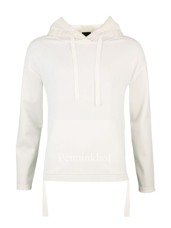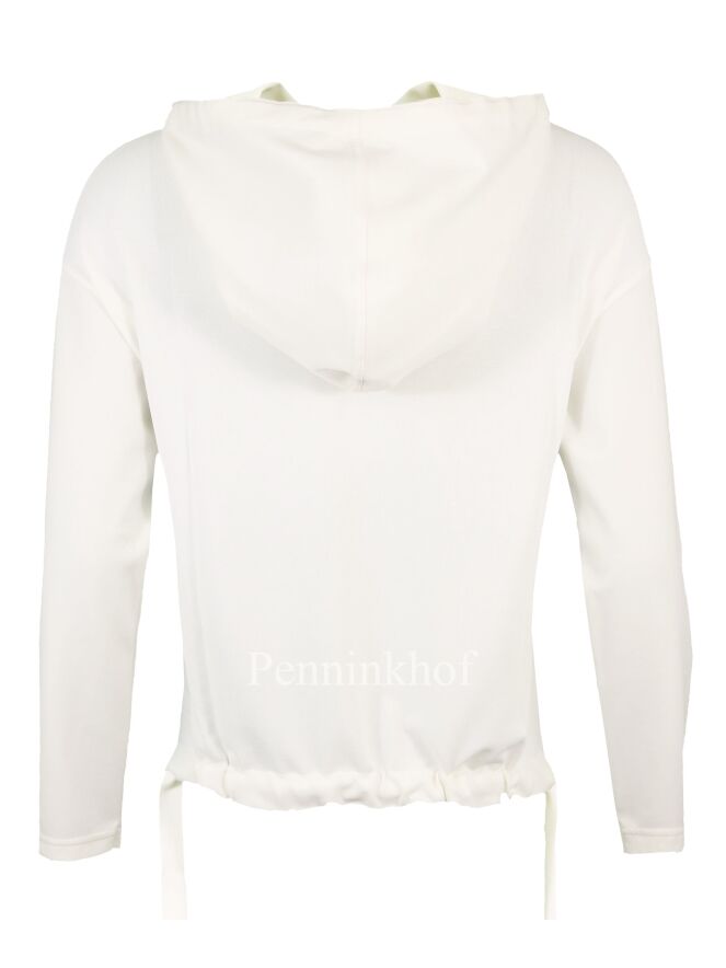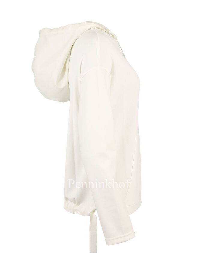 Pull-over au look sportif à manches mi-longues, de la marque Annette Görtz, de couleur blanc crème. Capuchon à rubans en satin mat réglables, ainsi qu'au bas du dos. Large poche sur le devant du pull. Lavage à la main.