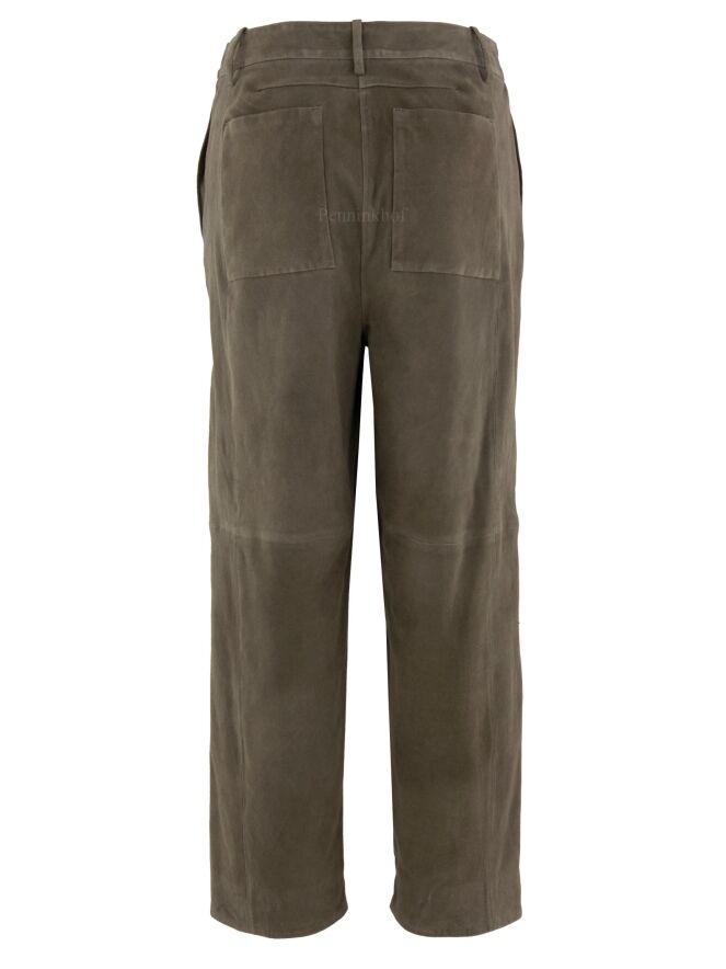 Pantalon droit en cuir d'Annette Görtz de couleur taupe. Le pantalon a des poches latérales. Ce pantalon ne doit pas être lavé.