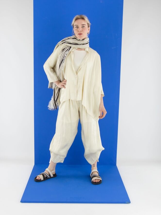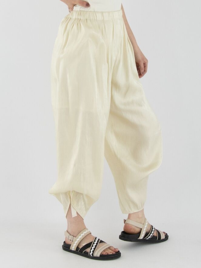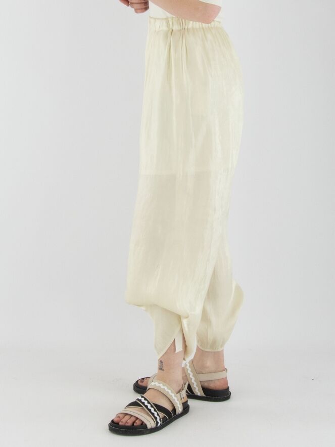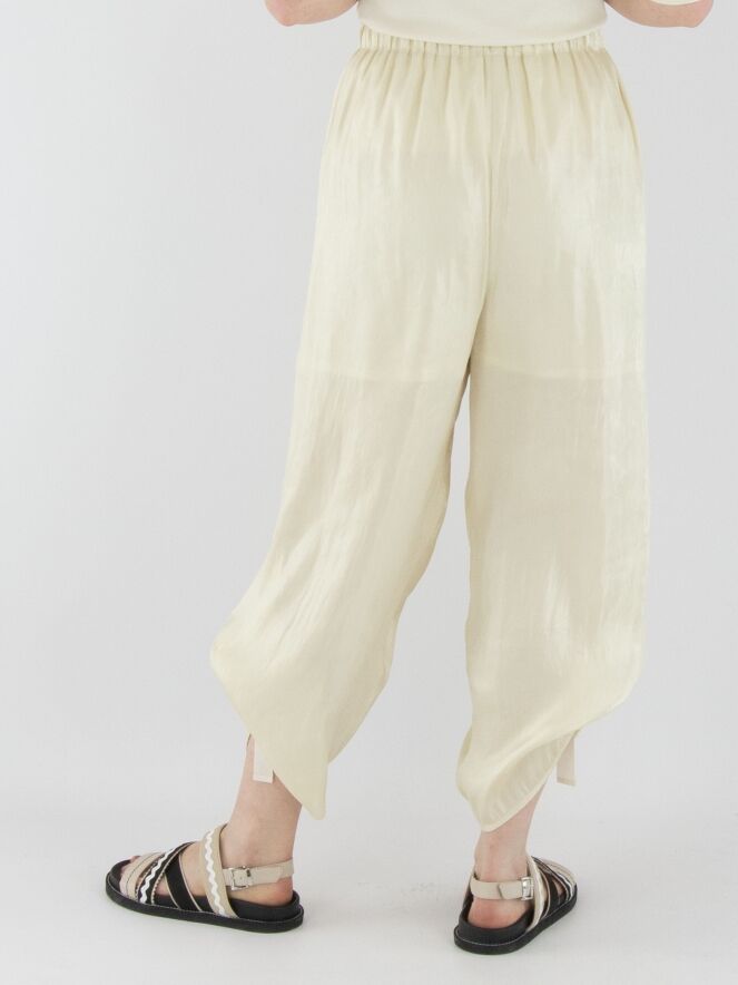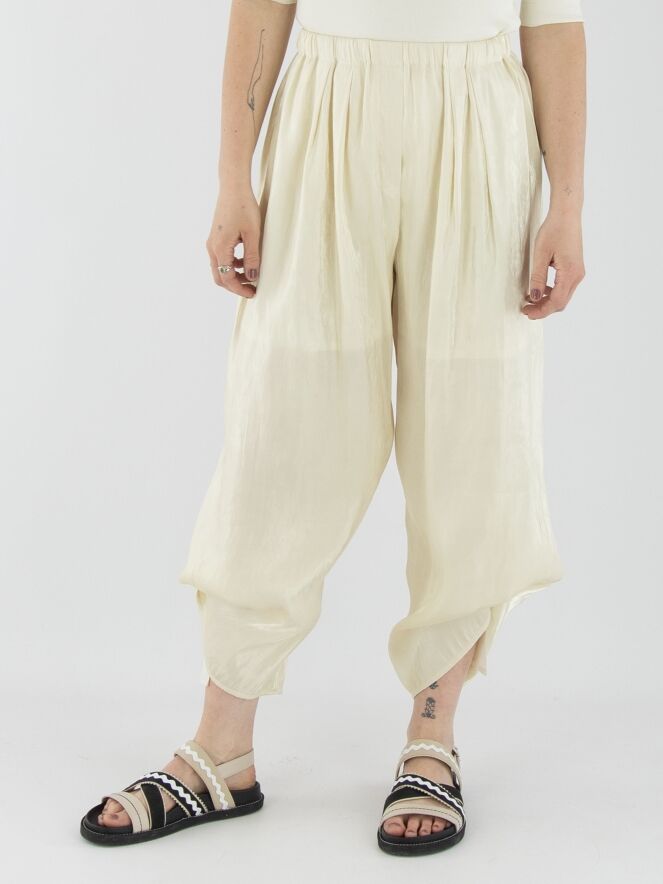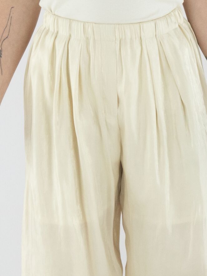 Un pantalon d'Annette Görtz en satin mat avec un imprimé chiné en beige. La taille est dotée d'une bande élastique finement plissée. À l'intérieur du pantalon, un ruban avec des boutons permet de créer des effets plissés et d'ajuster la longueur selon les envies. Ce pantalon peut être lavé à 30 degrés.