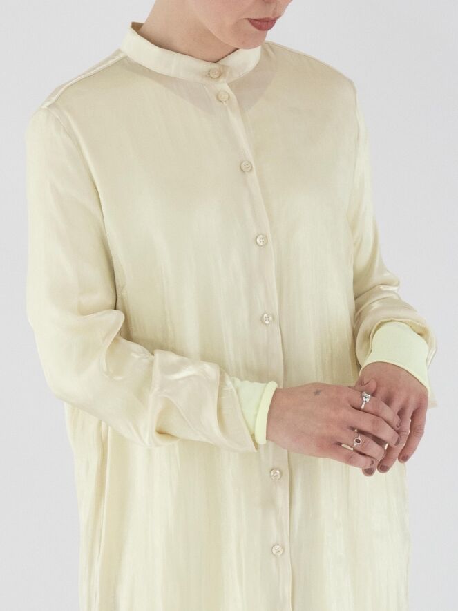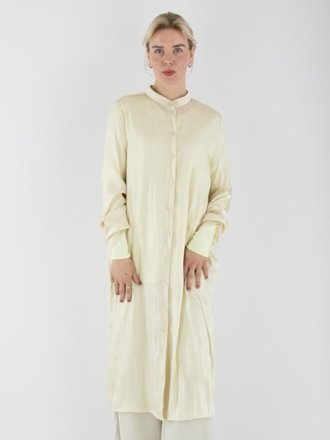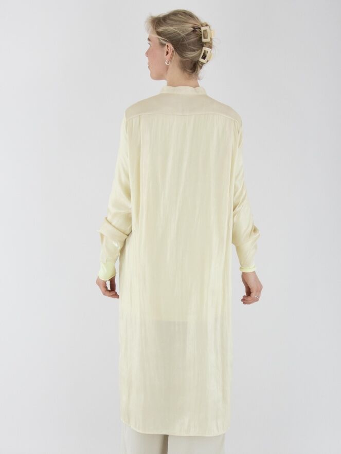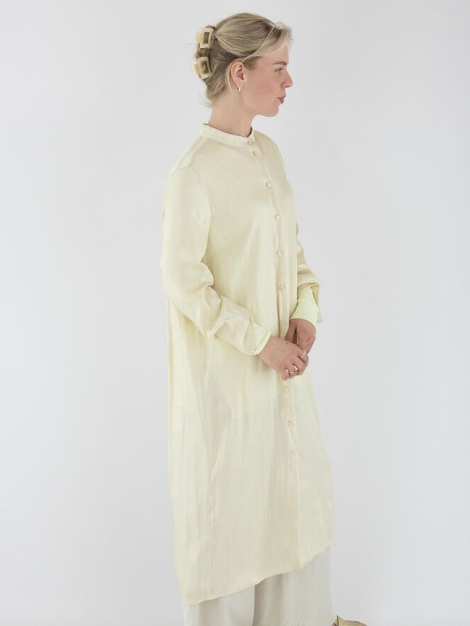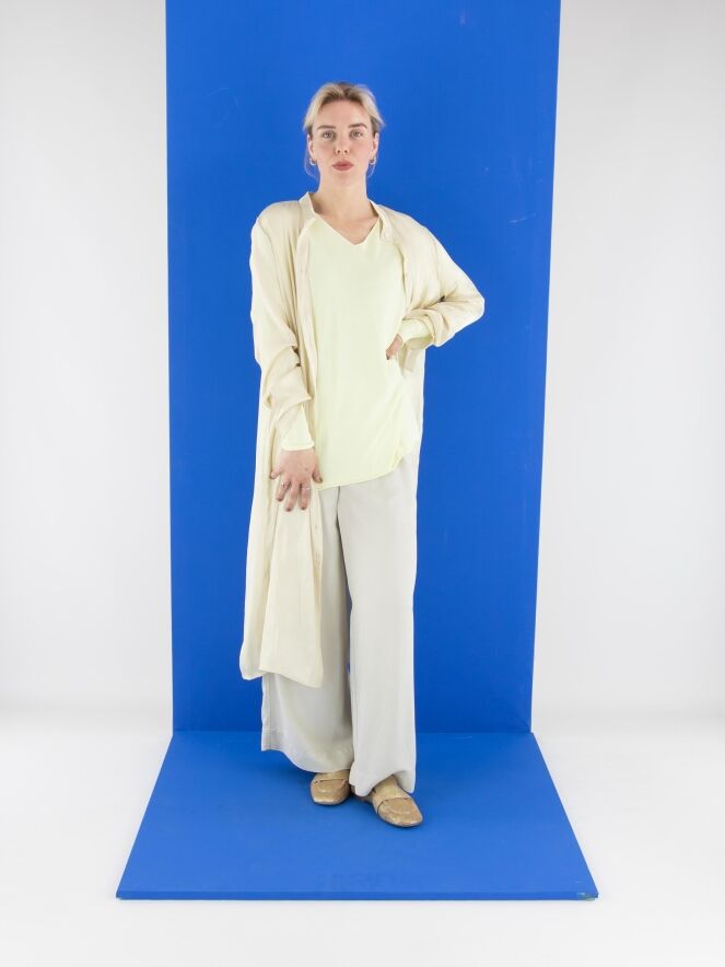 Une blouse longue d’Annette Görtz en satin mat avec un imprimé chiné dans les tons beige. Les manches sont dotées d’un lien avec des boutons permettant de les raccourcir de manière ludique. À l’arrière, une couture horizontale court sous les épaules avec un pli de chaque côté. Cette blouse peut être lavée à 30 degrés.