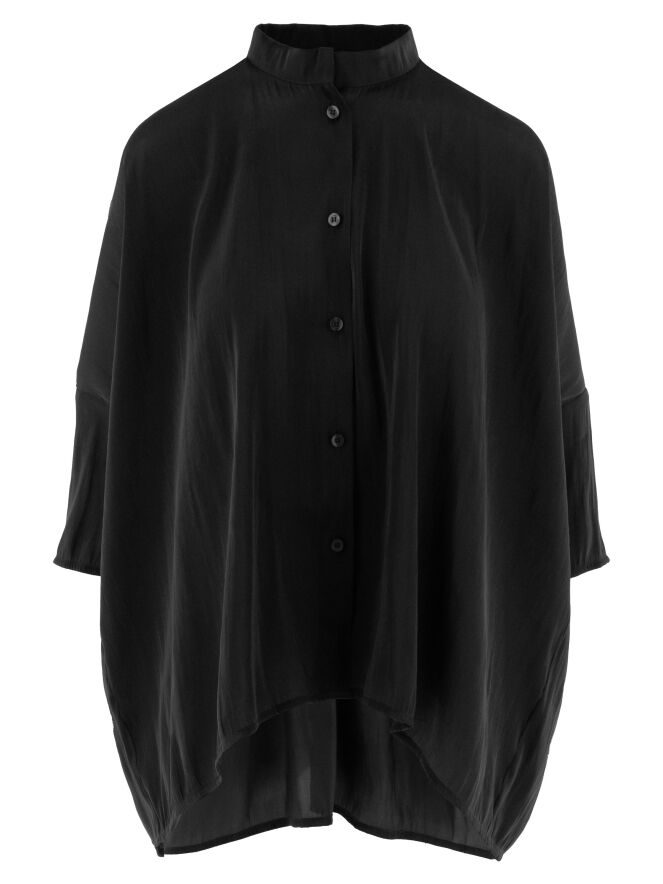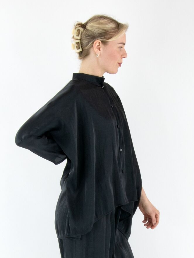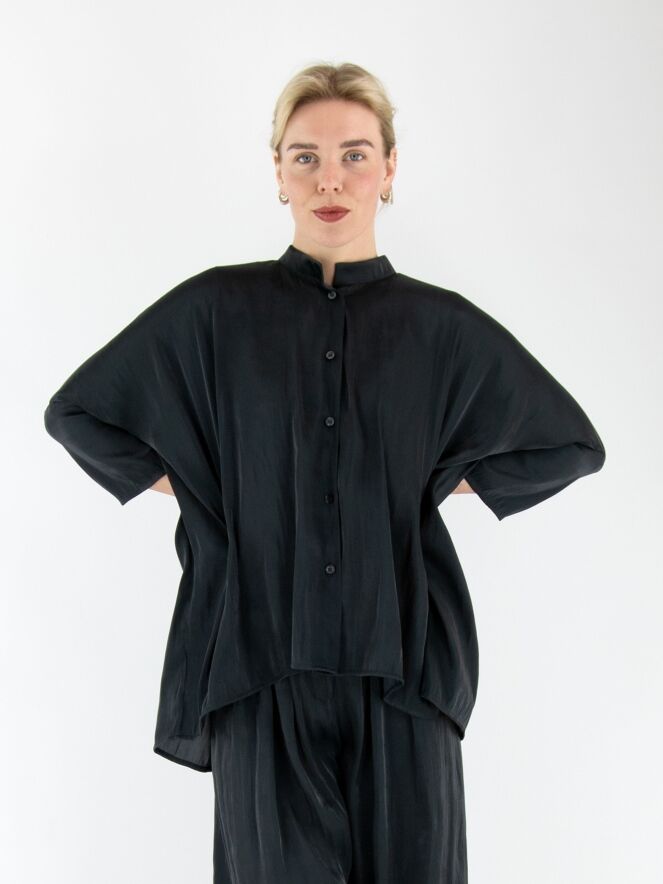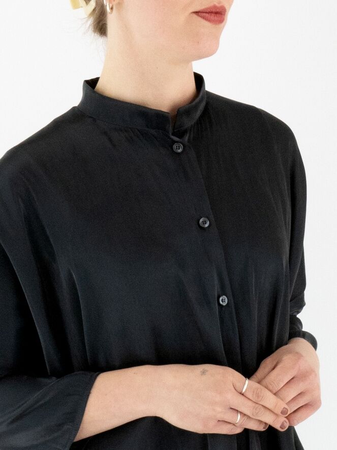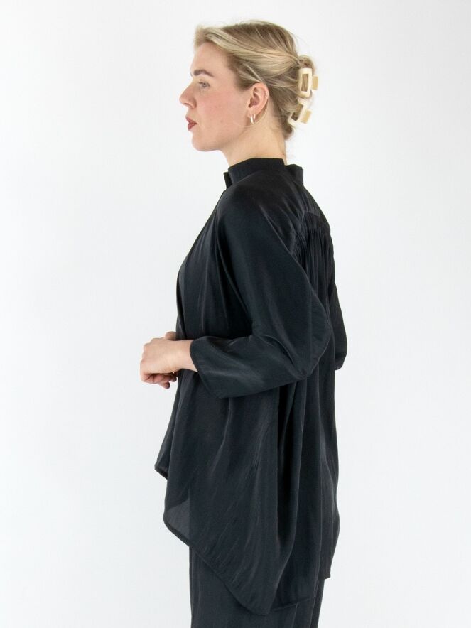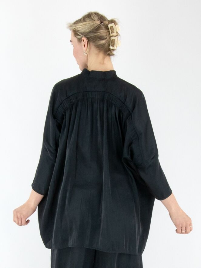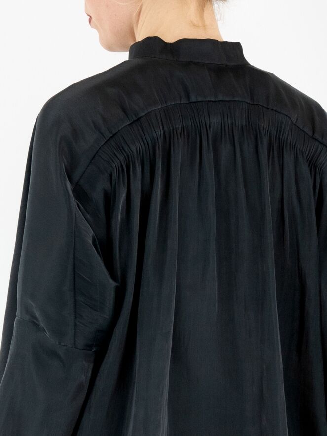 Une blouse ample d'Annette Görtz en satin mat avec un imprimé chiné en anthracite. À l'arrière, sous les épaules, une couture horizontale intègre un plissé délicat du tissu. Cette blouse peut être lavée à 30 degrés.