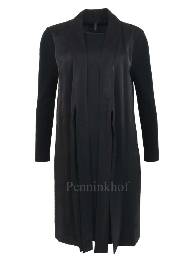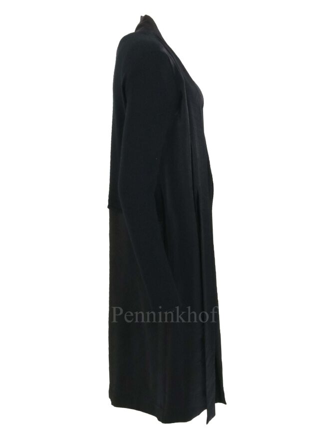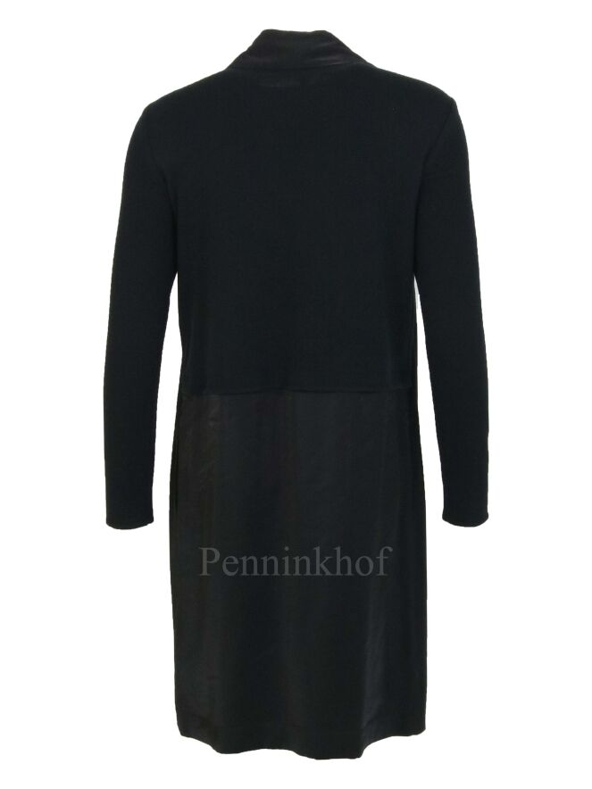 Robe à long col châle de la marque Annette Görtz, de couleur noire. Sur le devant, le tissu est satiné. Le dos et les manches sont en tricot mélangé. La robe présente un style gilet dont la fermeture se fait par une ceinture descendant du col. Lavage à la main.
