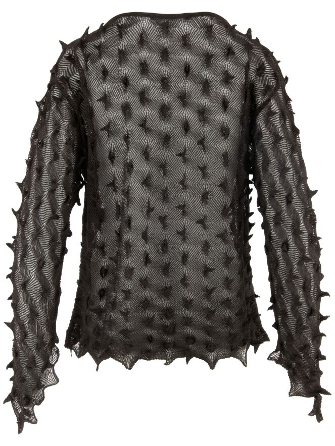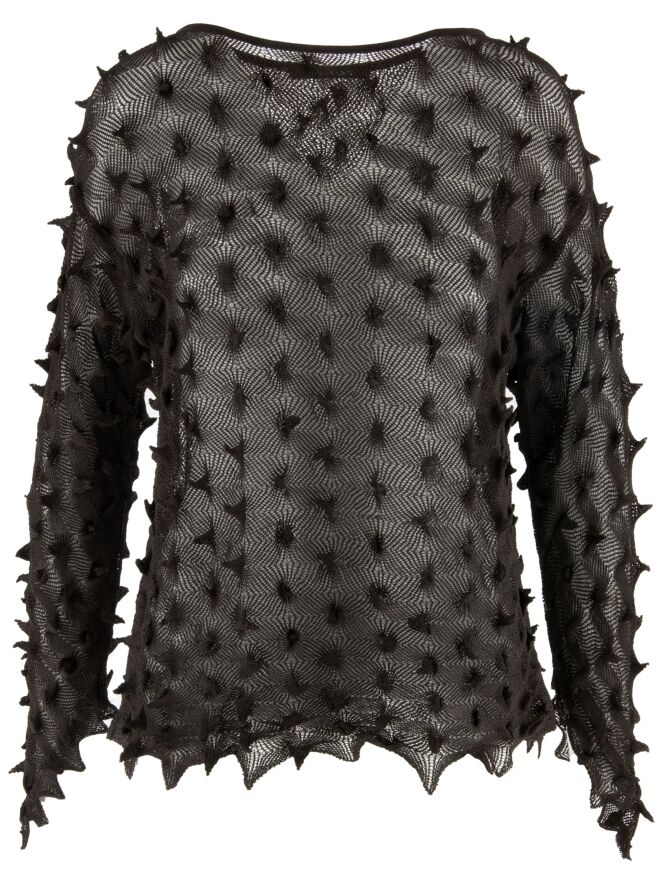 Un pull ajouré d’Annette Görtz dans une teinte brun moka. Le pull est orné de picots décoratifs disposés en motif de blocs. Il présente une encolure ronde et des manches longues. Ce pull peut être lavé à la main.