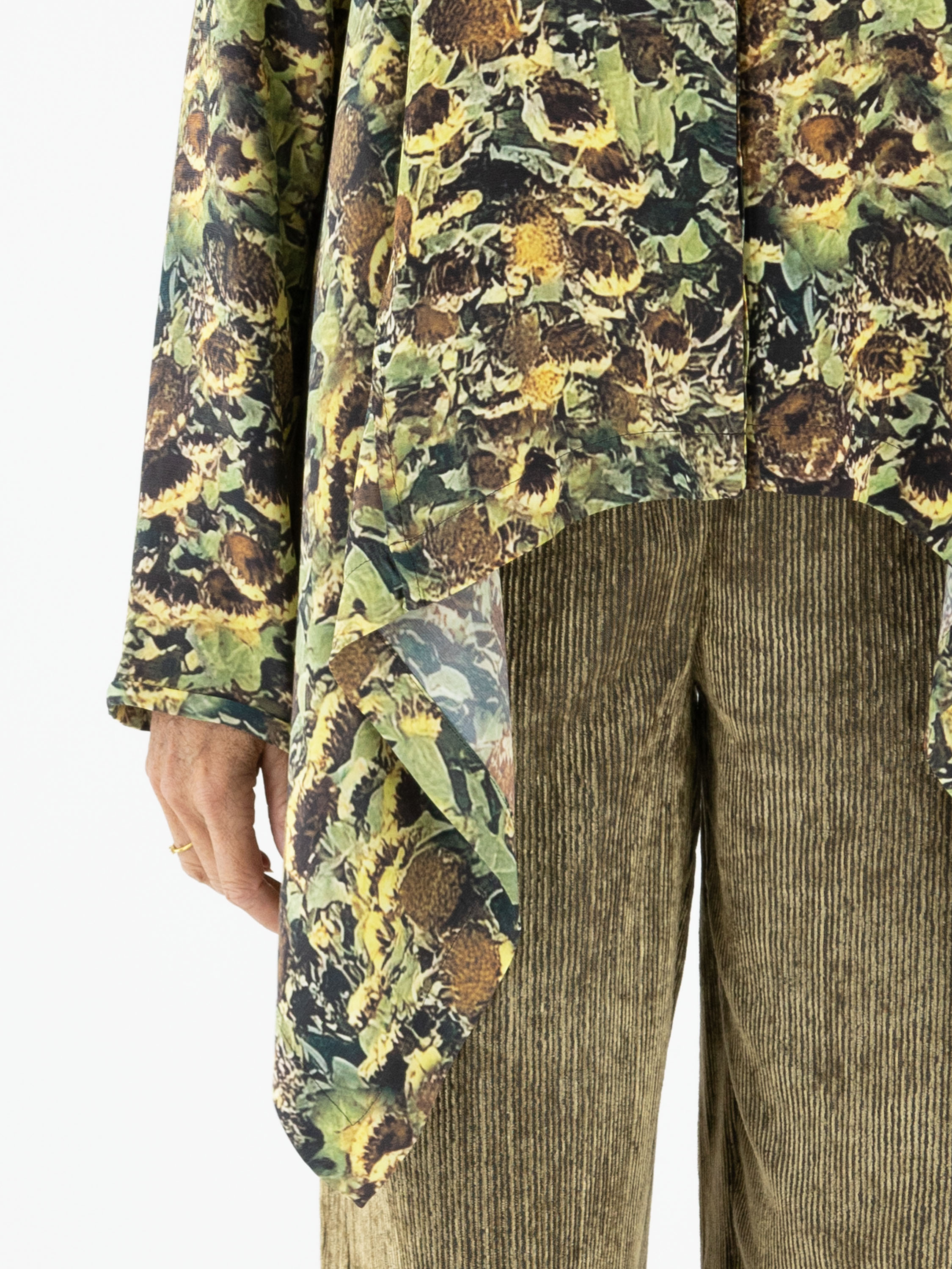 Blouse d’Annette Görtz ornée d’un motif artistique de tournesols fanés dans des tons de jaune, vert olive, brun et noir. Dotée d’une patte de boutonnage dissimulée et d’un surplus de tissu sur les côtés, elle crée un effet drapé raffiné avec des pointes discrètes. Cette blouse de créateur exclusive peut être lavée à la main.