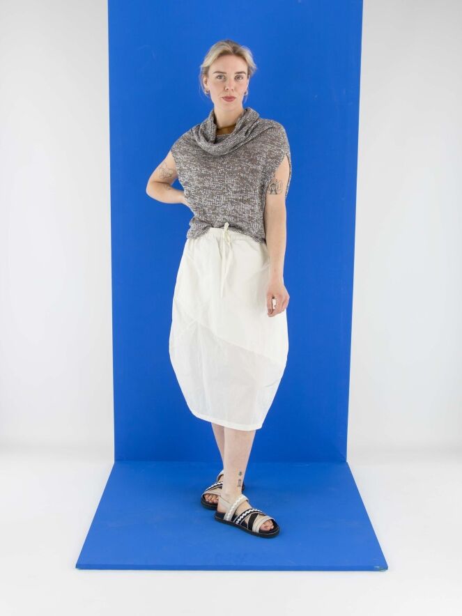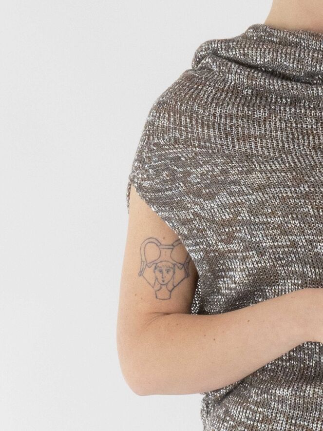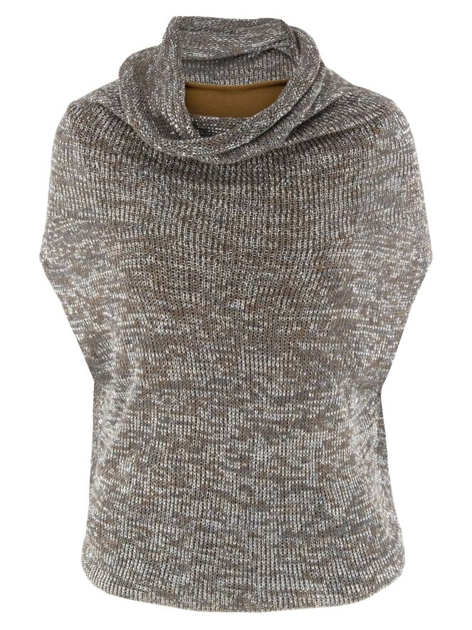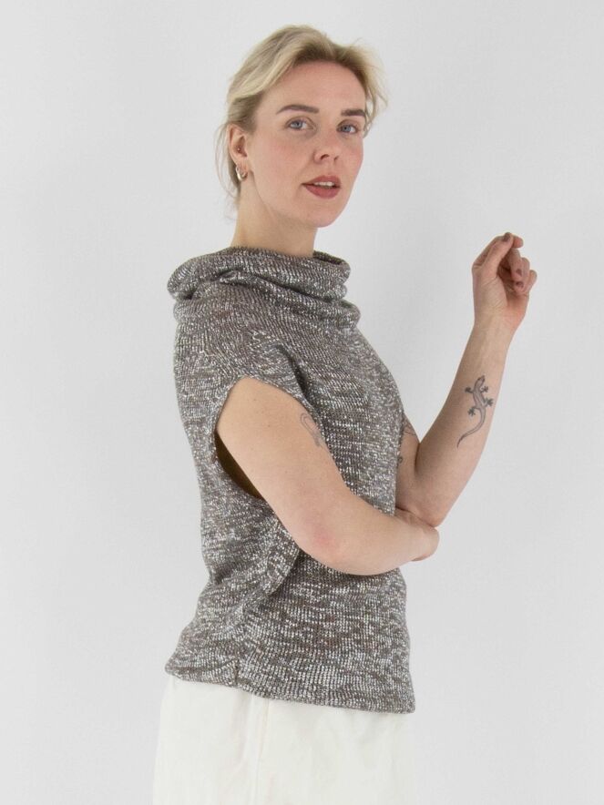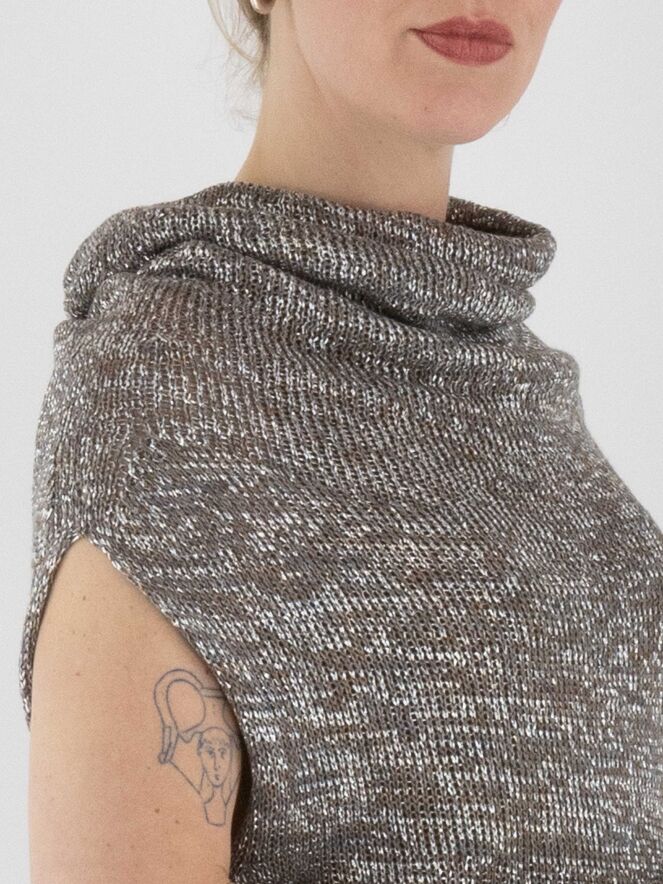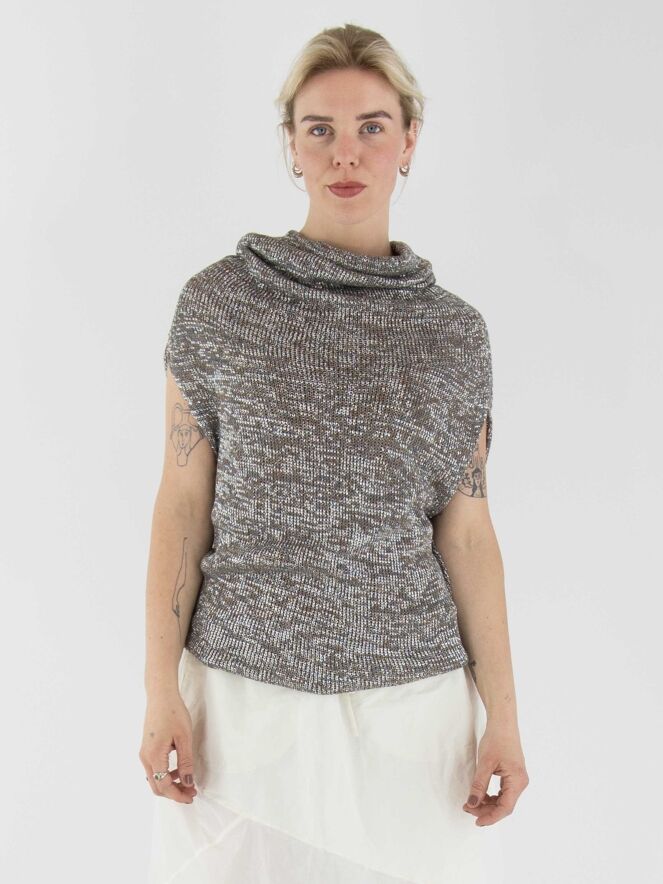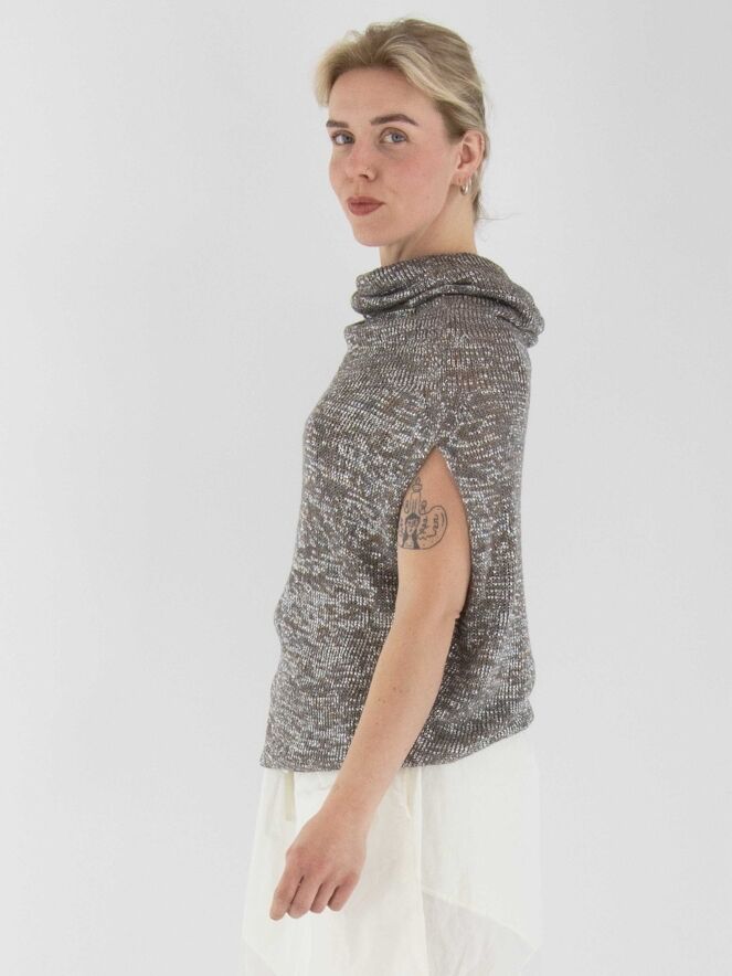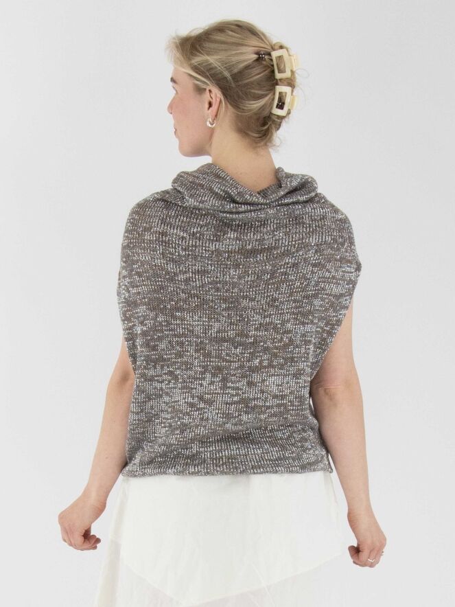 Un gilet chiné, tricoté dans une structure en relief avec des nuances de taupe, de gris et d'argent. Le top est accompagné d'un sous-top en couleur cognac. Il présente un col drapé et doit être lavé à la main.