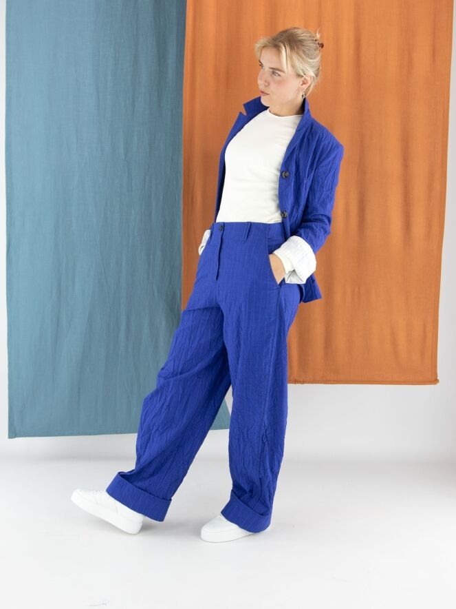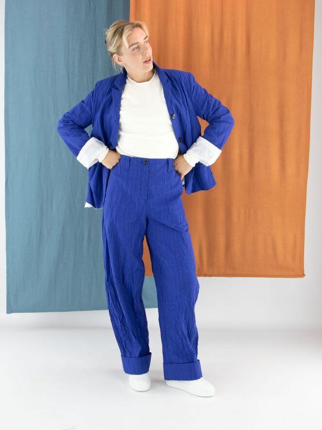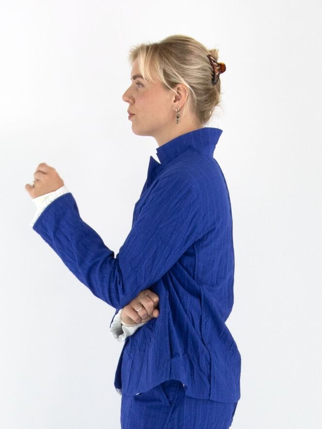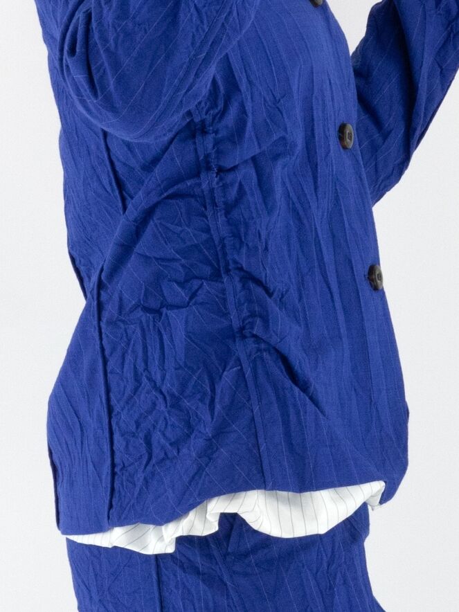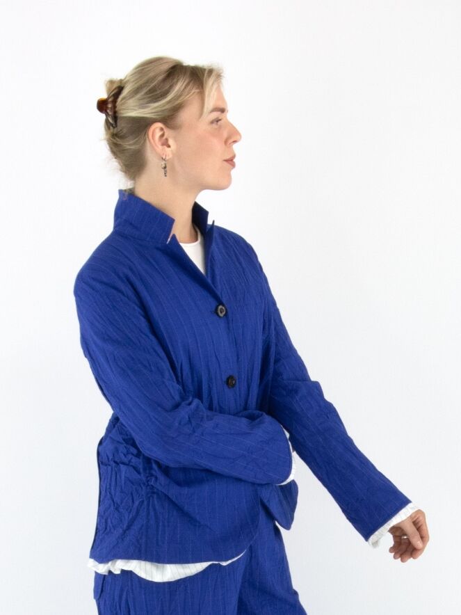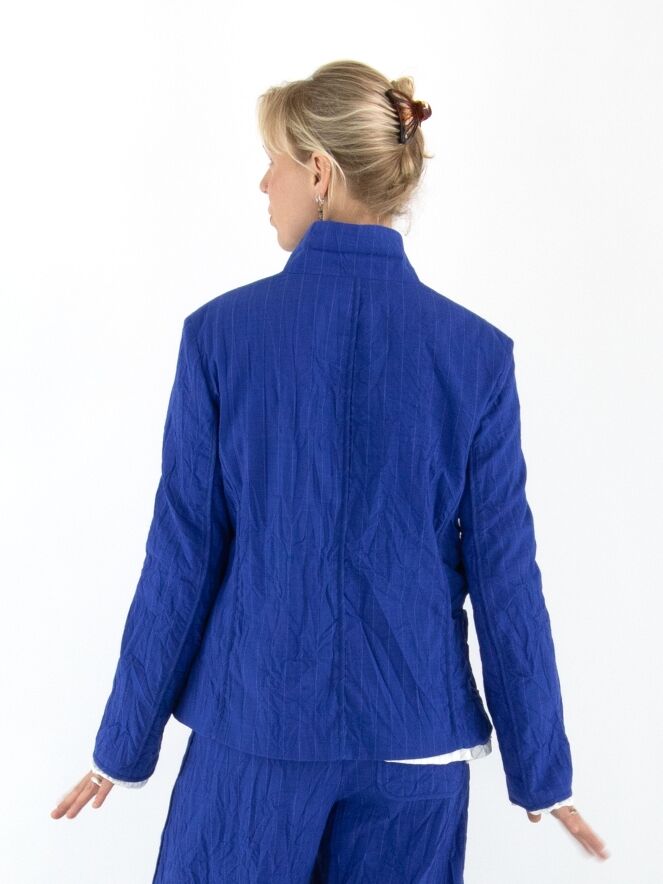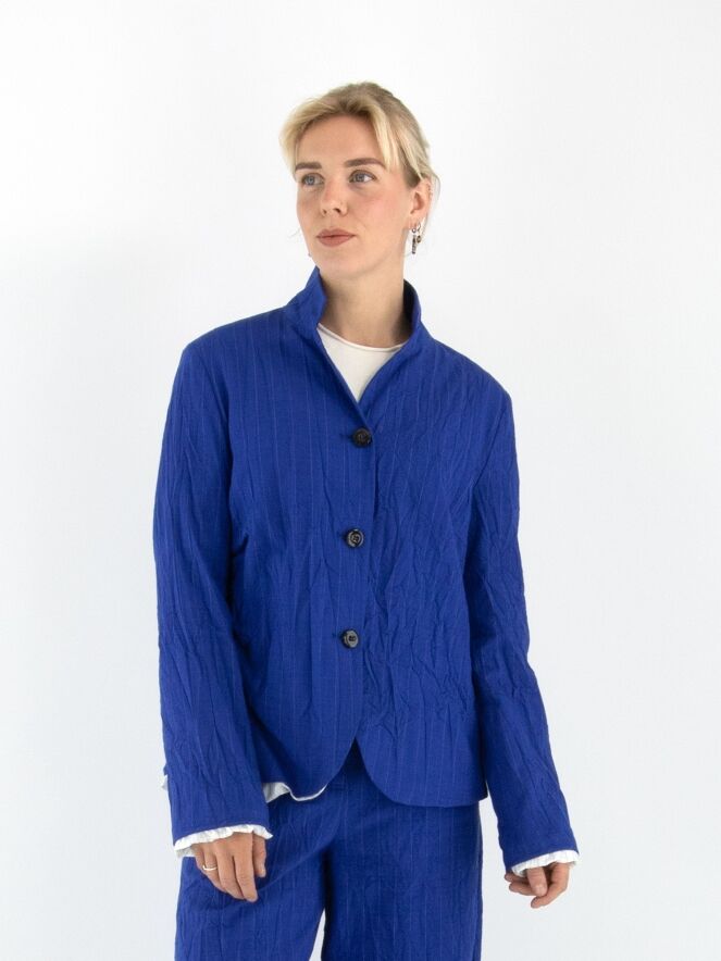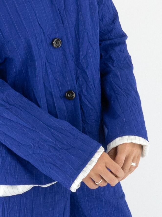 Veste Annette Görtz à rayures fines dans les tons bleu roi et blanc cassé. Le tissu est froissé, avec de fines fronces le long de la couture du côté droit. La doublure à rayures blanches apparaît subtilement sous l’ourlet de la veste et au bas des manches longues. La veste se ferme par trois boutons et présente un ourlet arrondi. Cette veste ne doit pas être lavée.