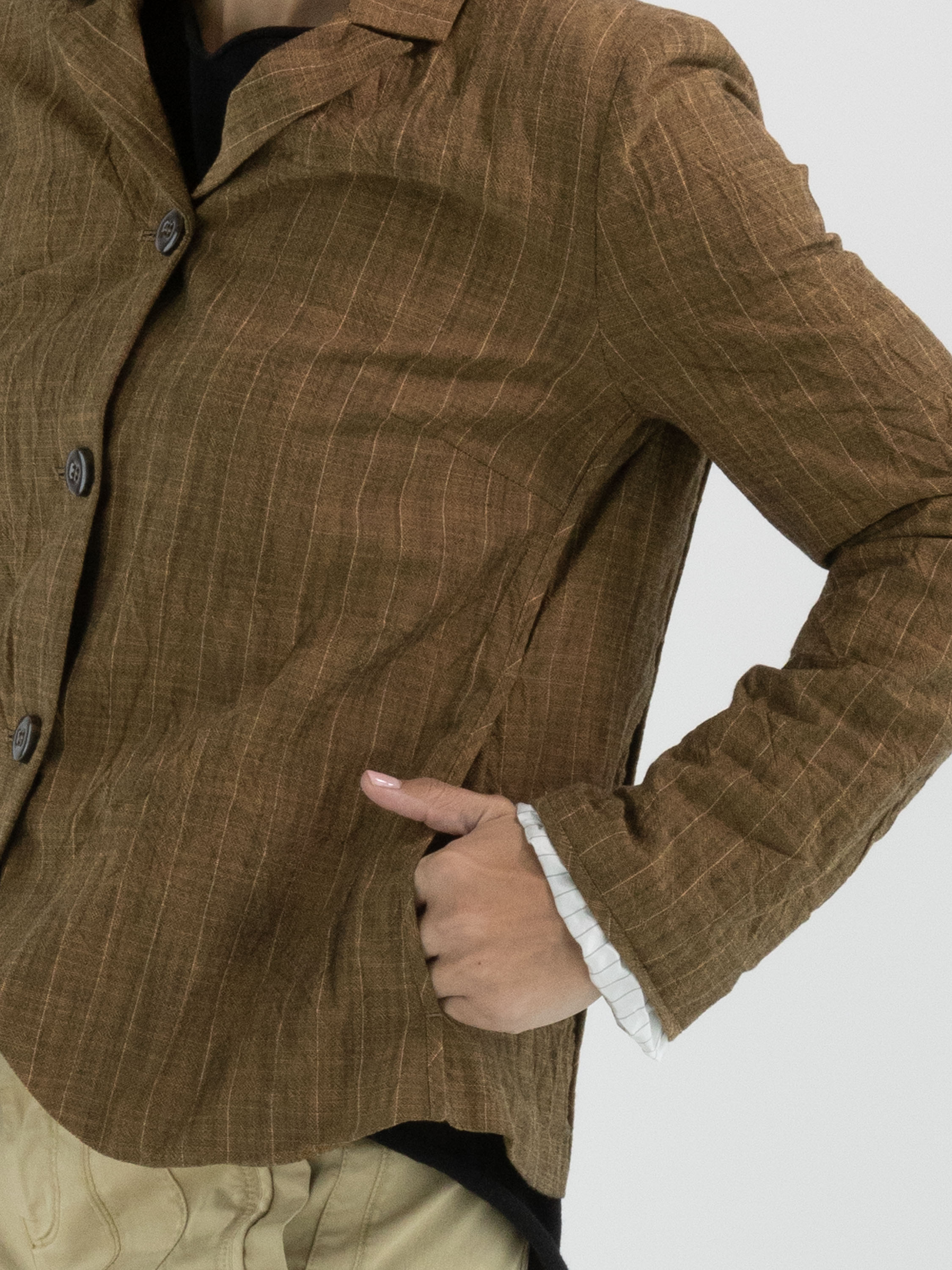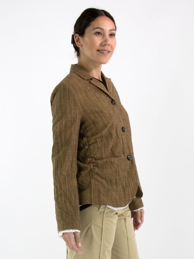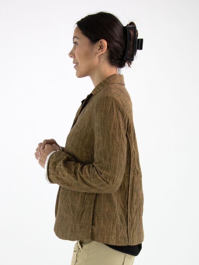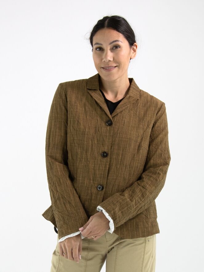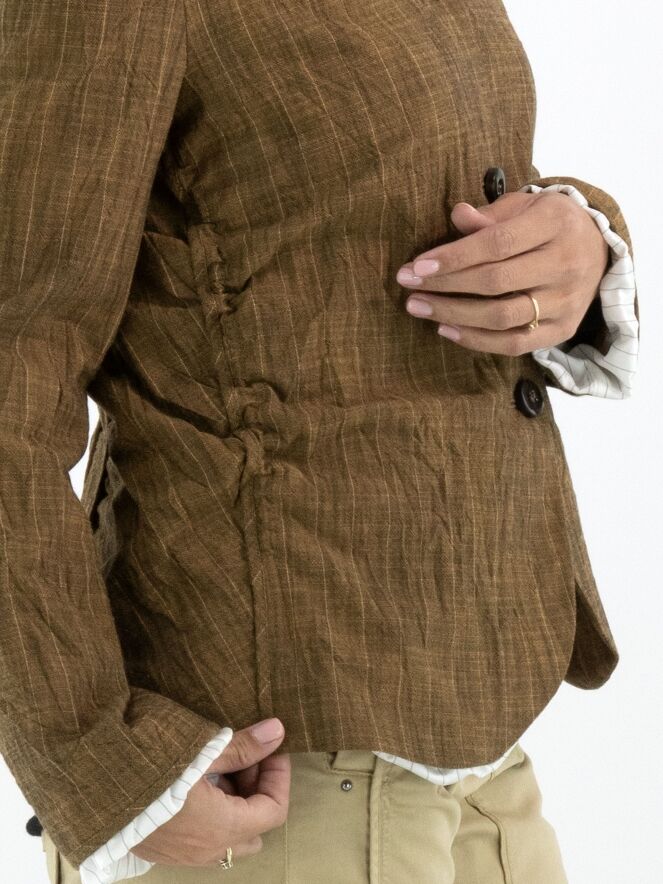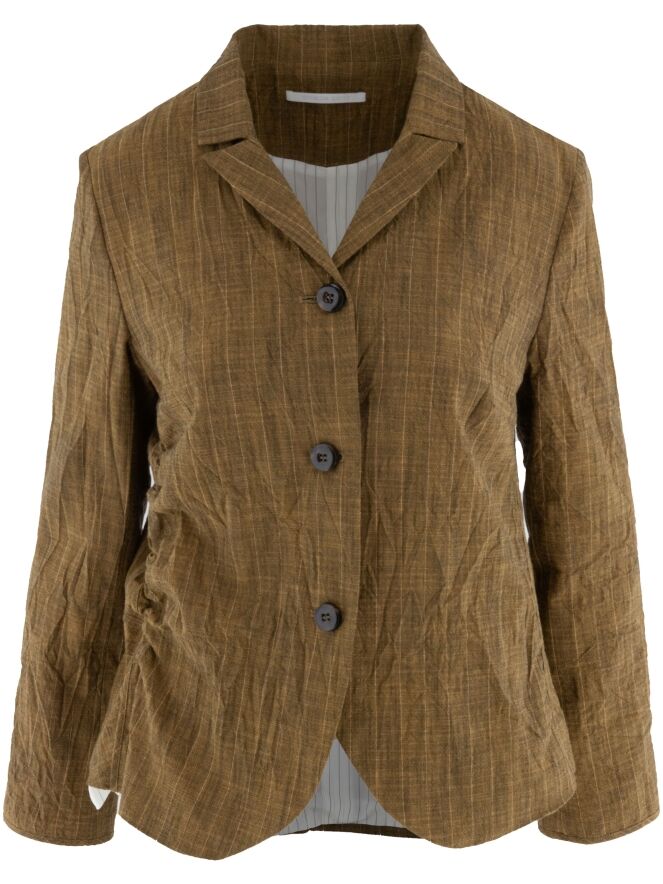 Blazer Annette Görtz à rayures fines dans des tons de moutarde et camel. Le tissu froissé est délicatement plissé le long de la couture latérale droite. La doublure blanche à rayures ressort subtilement en bas de la veste et au bout des manches longues. La veste se ferme par trois boutons et l’ourlet est arrondi. Cette veste ne peut pas être lavée.
