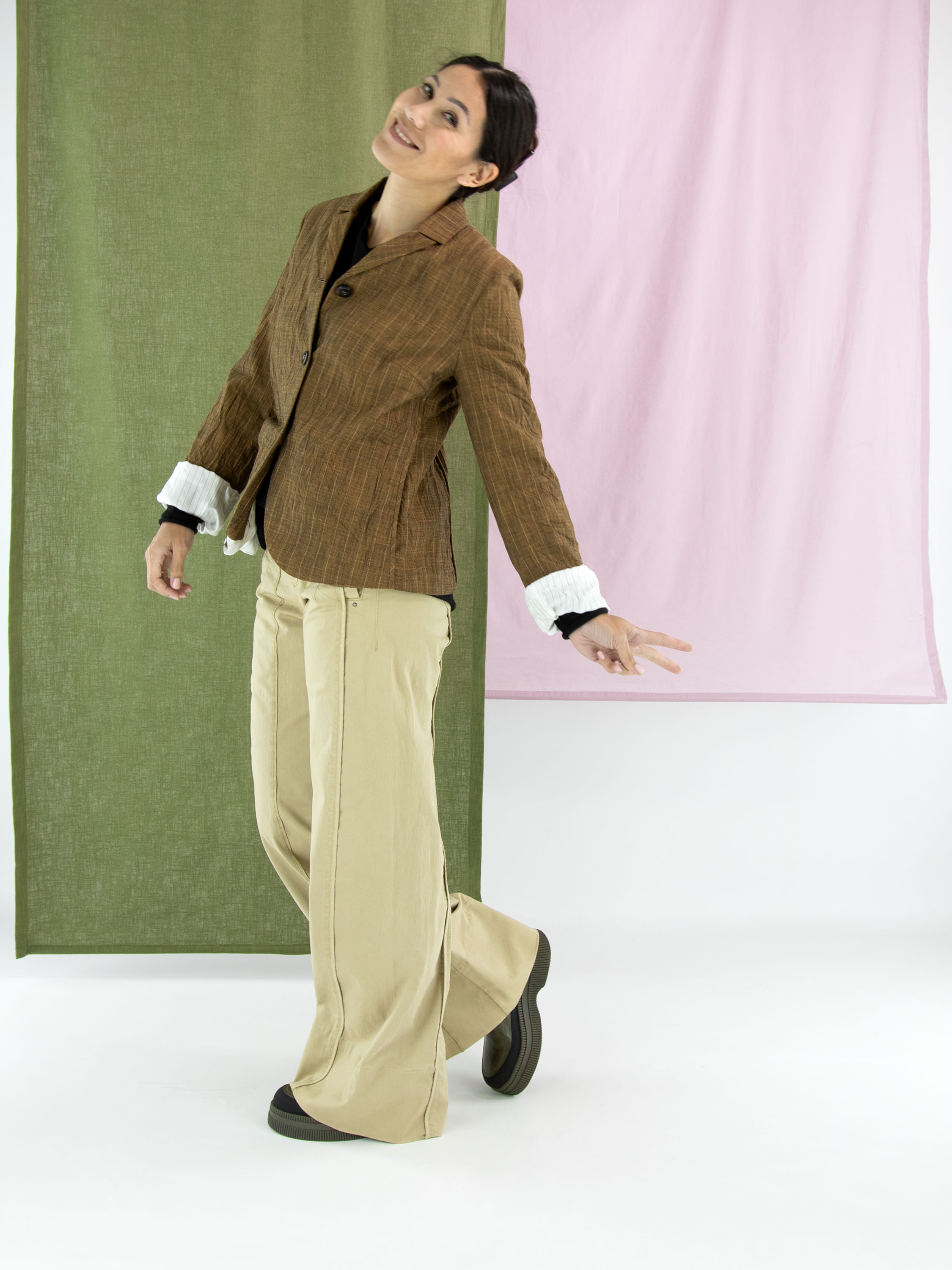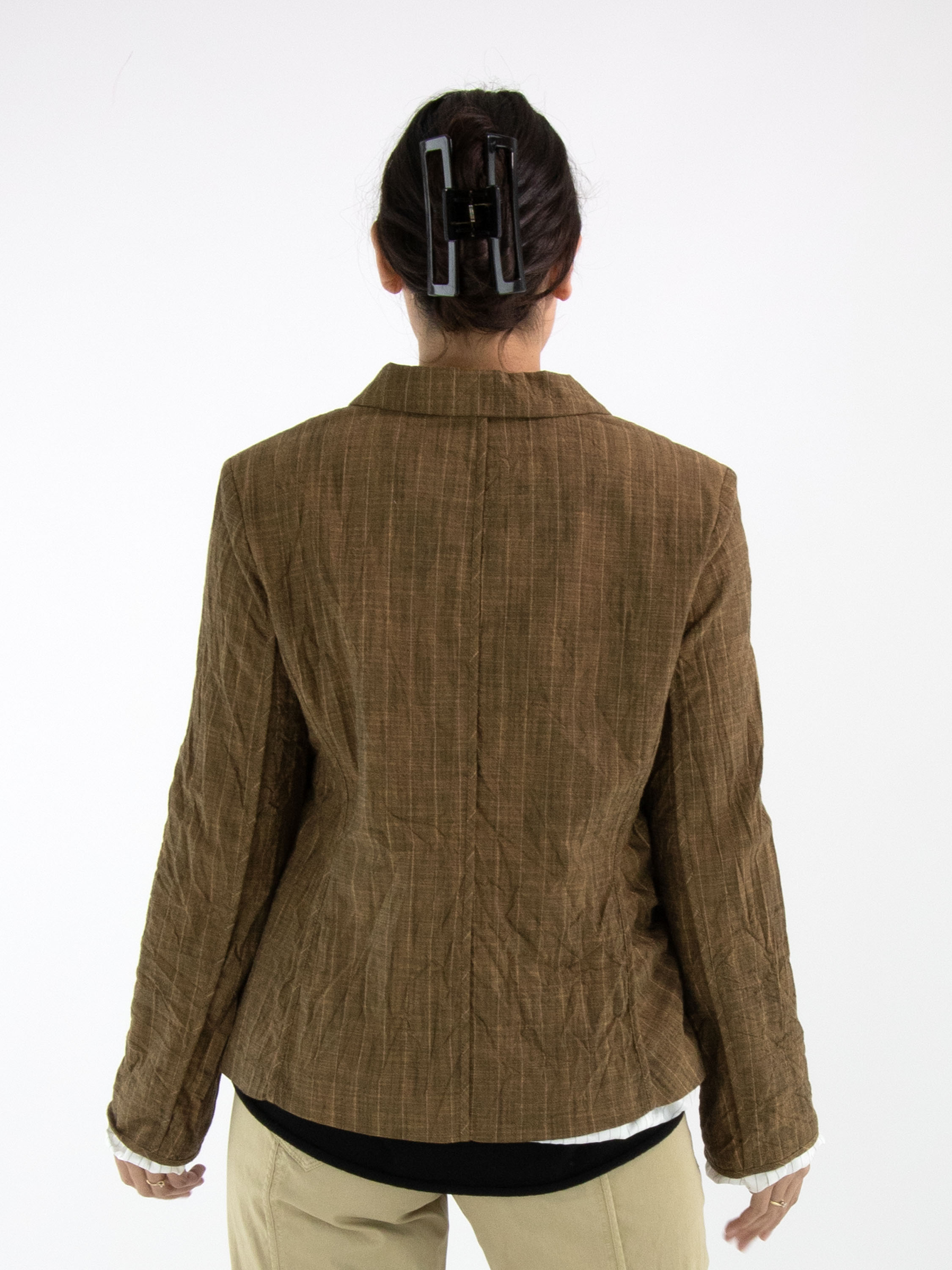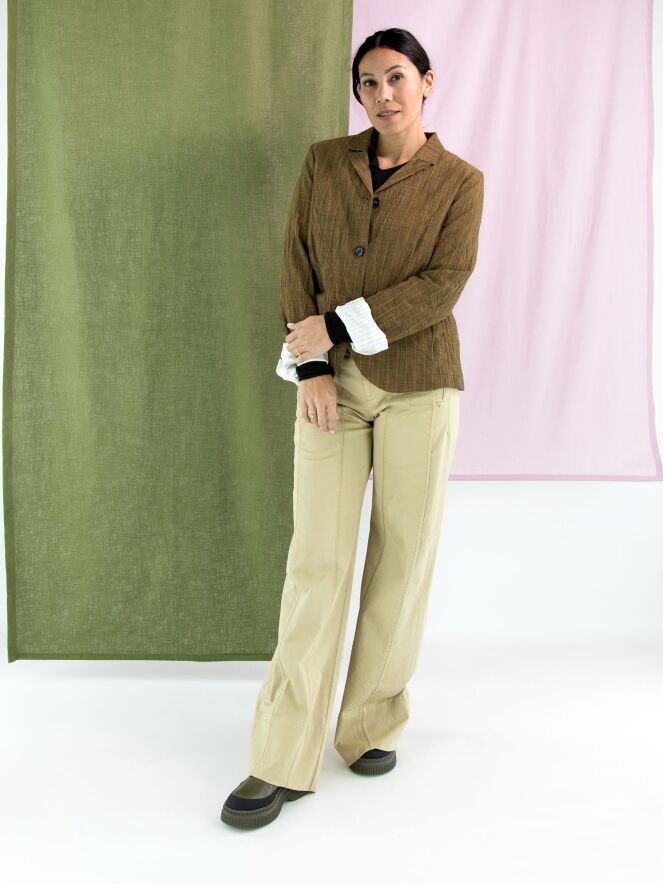 Blazer Annette Görtz à rayures fines dans des tons de moutarde et camel. Le tissu froissé est délicatement plissé le long de la couture latérale droite. La doublure blanche à rayures ressort subtilement en bas de la veste et au bout des manches longues. La veste se ferme par trois boutons et l’ourlet est arrondi. Cette veste ne peut pas être lavée.