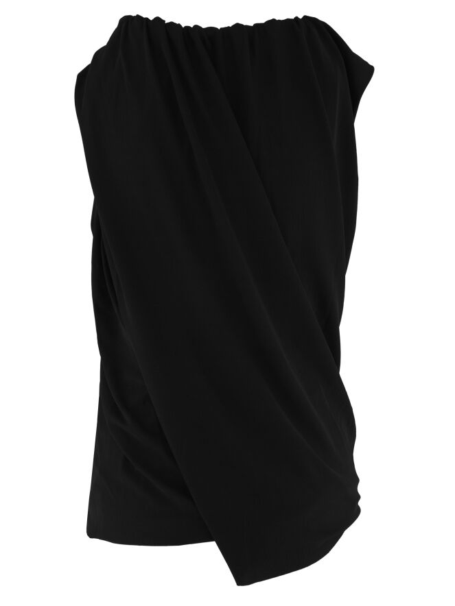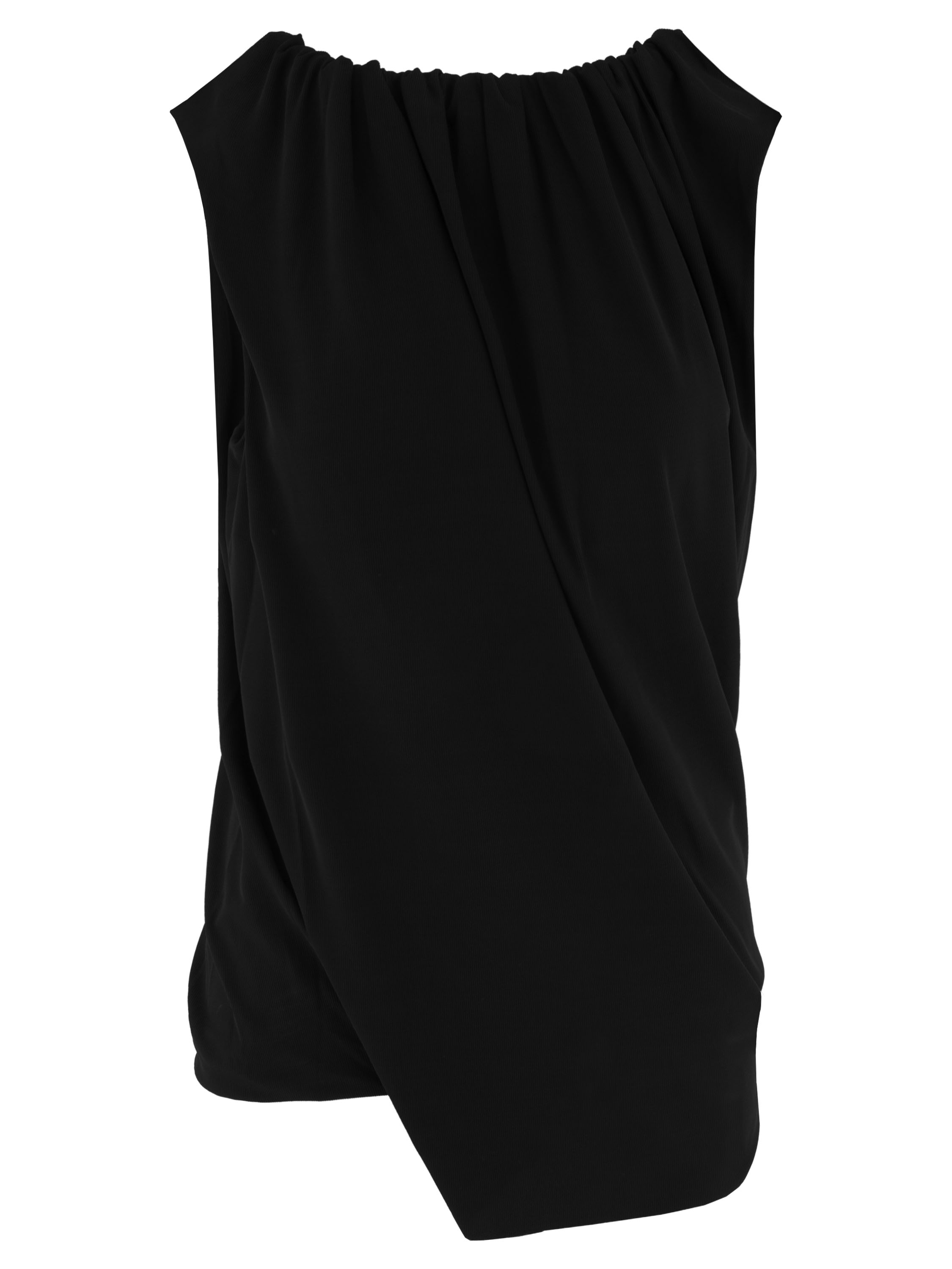 Un top d’Annette Görtz en noir, confectionné dans un tissu finement côtelé. Le modèle est réalisé en double épaisseur avec un effet torsadé, créant une silhouette affinée. Le bord de l’encolure ronde est finement plissé. Ce top peut être lavé à 30 degrés.