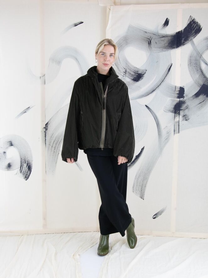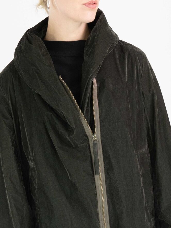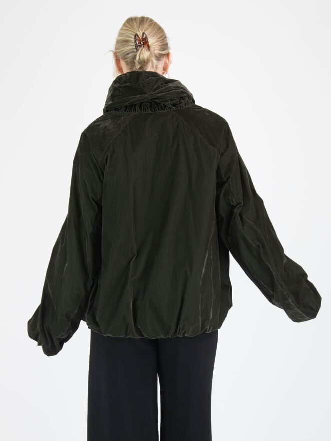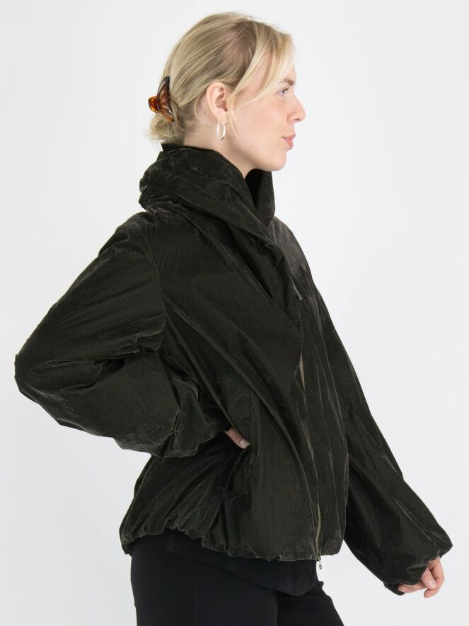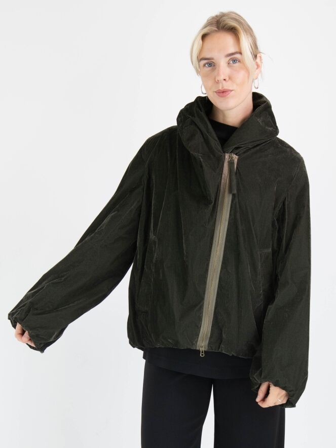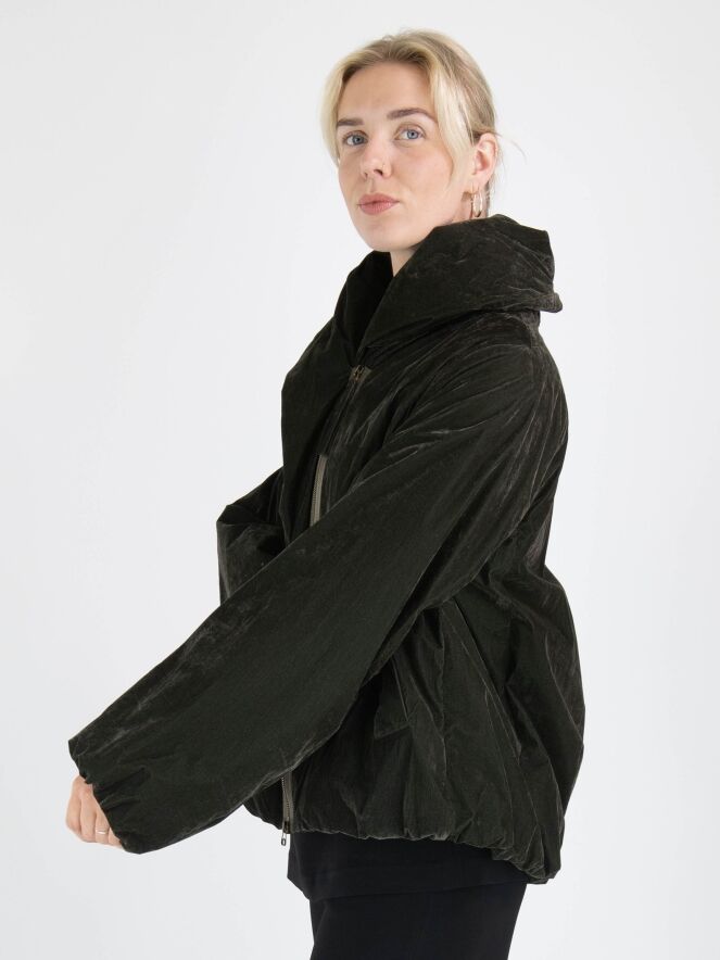 Une doudoune d'Annette Görtz de couleur kaki foncé. La doudoune est en velours léger. Elle possède une fermeture éclair et des poches fendues et ne doit pas être lavée.