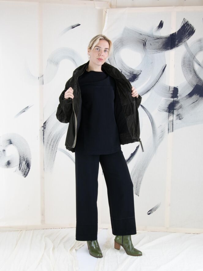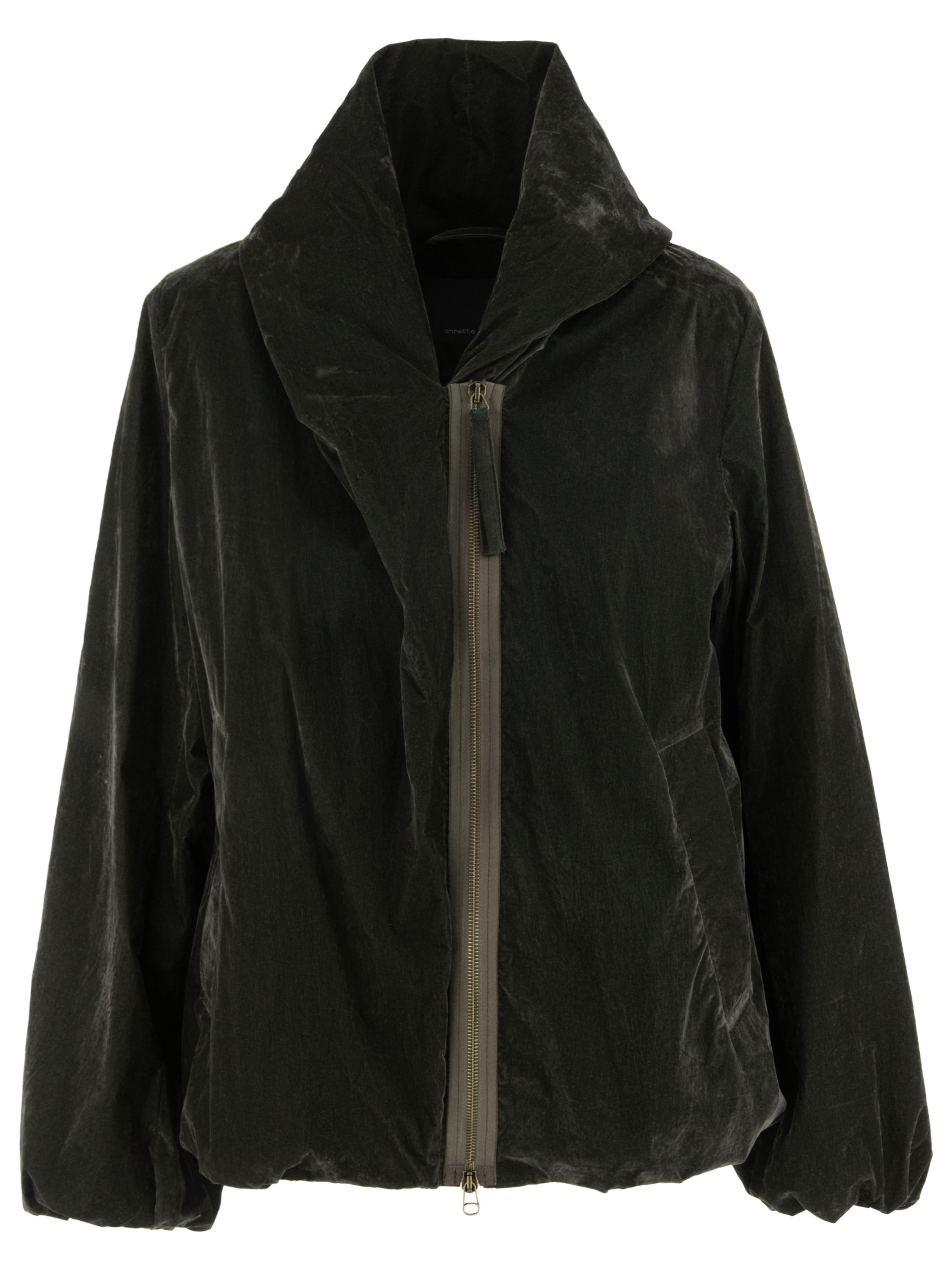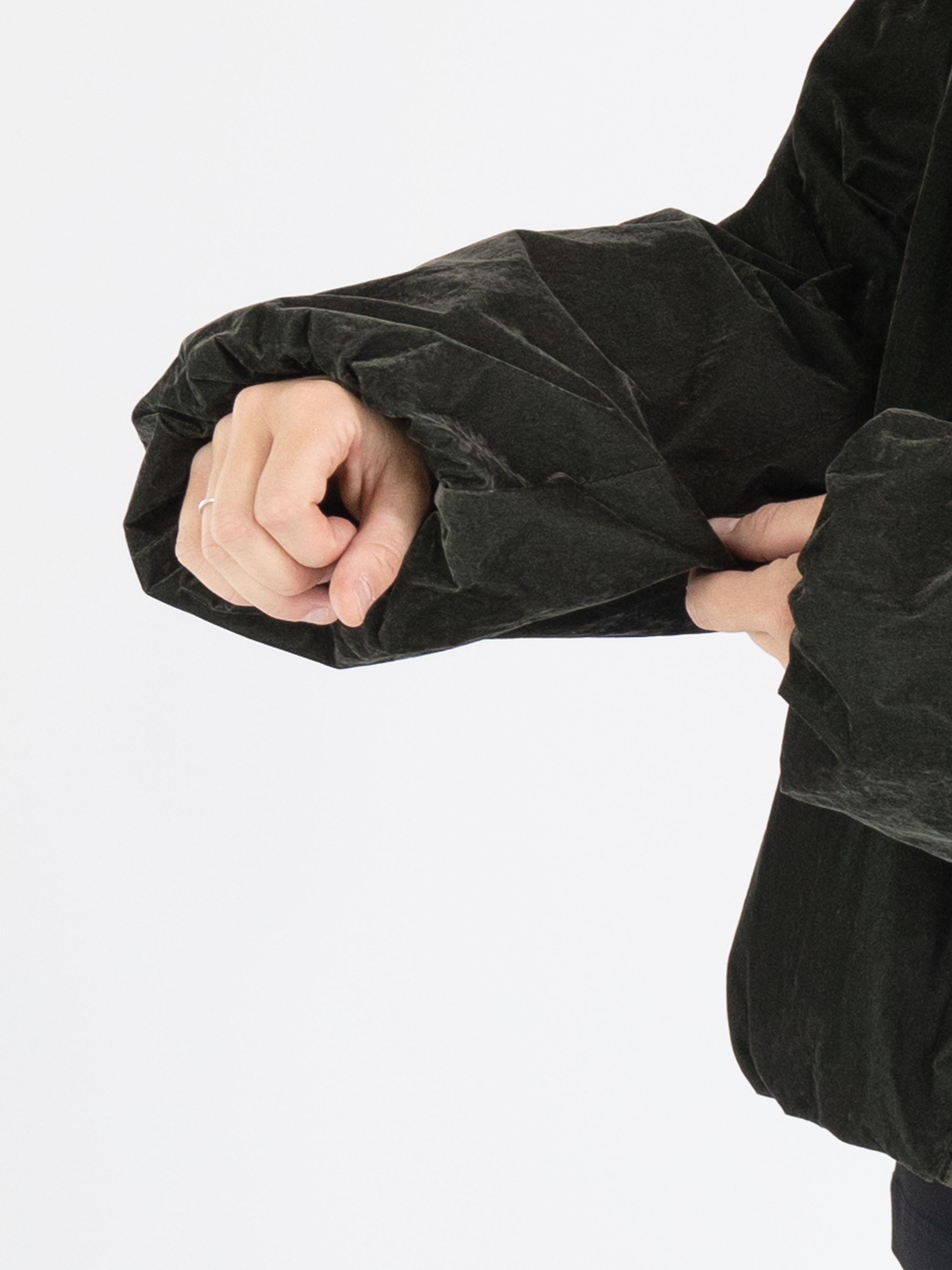 Une doudoune d'Annette Görtz de couleur kaki foncé. La doudoune est en velours léger. Elle possède une fermeture éclair et des poches fendues et ne doit pas être lavée.