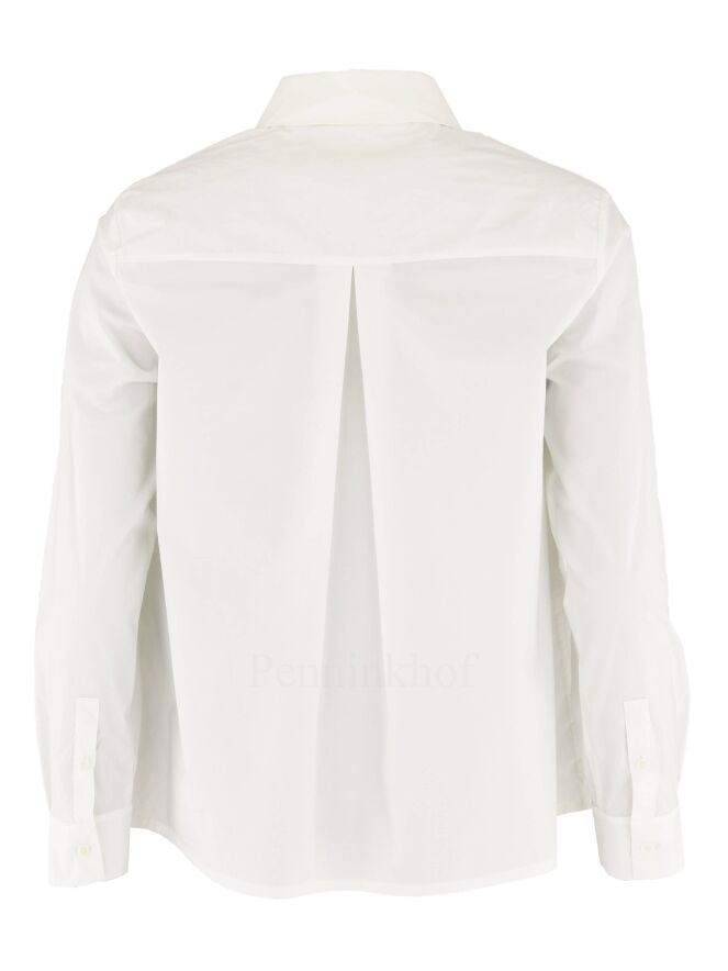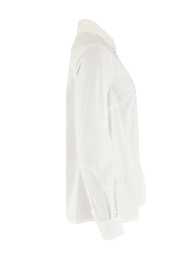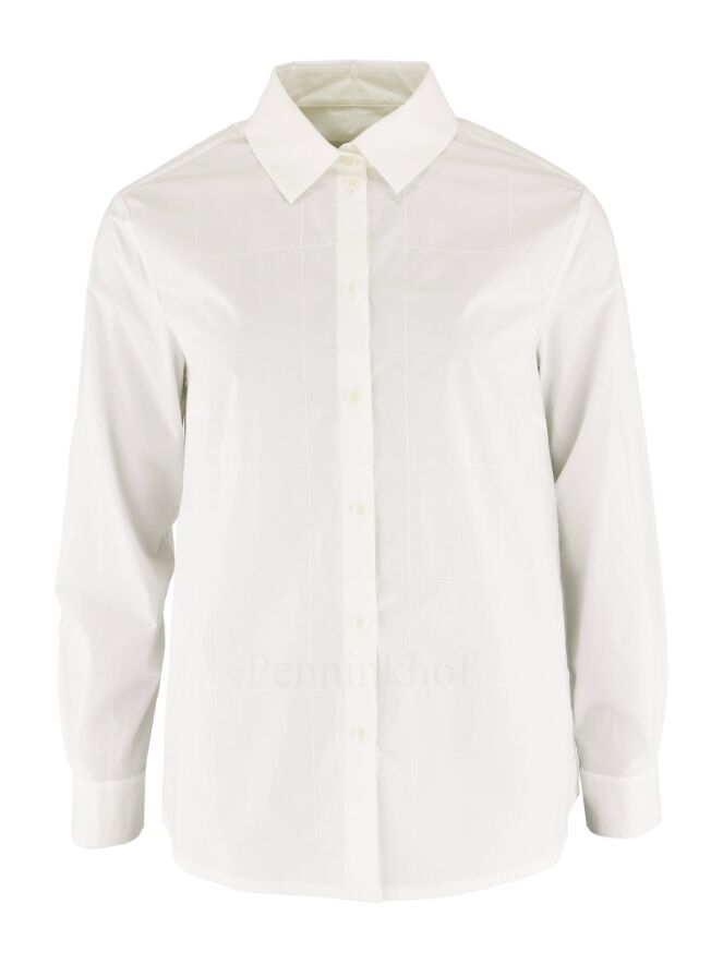 Chemisier ample de la marque Annette Görtz, de couleur blanche. L'avant est orné d'un motif à carreaux créé par de fines coutures en fil blanc. Dans le dos, un pli central s'ouvre à hauteur des épaules en s'évasant vers le bas. Lavage à 30 degrés.