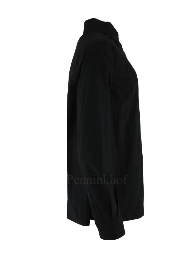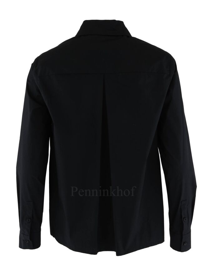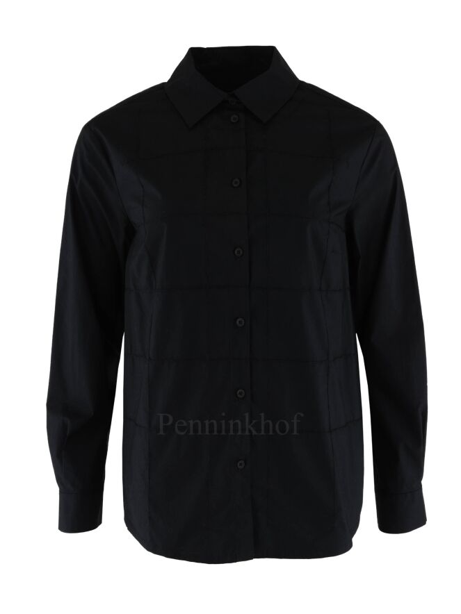 Chemisier ample de la marque Annette Görtz, de couleur noire. L'avant est orné d'un motif à carreaux créé par de fines coutures en fil blanc. Dans le dos, un pli central s'ouvre à hauteur des épaules en s'évasant vers le bas. Lavage à 30 degrés.
